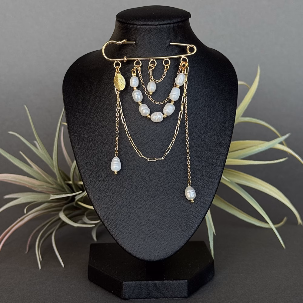 Kihiline pärlipross, mis näeb välja nagu väike kaelakee sinu kudumi, bleiseri või mantli peal. Haaknõela stiilis kullatooni kinnituselt langevad mitu erineva pikkuse ja mustriga ketti, mille keskmes on magevee pärlitest kee ning külgedel rippuvad üksikud pärlitilgakesed. Tulemus on õrn, šikk ja mõnusalt boho – ideaalne detail, kui tahad rõhutada nii naiselikkust kui isikupära.