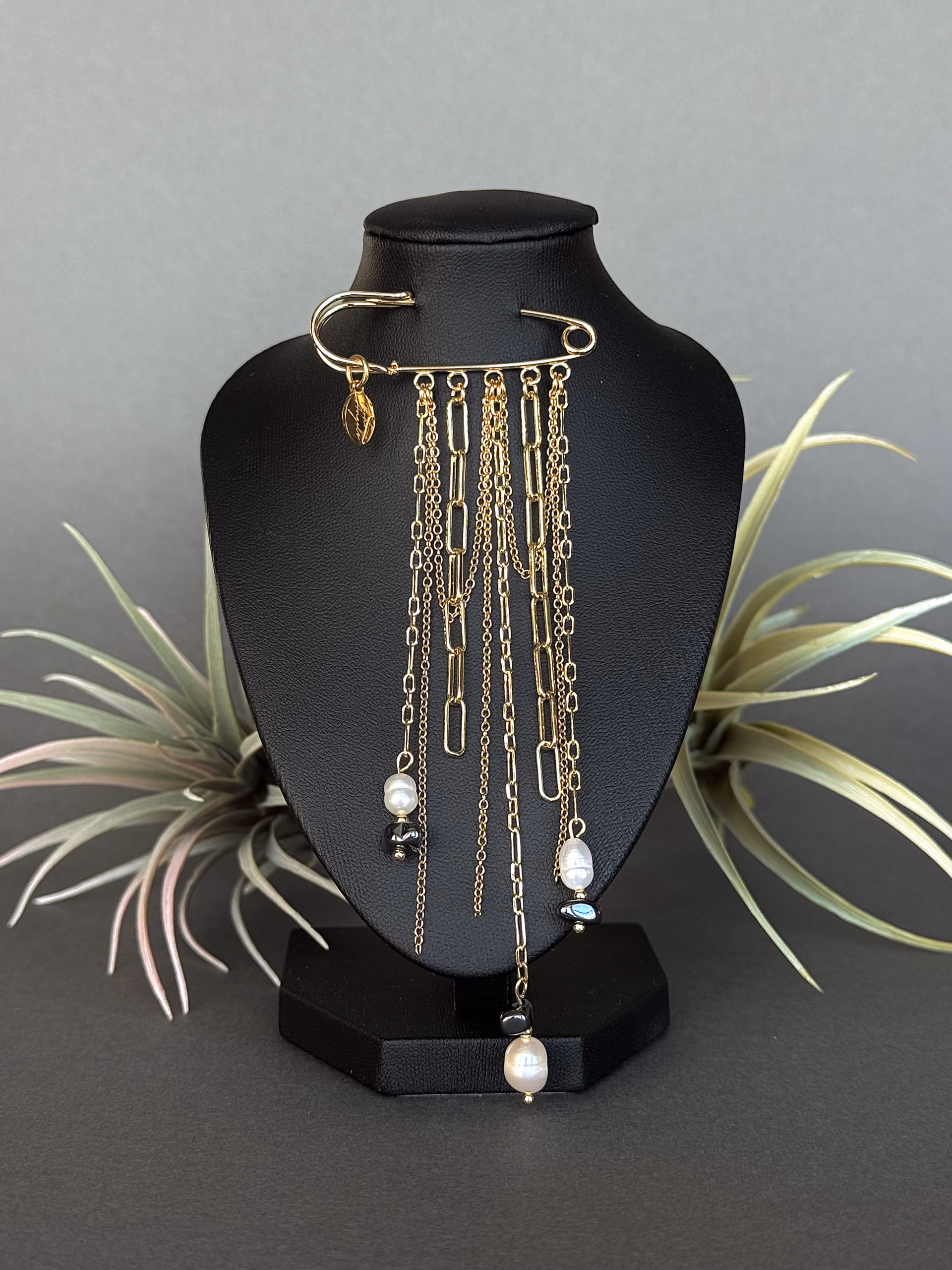 Efektne boho-chic pross, mis muudab iga kudumi, bleiseri või mantli momentaalselt eriliseks. Turvanõela stiilis kinnituselt langevad erineva pikkuse ja mustriga kuldsed ketid, mida kaunistavad magevee pärlid ja tumedad dekoratiivhelmed – iga liigutus paneb prossil kaunilt mängima.