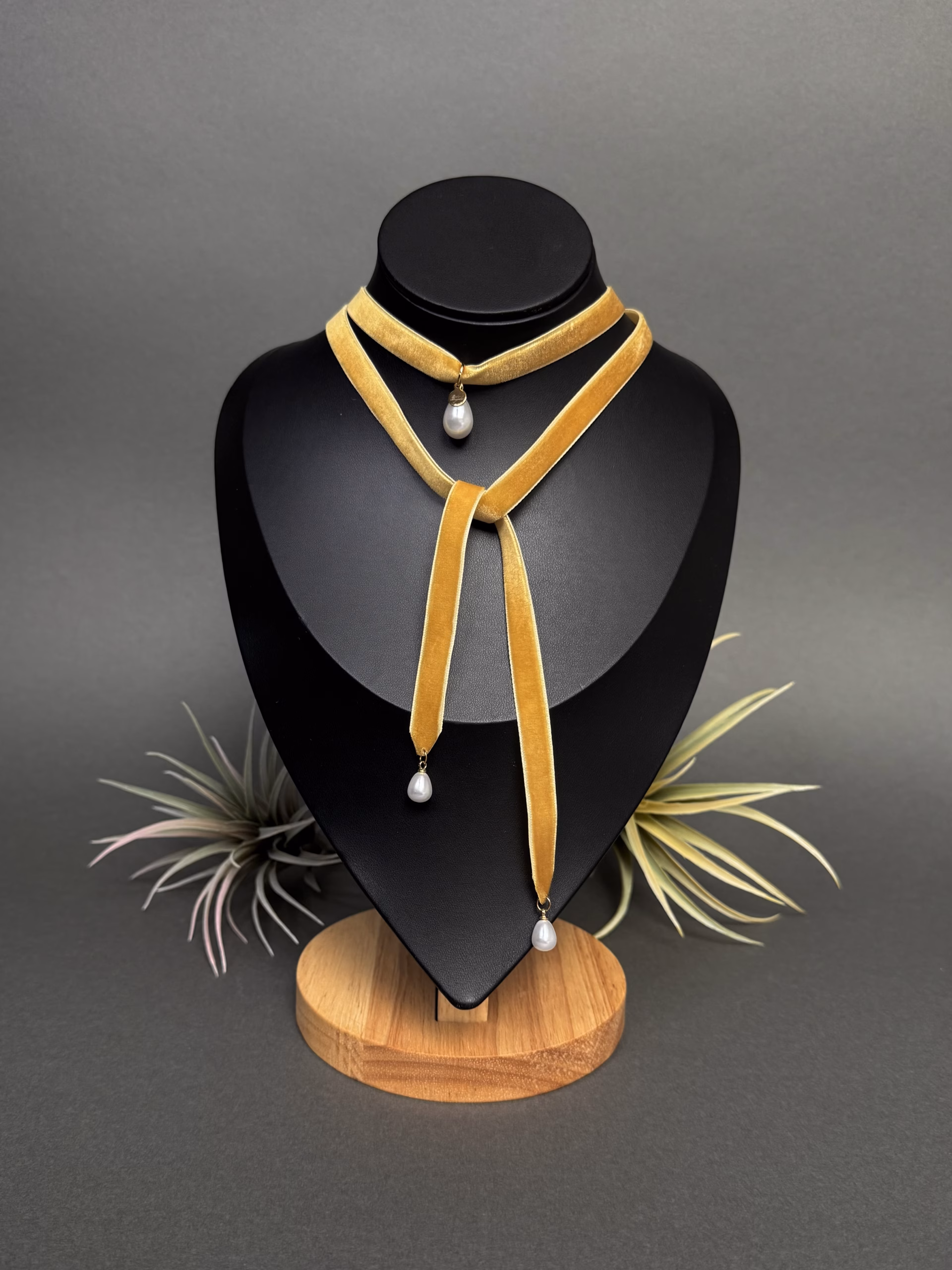 Elegantne sametist choker, mis lisab igale outfitile naiselikku ja ajatult šikki stiili. Tume sametlindiga kaelakee on kaunistatud kolme tilgakujulise kunstpärliga, mis on kinnitatud roostevabast terasest detailidega.