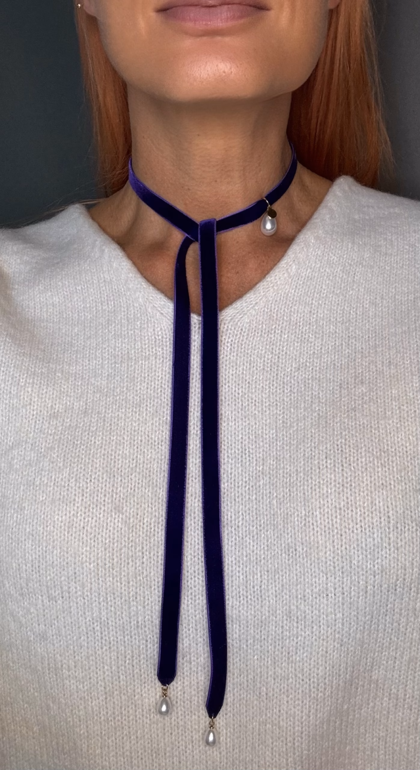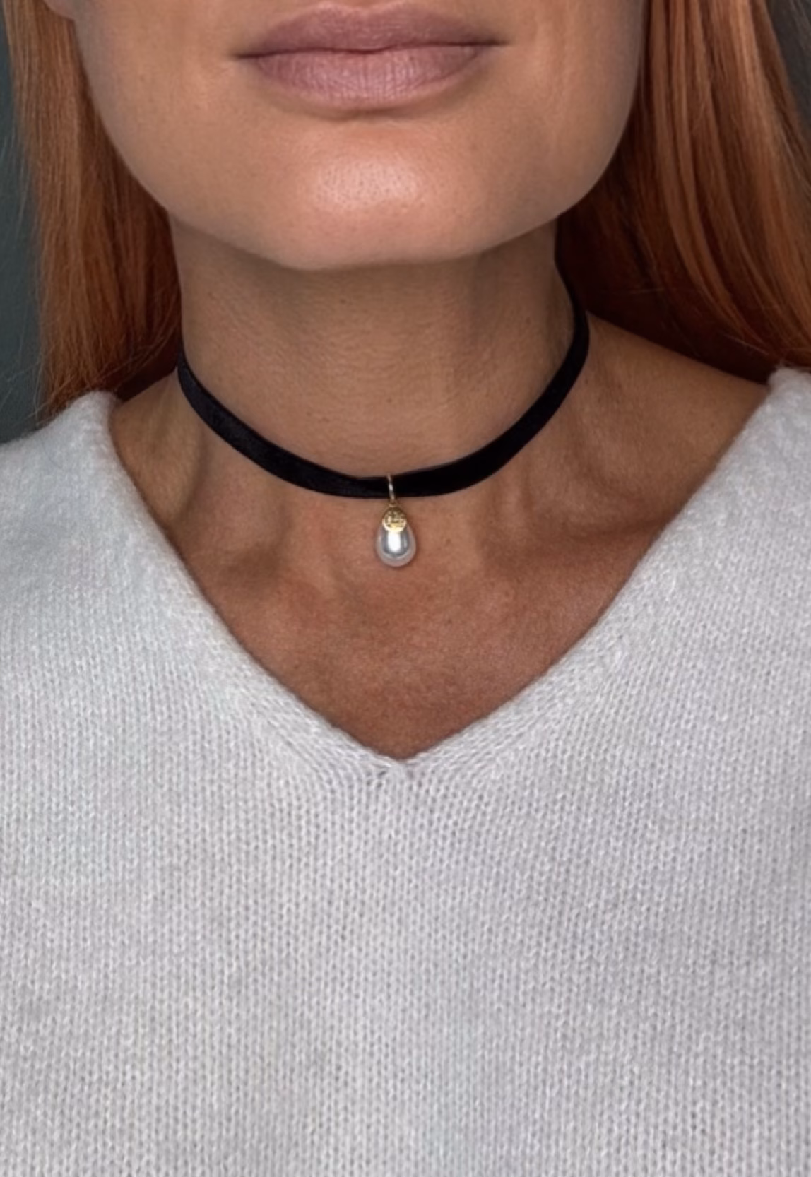 Elegantne sametist choker, mis lisab igale outfitile naiselikku ja ajatult šikki stiili. Tume sametlindiga kaelakee on kaunistatud kolme tilgakujulise kunstpärliga, mis on kinnitatud roostevabast terasest detailidega.