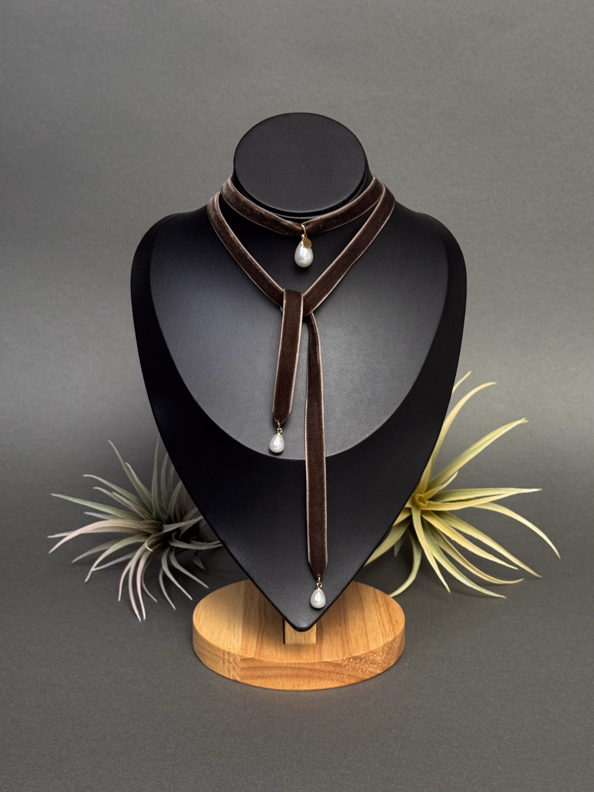 Elegantne sametist choker, mis lisab igale outfitile naiselikku ja ajatult šikki stiili. Tume sametlindiga kaelakee on kaunistatud kolme tilgakujulise kunstpärliga, mis on kinnitatud roostevabast terasest detailidega.