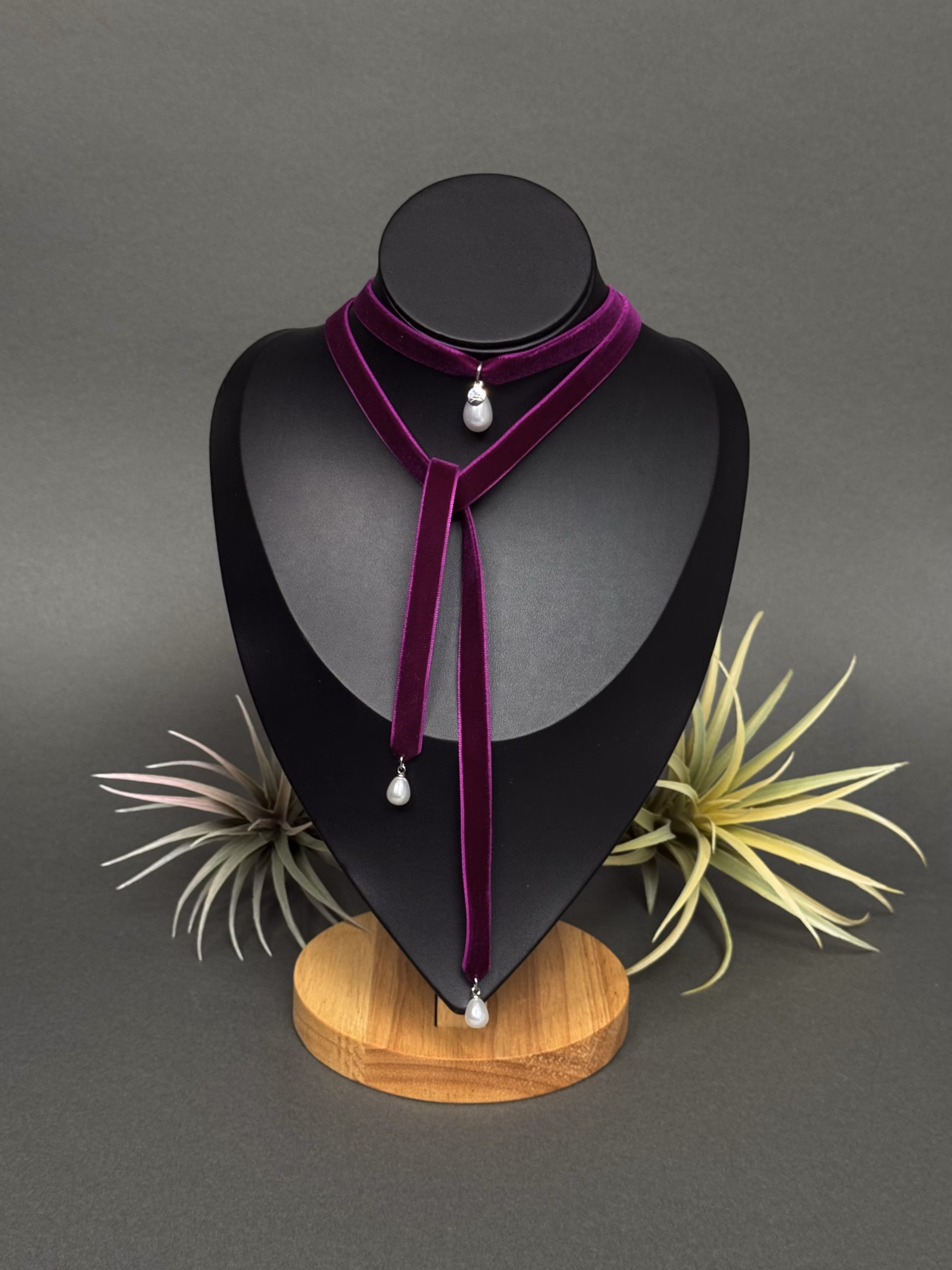 Elegantne sametist choker, mis lisab igale outfitile naiselikku ja ajatult šikki stiili. Tume sametlindiga kaelakee on kaunistatud kolme tilgakujulise kunstpärliga, mis on kinnitatud roostevabast terasest detailidega.