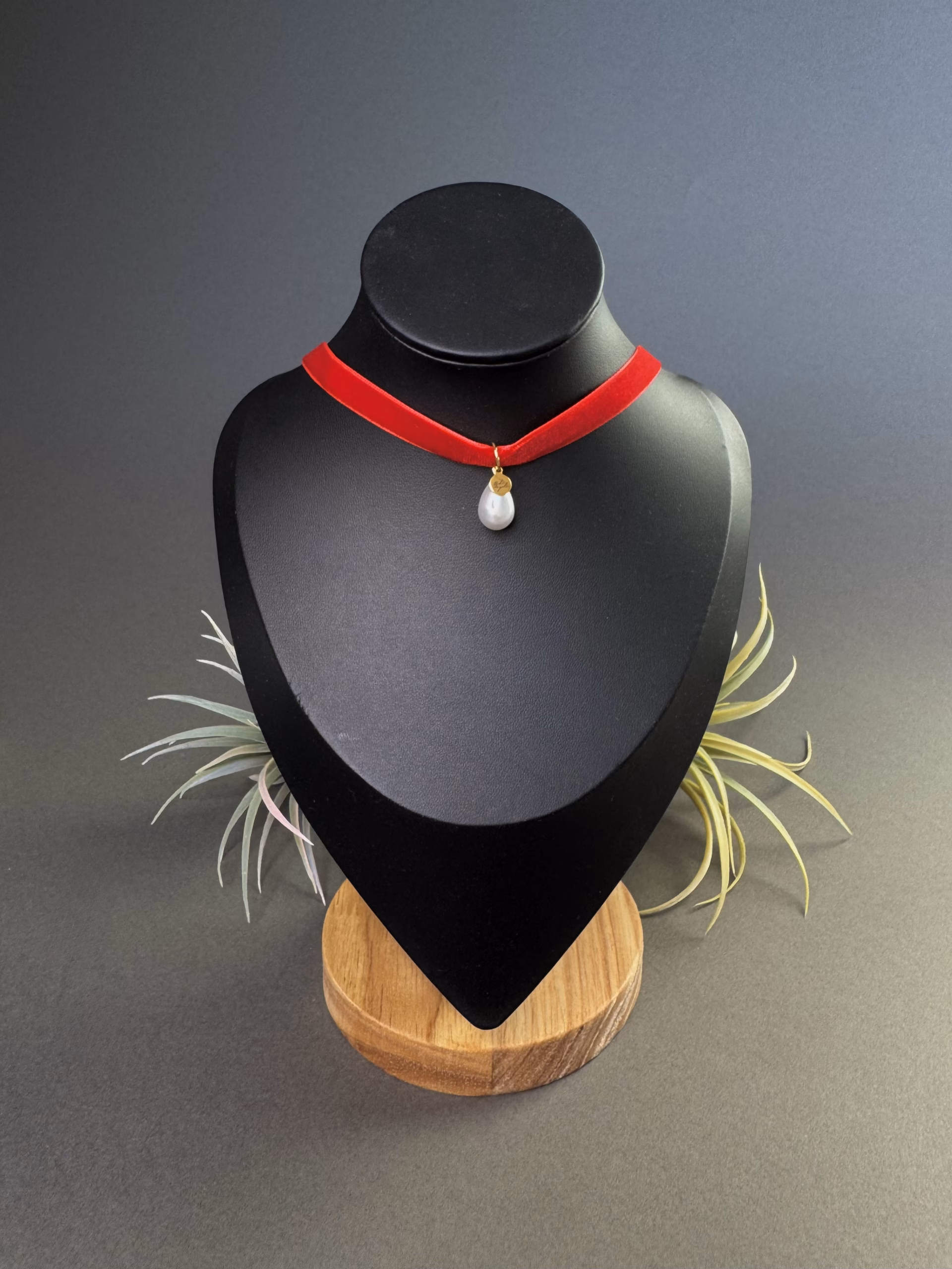 Elegantne sametist choker, mis lisab igale outfitile naiselikku ja ajatult šikki stiili. Tume sametlindiga kaelakee on kaunistatud kolme tilgakujulise kunstpärliga, mis on kinnitatud roostevabast terasest detailidega.