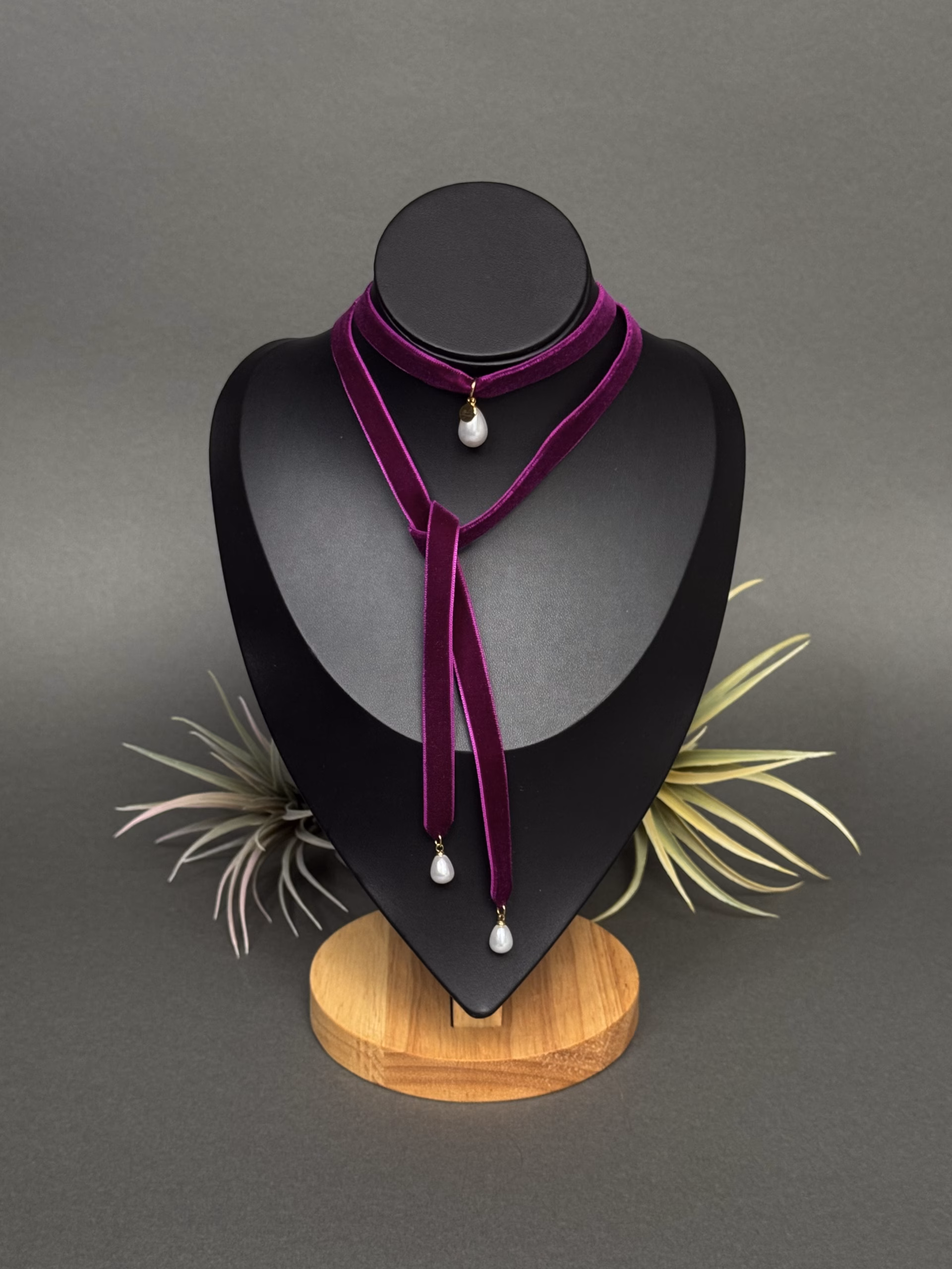 Elegantne sametist choker, mis lisab igale outfitile naiselikku ja ajatult šikki stiili. Tume sametlindiga kaelakee on kaunistatud kolme tilgakujulise kunstpärliga, mis on kinnitatud roostevabast terasest detailidega.