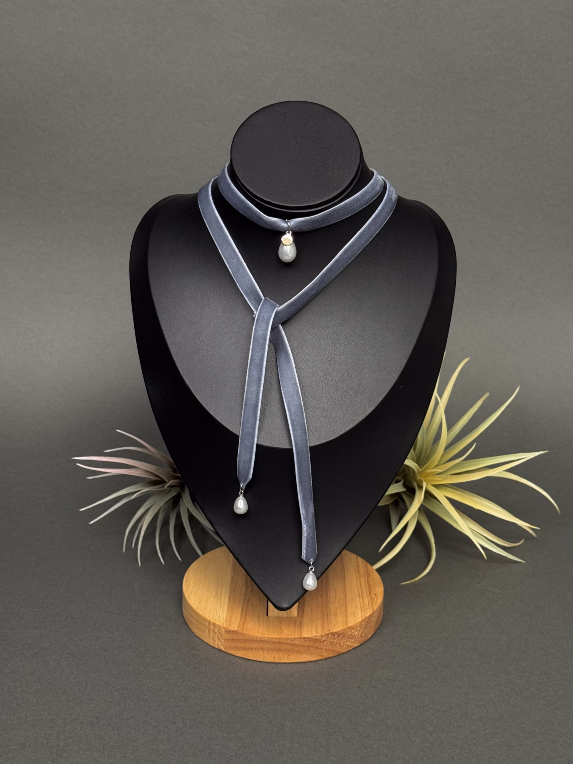 Elegantne sametist choker, mis lisab igale outfitile naiselikku ja ajatult šikki stiili. Tume sametlindiga kaelakee on kaunistatud kolme tilgakujulise kunstpärliga, mis on kinnitatud roostevabast terasest detailidega.