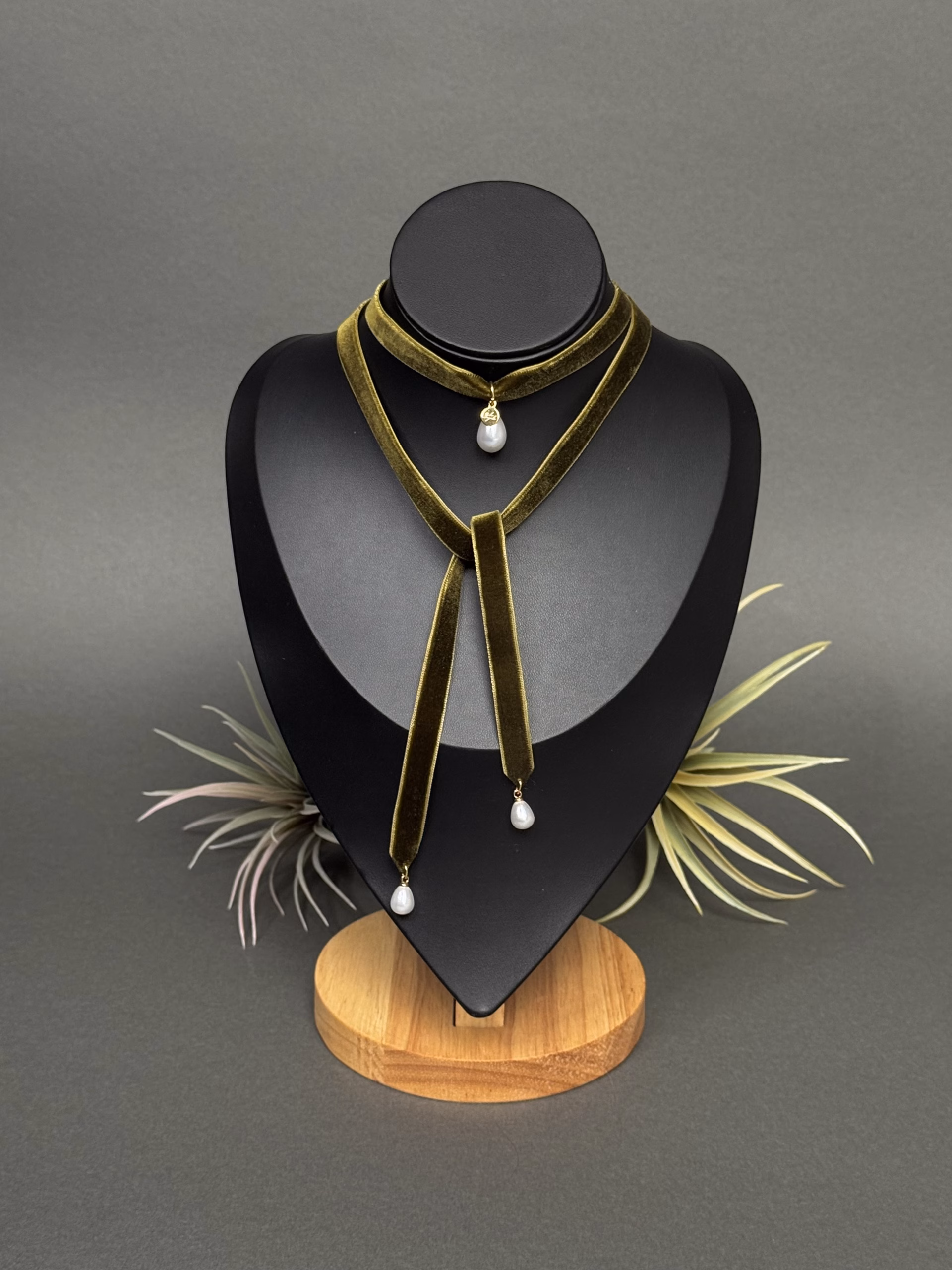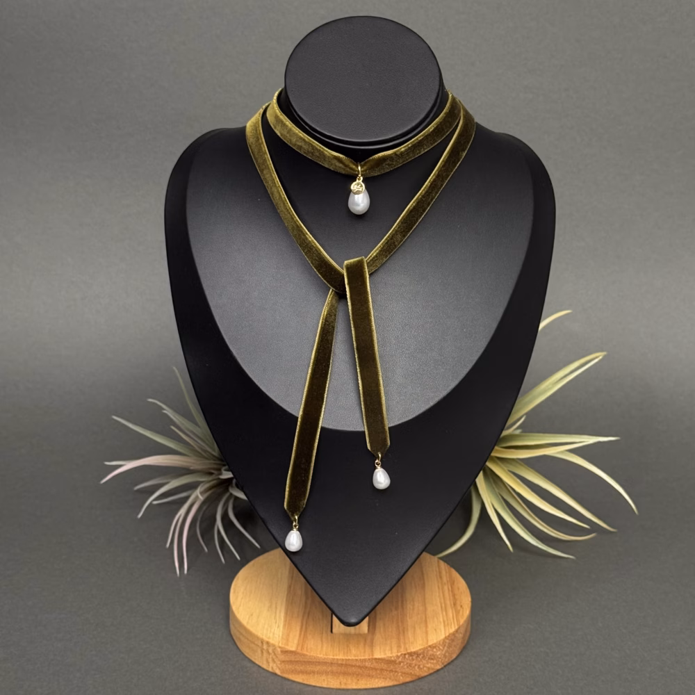 Elegantne sametist choker, mis lisab igale outfitile naiselikku ja ajatult šikki stiili. Tume sametlindiga kaelakee on kaunistatud kolme tilgakujulise kunstpärliga, mis on kinnitatud roostevabast terasest detailidega.