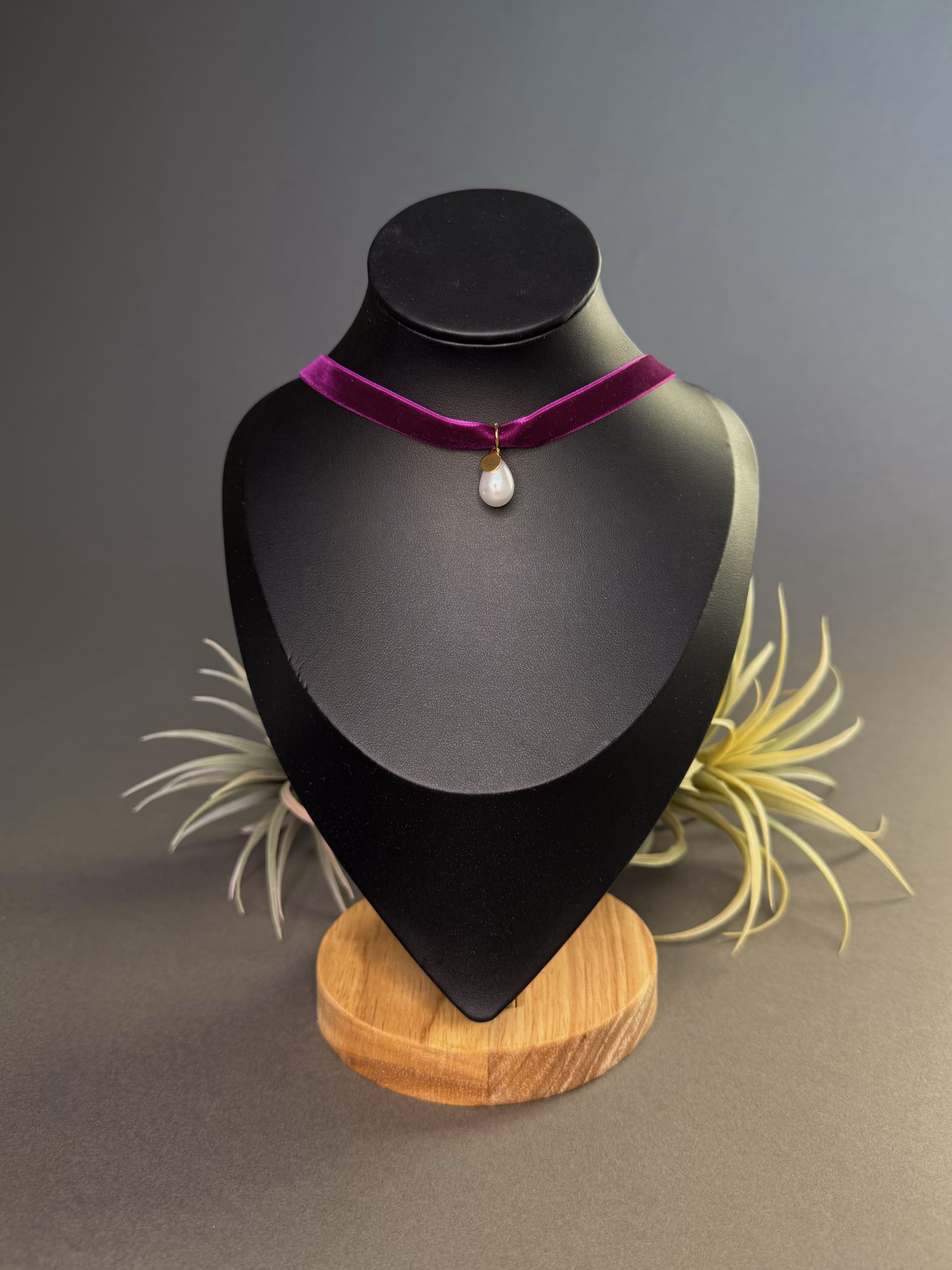 Elegantne sametist choker, mis lisab igale outfitile naiselikku ja ajatult šikki stiili. Tume sametlindiga kaelakee on kaunistatud tilgakujulise kunstpärliga, mis on kinnitatud roostevabast terasest detailidega.