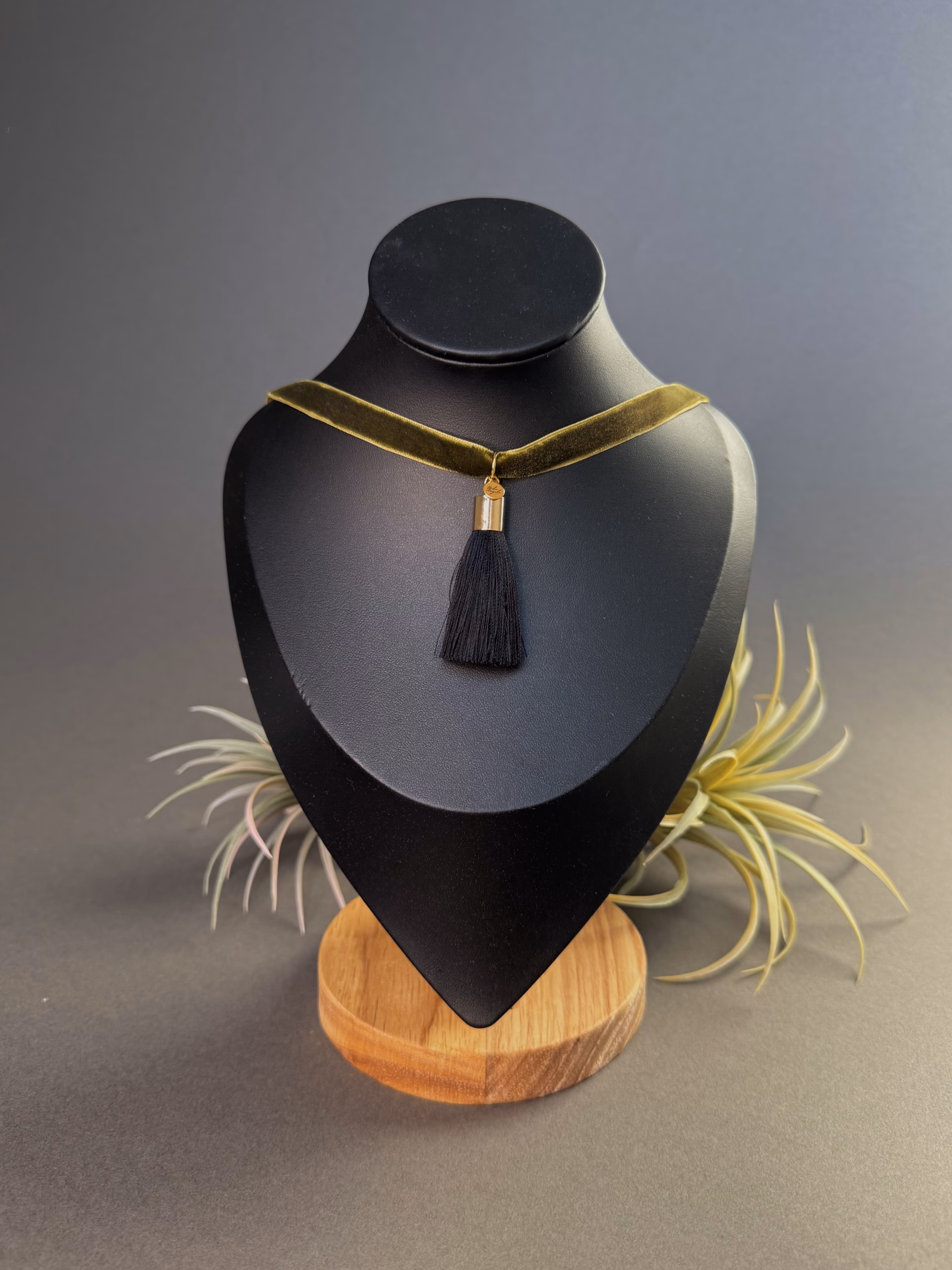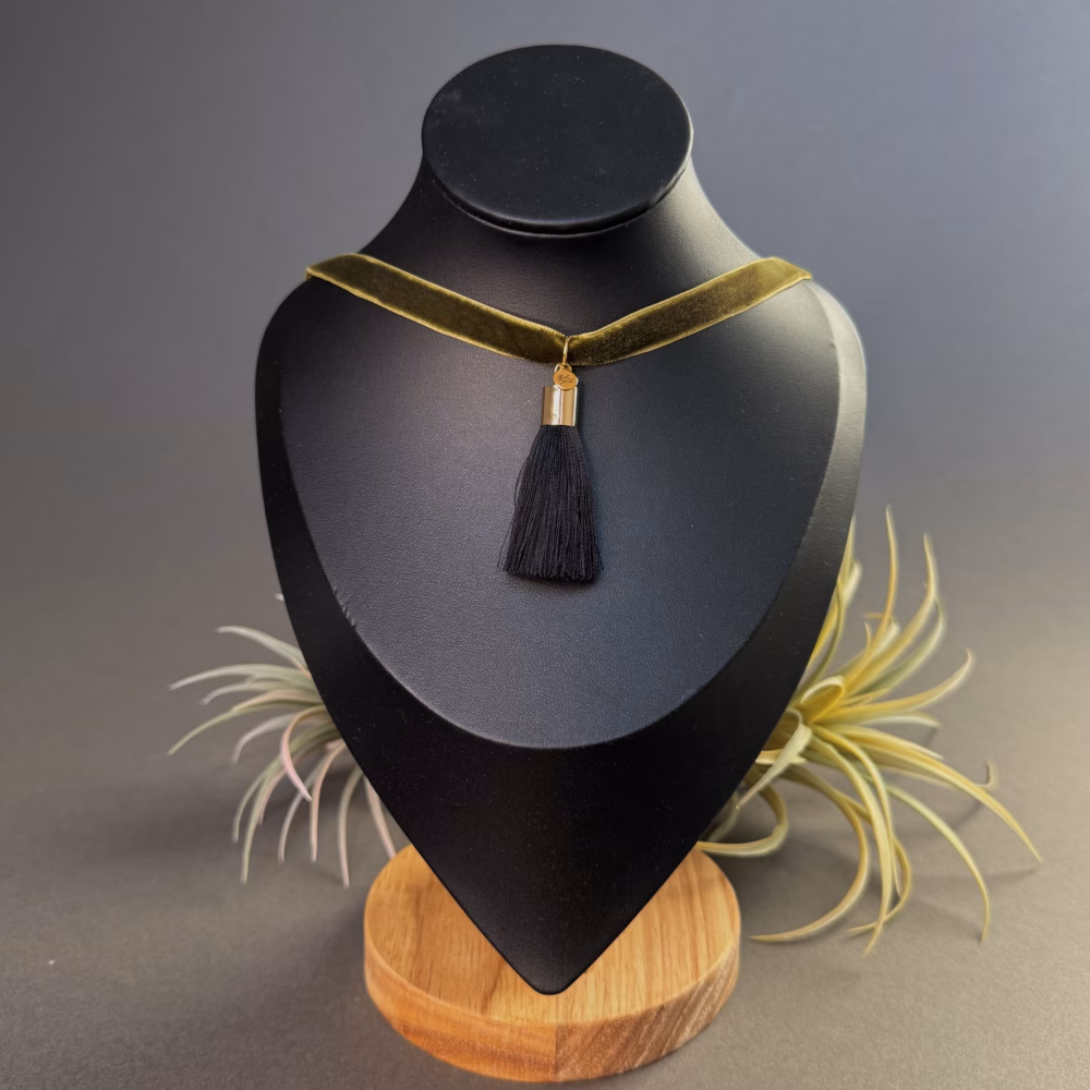 Elegantne sametist choker, mis lisab igale outfitile naiselikku ja ajatult šikki stiili. Tume sametlindiga kaelakee on kaunistatud kolme tilgakujulise kunstpärliga, mis on kinnitatud roostevabast terasest detailidega.