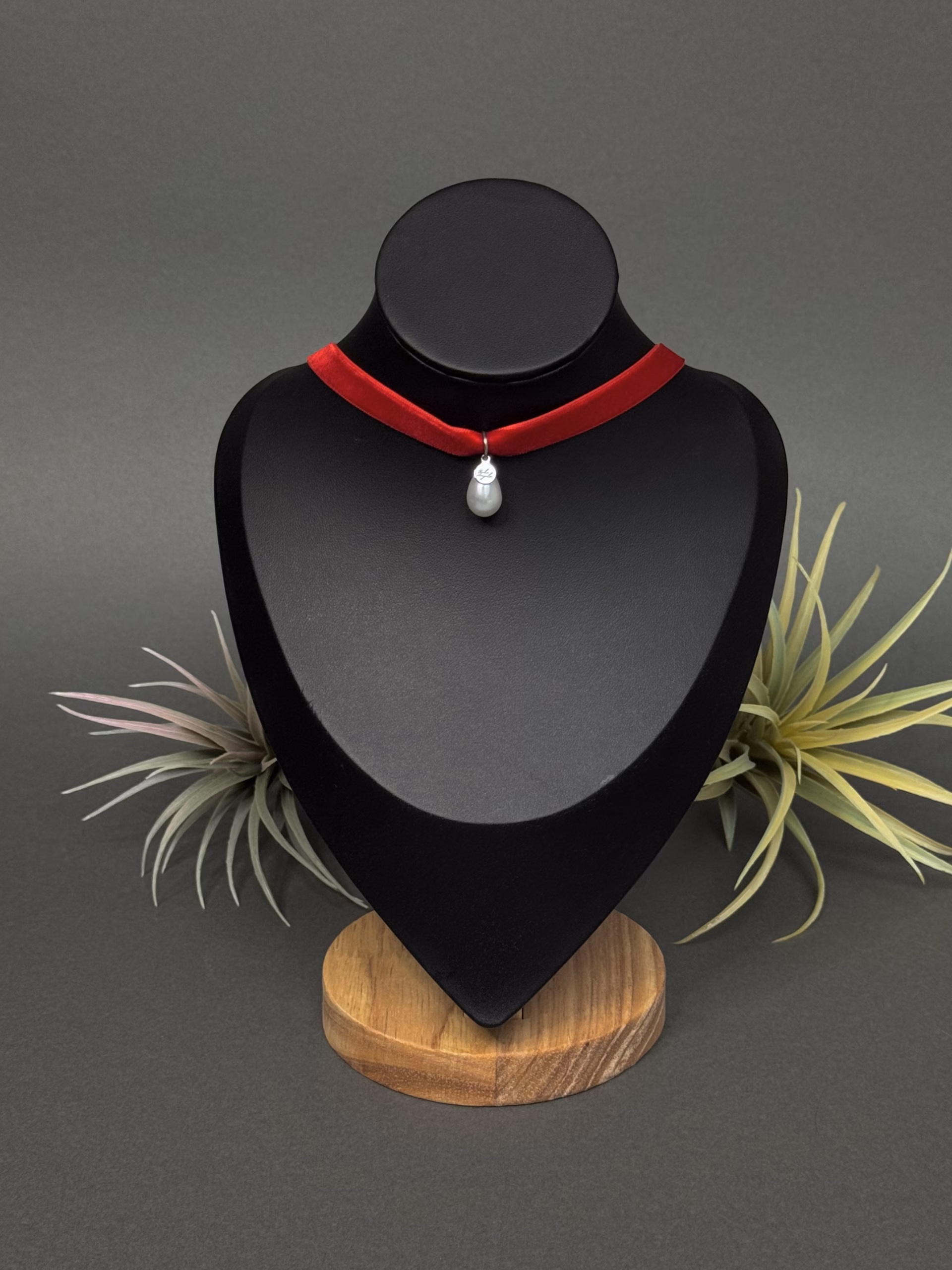 Elegantne sametist choker, mis lisab igale outfitile naiselikku ja ajatult šikki stiili. Tume sametlindiga kaelakee on kaunistatud kolme tilgakujulise kunstpärliga, mis on kinnitatud roostevabast terasest detailidega.