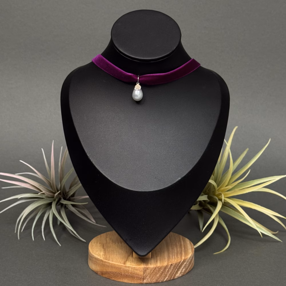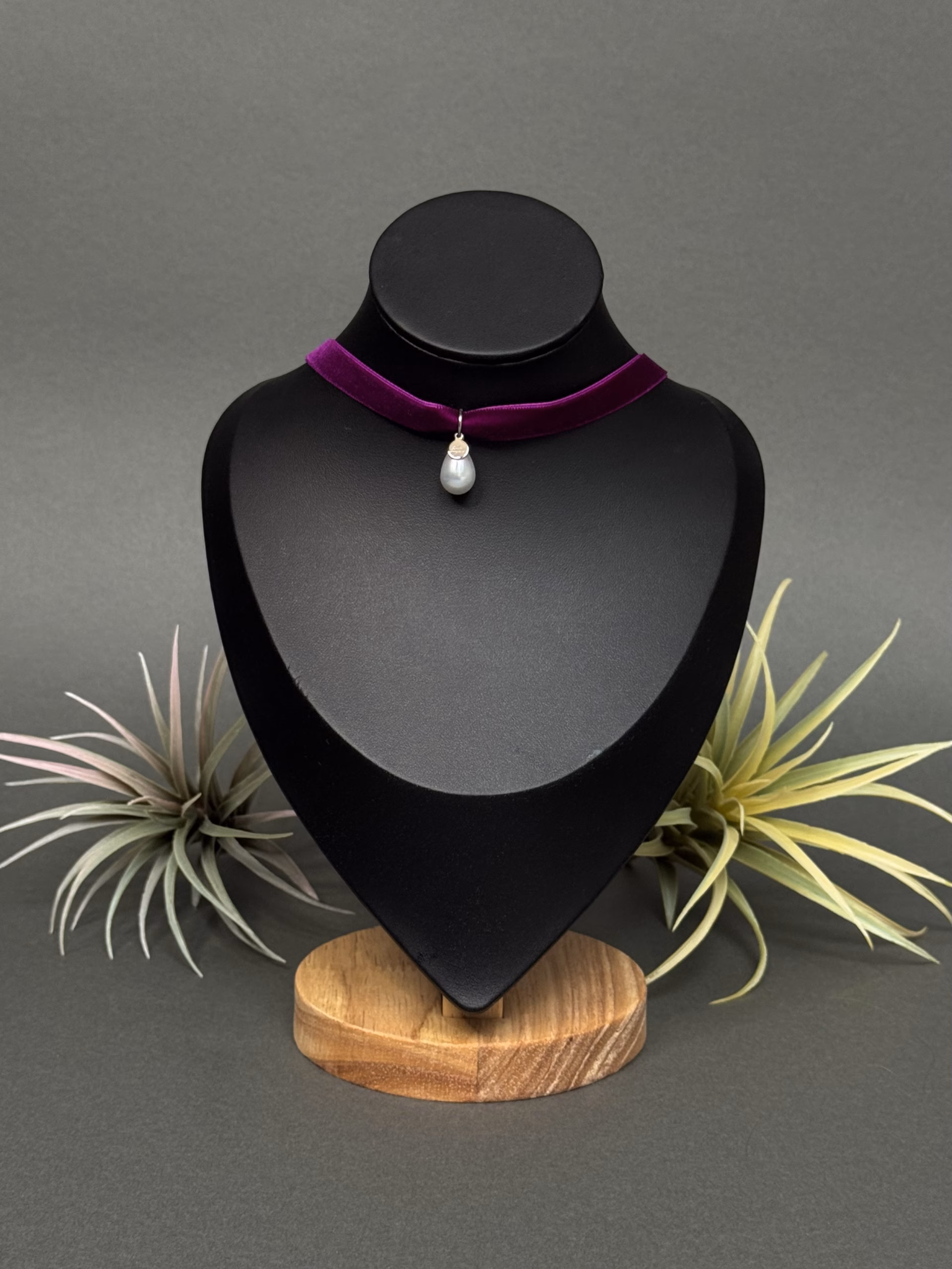 Elegantne sametist choker, mis lisab igale outfitile naiselikku ja ajatult šikki stiili. Tume sametlindiga kaelakee on kaunistatud tilgakujulise kunstpärliga, mis on kinnitatud roostevabast terasest detailidega.