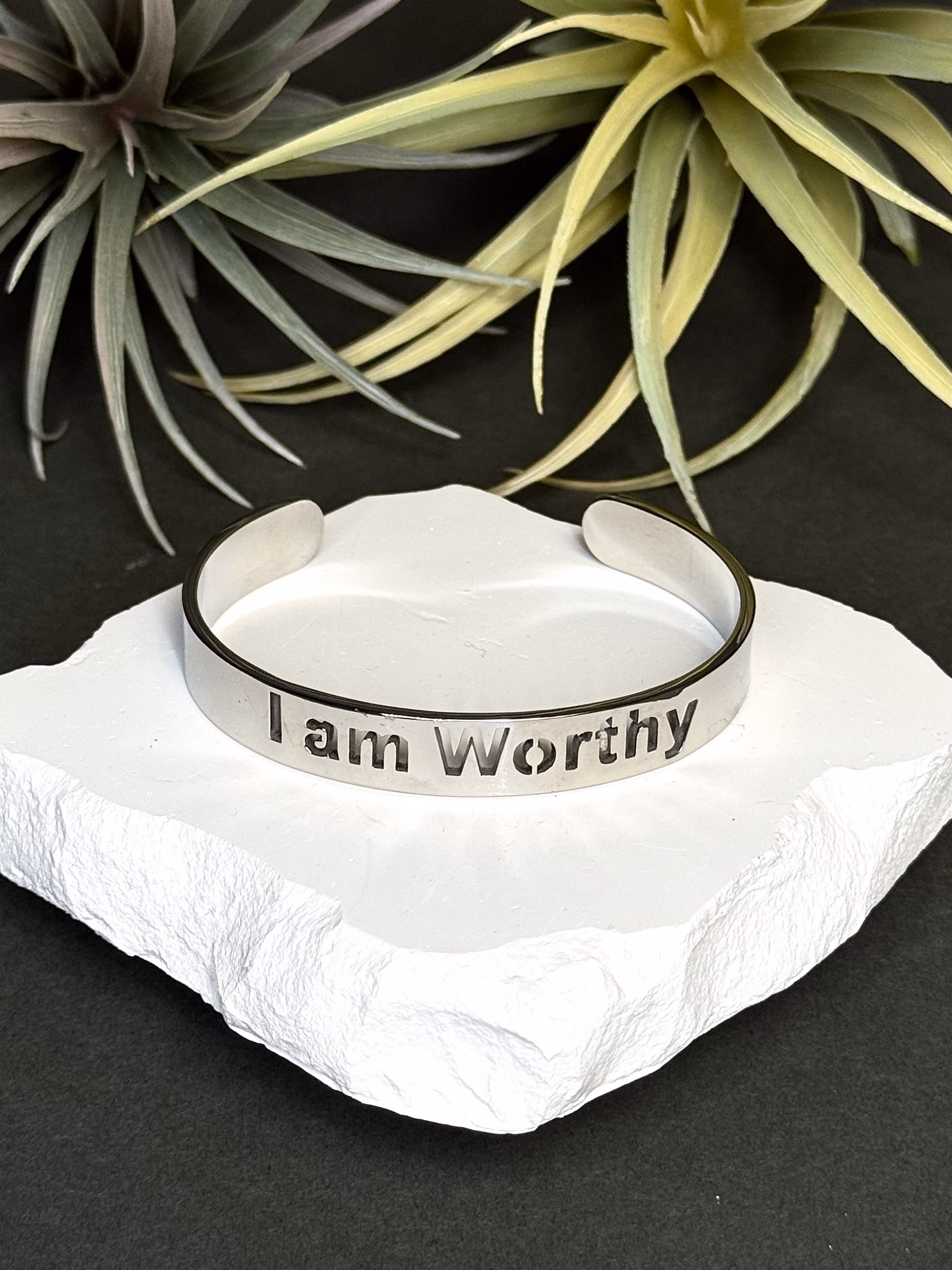 Hõbedasest roostevabast terasest käevõru, mis sosistab sulle iga pilguga randmele: “I am Worthy”. Väike, aga tugev meeldetuletus, et oled väärt kõike head – armastust, puhkust, hellust ja unistusi, mida kannad endas.