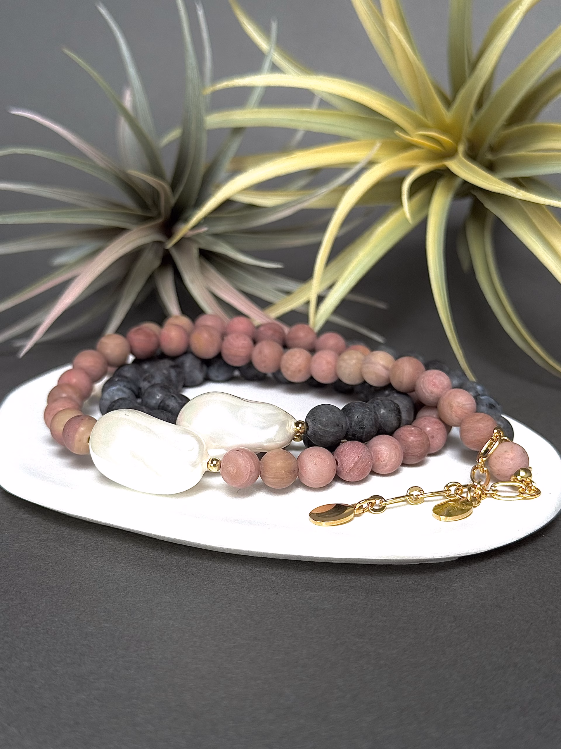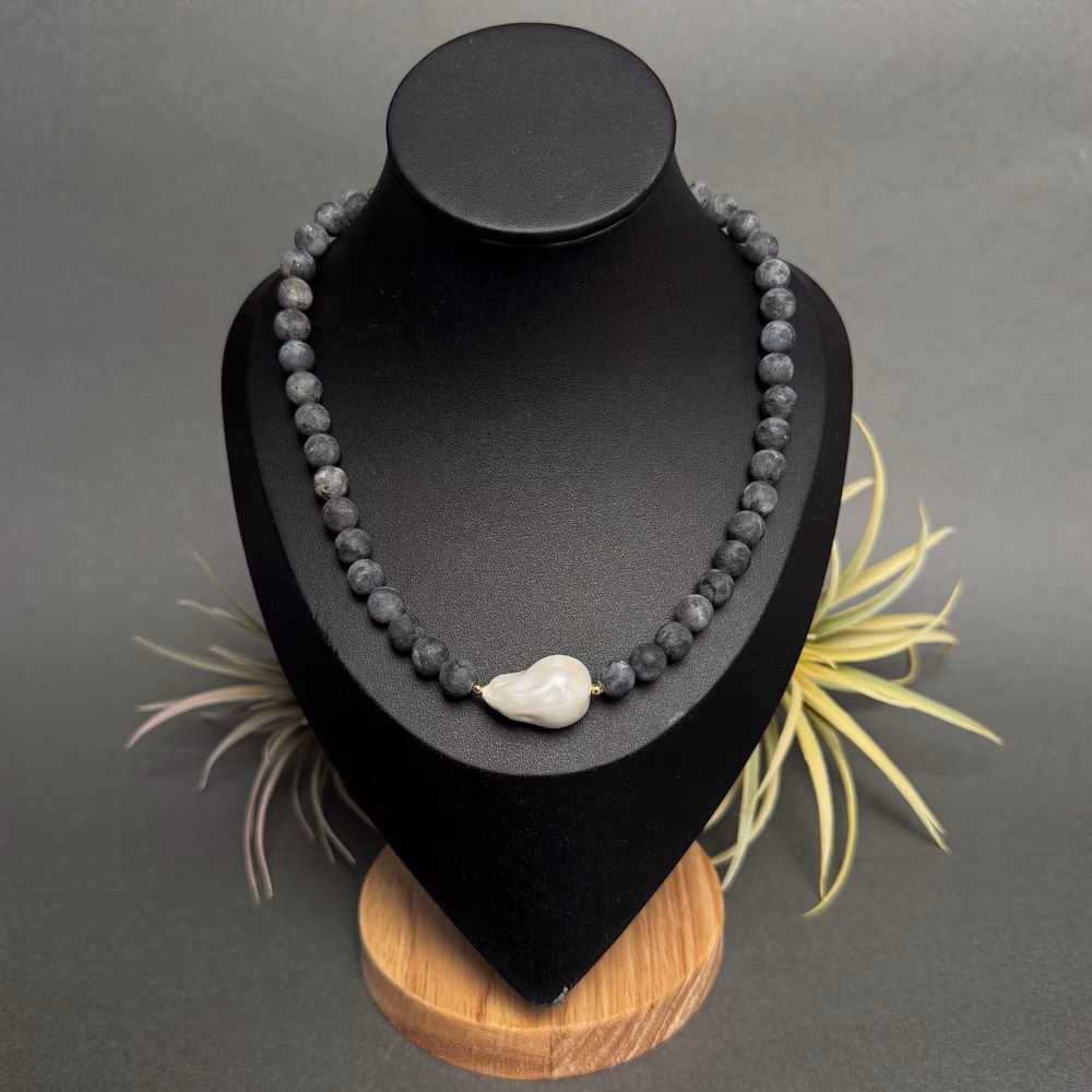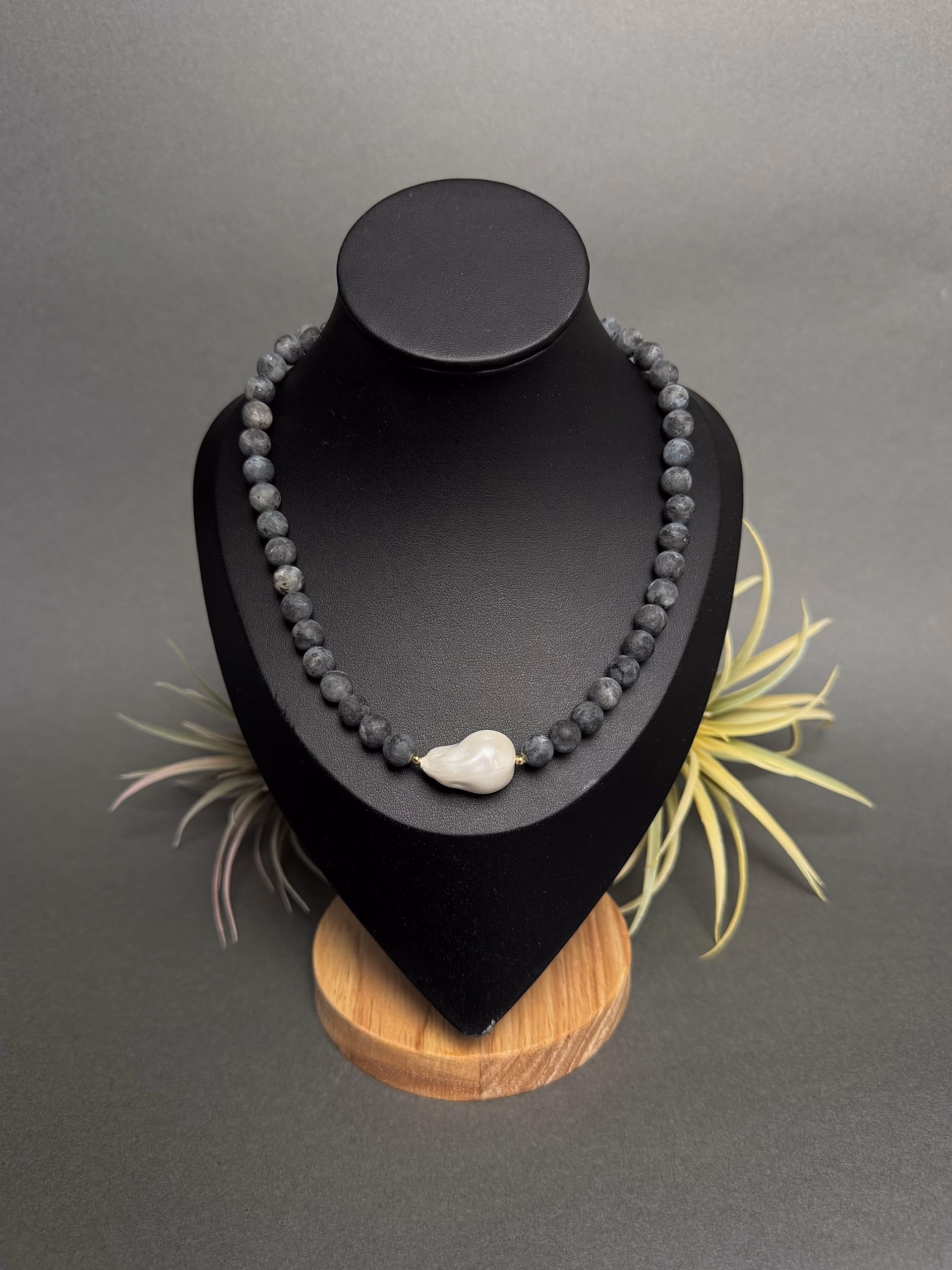 Elegantne hallides toonides kaelakee, mille keskmes on ehtne barokkpärl. Mattja mustriga hallid helmed loovad rahuliku ja modernse ilme, samal ajal kui pärli loomulik ebakorrapärane vorm lisab ehtesse pehmust, luksuslikkust ja kordumatut ilu. Tulemuseks on ehe, mis sobib kaunilt nii igapäevaseks kandmiseks kui pidulikumaks hetkeks.