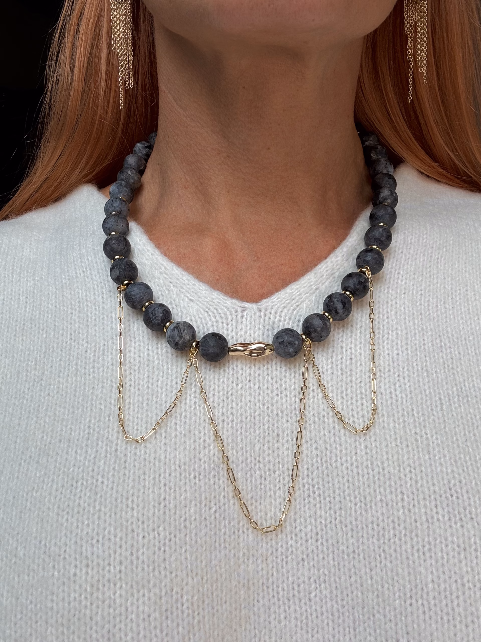 Kaelakee koosneb tumehallidest mattidest helmestes, mida kaunistab üle kullatud kuldne kett.