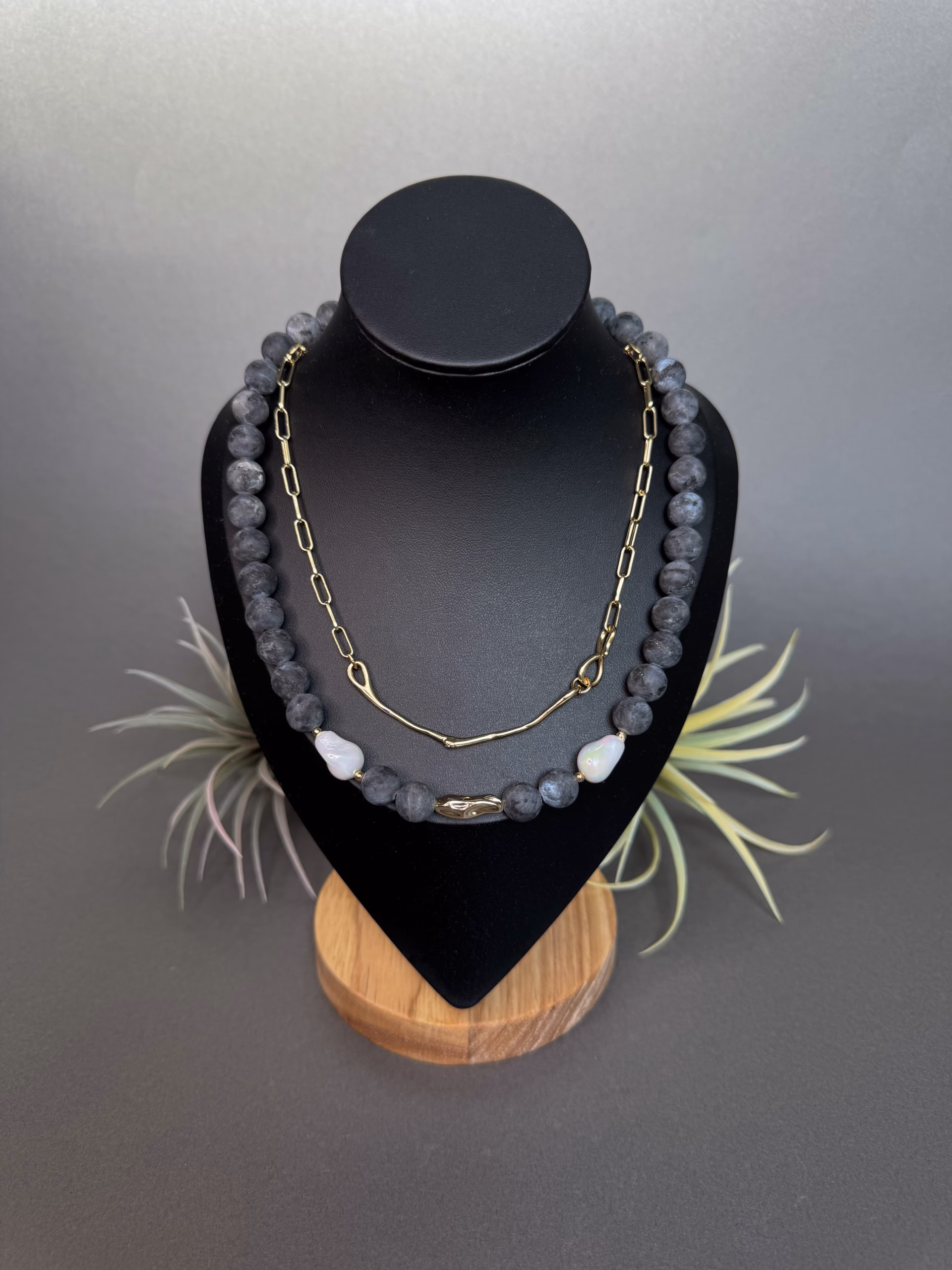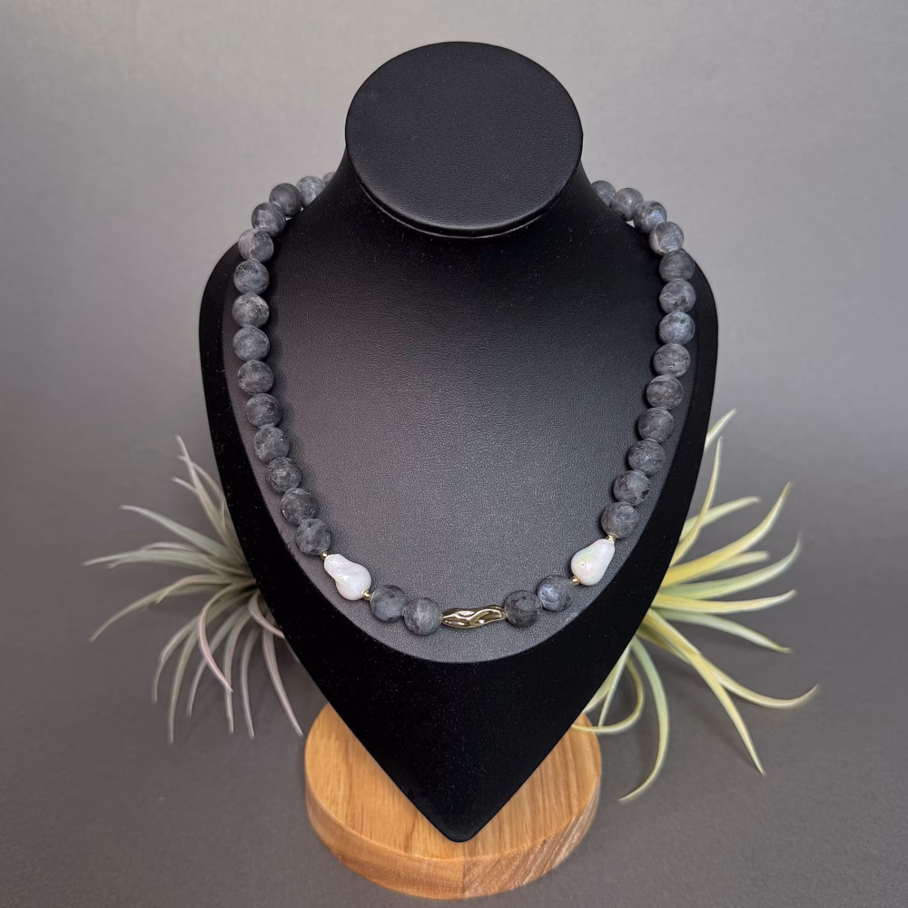 Kaelakee koosneb tumehallidest mattidest helmestest, mida täiendavad ebakorrapärased pärlmuttervalged mageveepärlid ning kuldne kett.