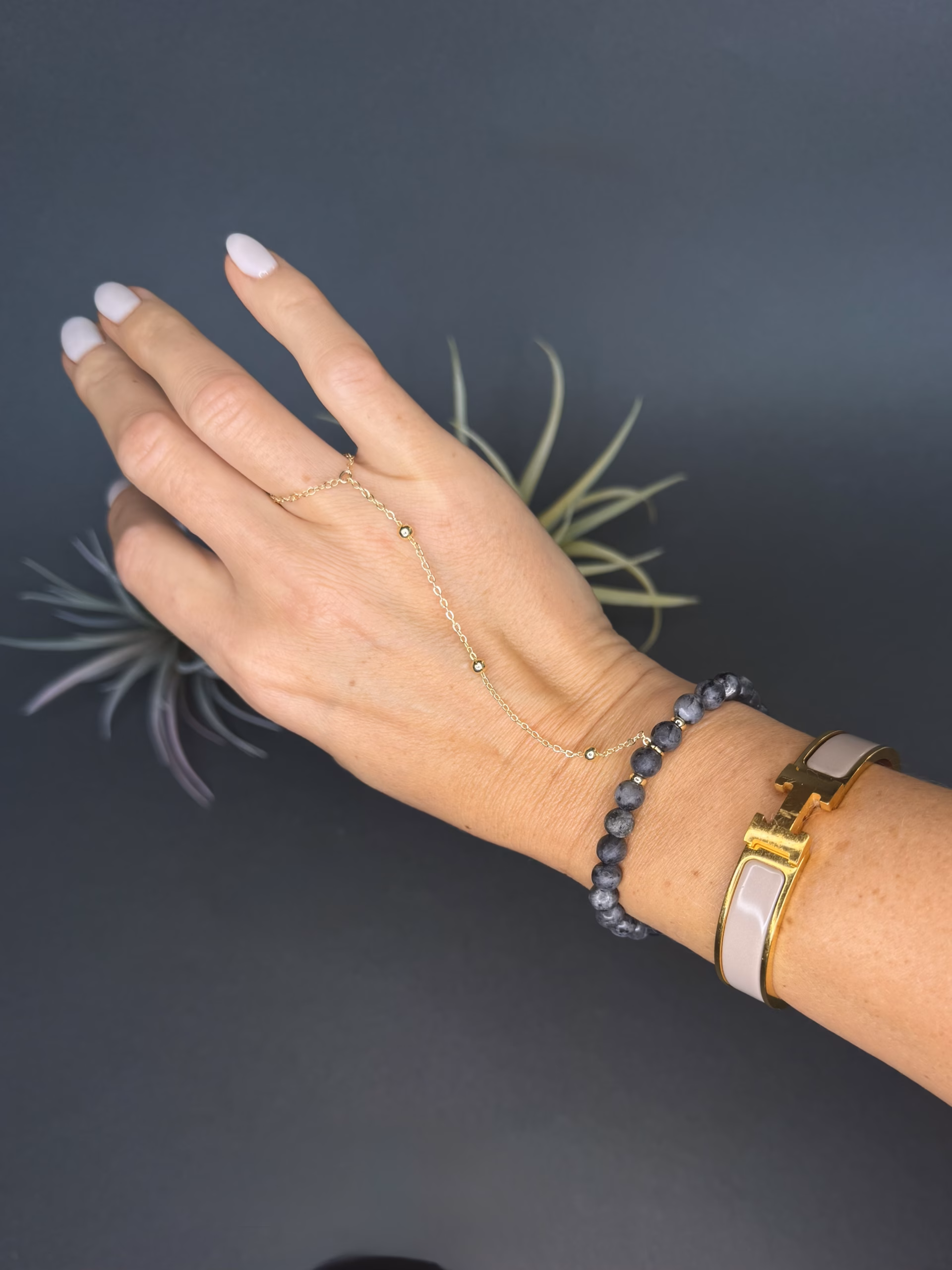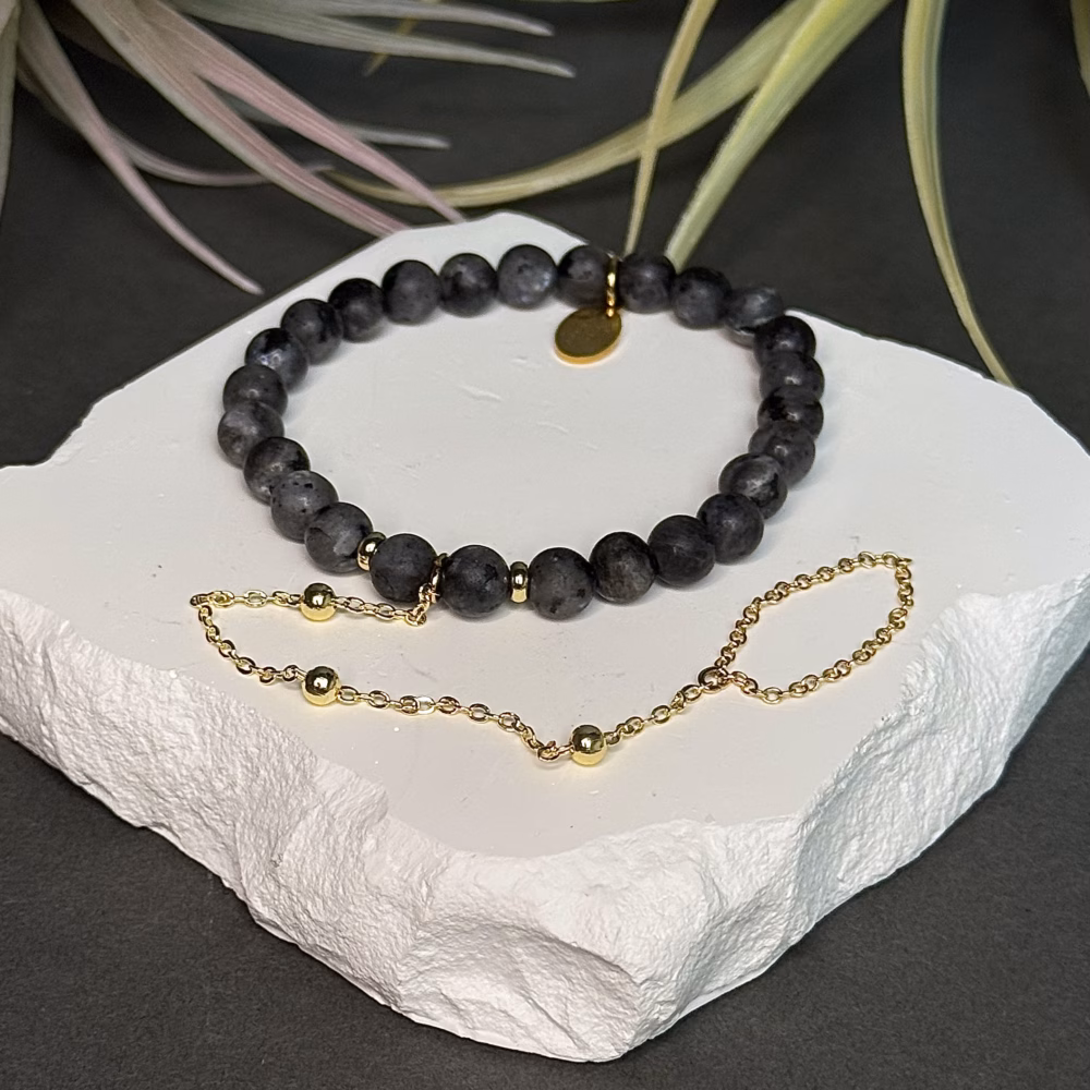 Elegantne larvikiidist helmestega keevõru, mida täiendavad ülekullatud roostevabast terasest detailid. Ajatu ja rahulik ehe igapäevaseks kandmiseks.