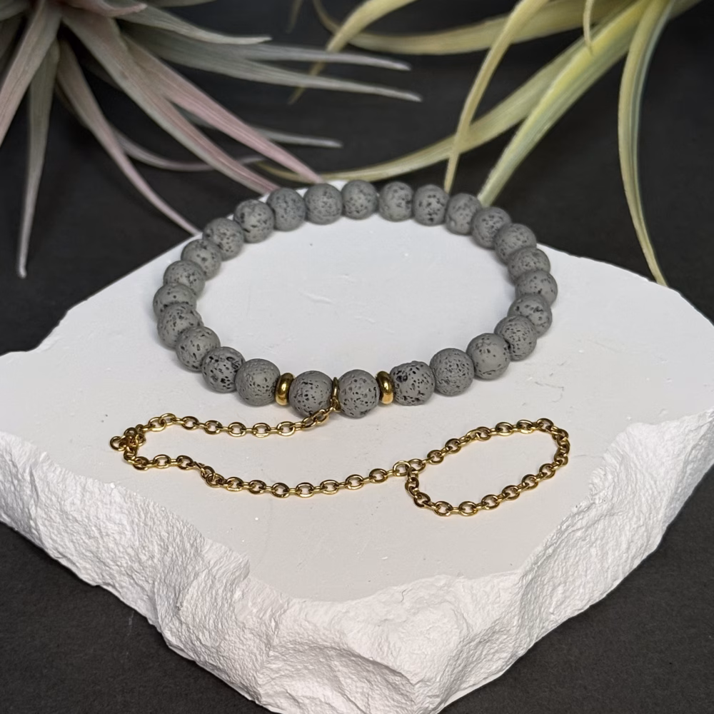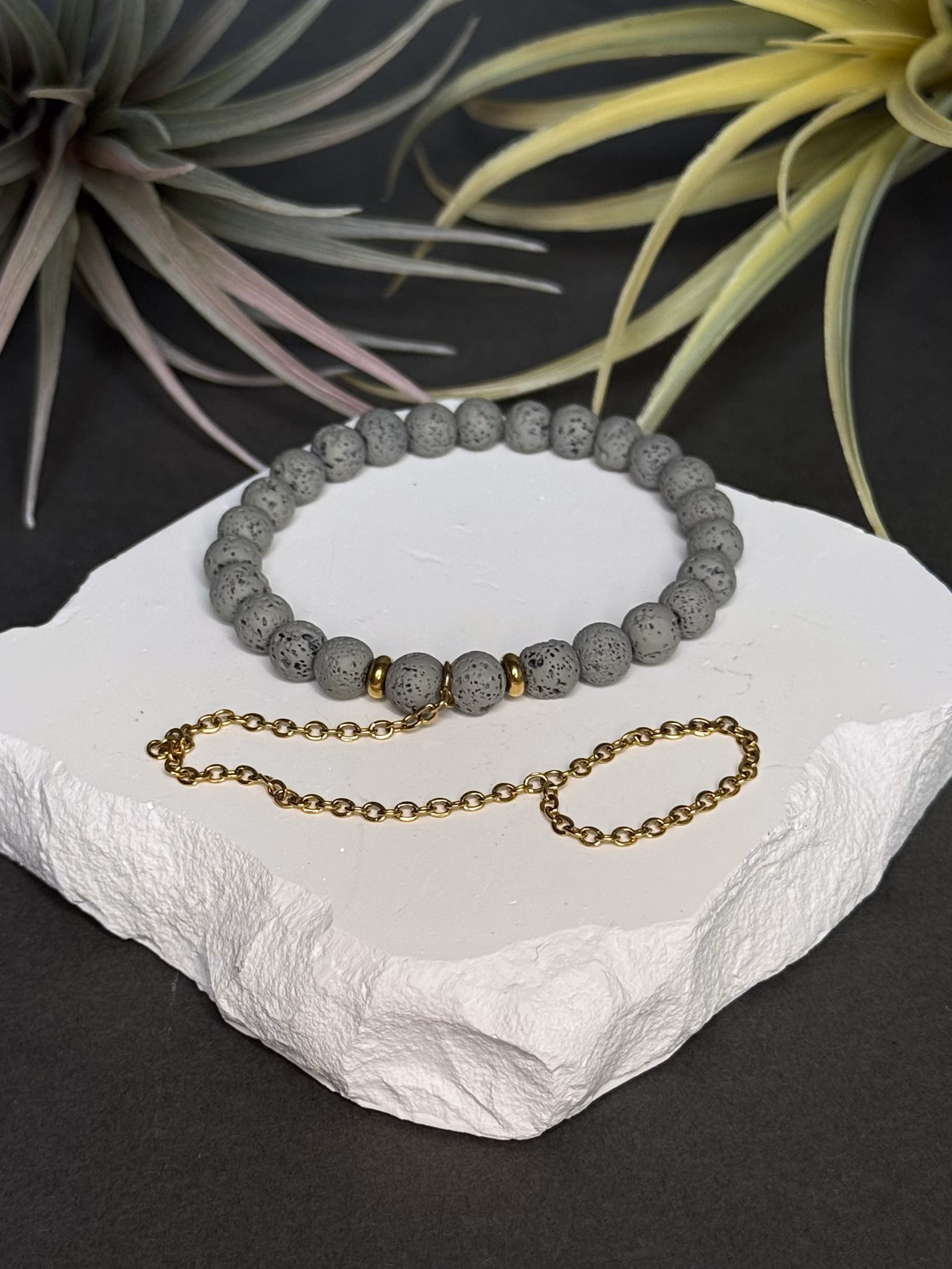 Õrn ja naiselik käeehe, mis jookseb sõrmest randmeni ja toob iga liigutusega esile käe kauni joone. Minimalistlik kullatoonis keti disain on ühendatud hallide laavakivi helmestega käevõruga – tulemus on samal ajal nii boho kui šikk. Sobib suurepäraselt nii igapäevaseks kandmiseks kui õhtusele väljaminekule.