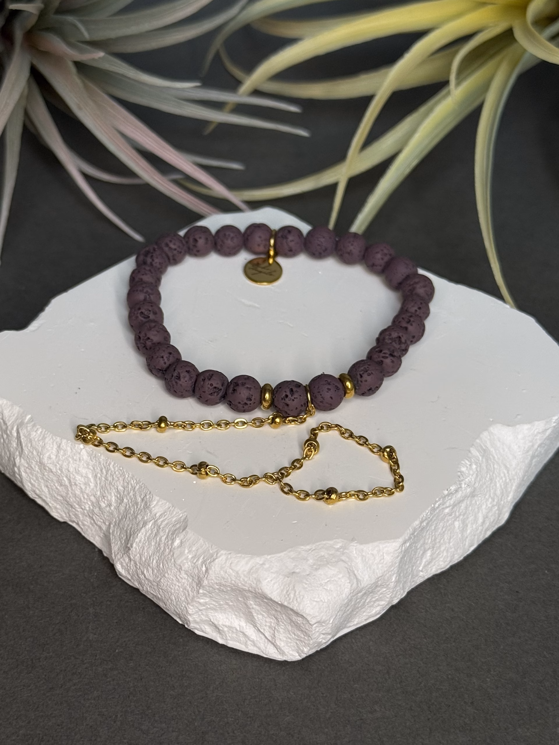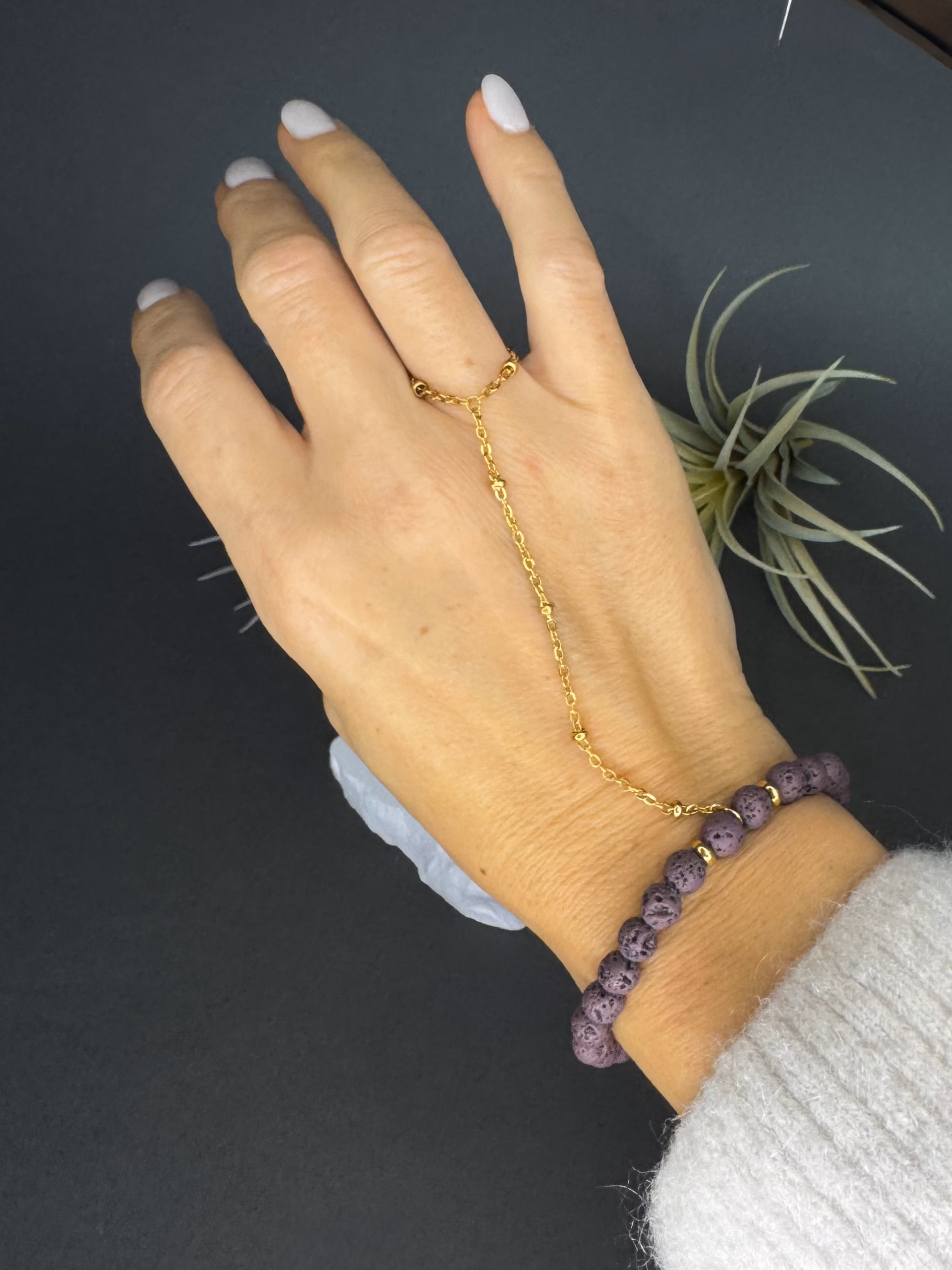 Õrn ja naiselik käeehe, mis jookseb sõrmest randmeni ja toob iga liigutusega esile käe kauni joone. Minimalistlik kullatoonis keti disain on ühendatud lillade värvitud laavakivi helmestega käevõruga – tulemus on samal ajal nii boho kui šikk. Sobib suurepäraselt nii igapäevaseks kandmiseks kui õhtusele väljaminekule.