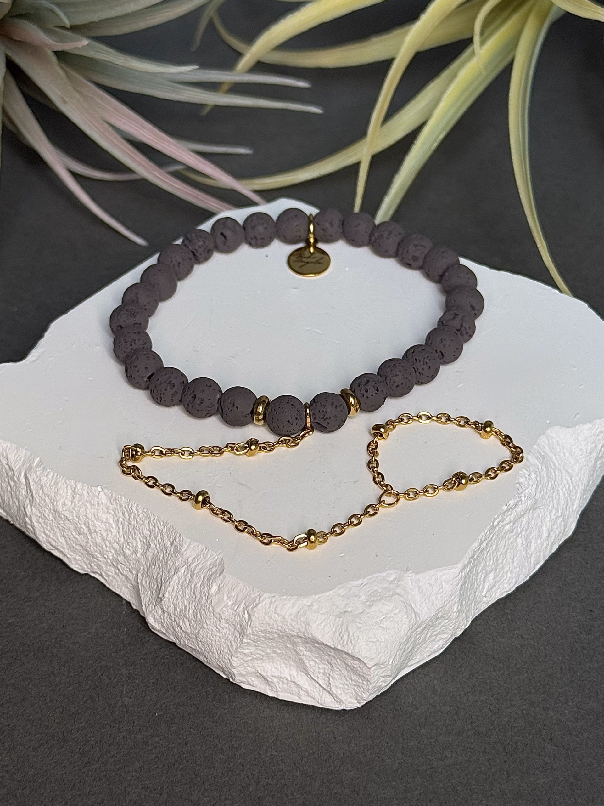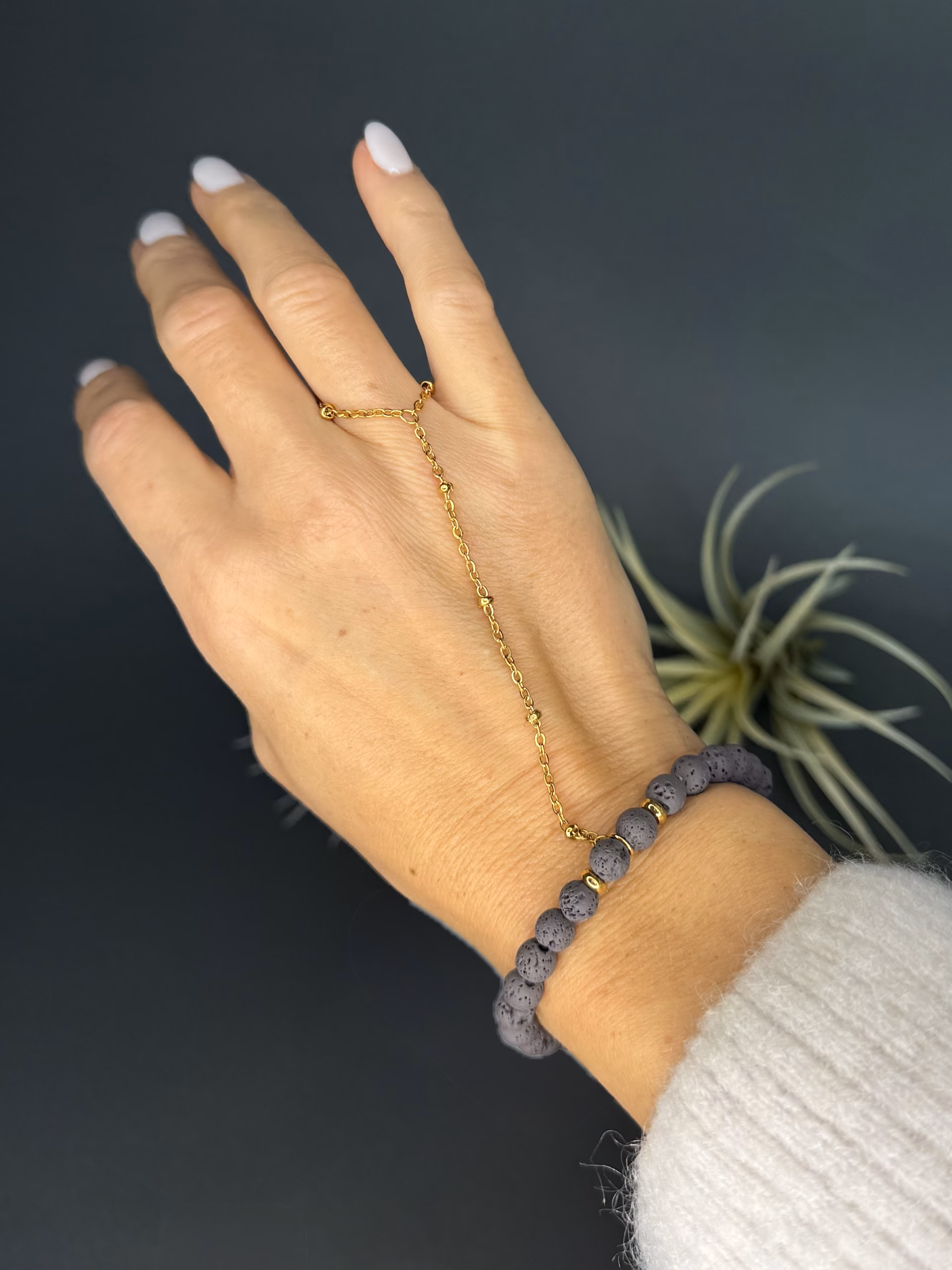 Õrn ja naiselik käeehe, mis jookseb sõrmest randmeni ja toob iga liigutusega esile käe kauni joone. Minimalistlik kullatoonis keti disain on ühendatud hallide laavakivi helmestega käevõruga – tulemus on samal ajal nii boho kui šikk. Sobib suurepäraselt nii igapäevaseks kandmiseks kui õhtusele väljaminekule.