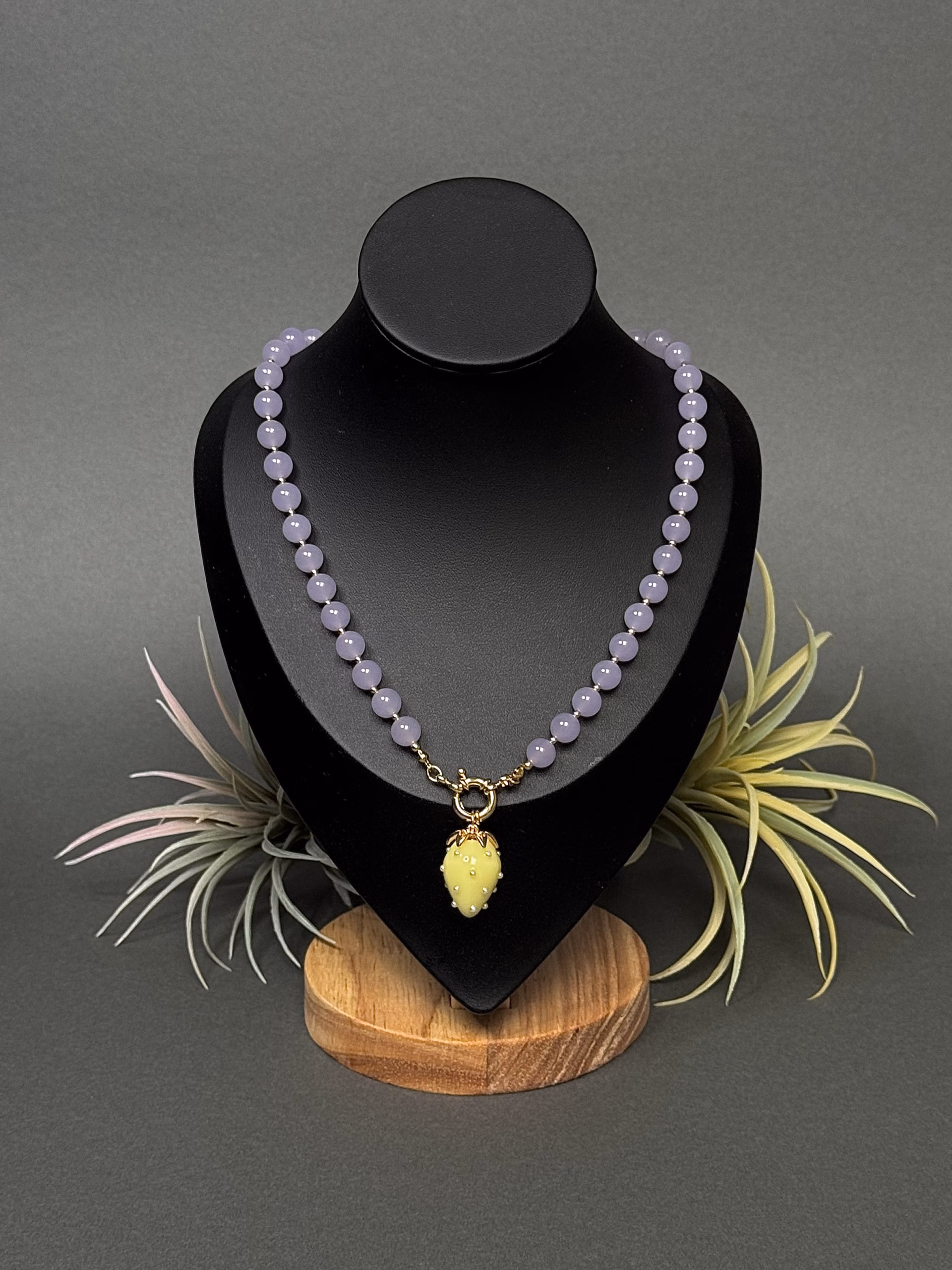 See võluv maasika kaelakee ühendab endas pehmuse, elegantsi ja mängulise iseloomu. Kaelakee on valmistatud looduslikest jadeiidist helmestest, mis on tuntud oma rahustava ja tasakaalustava energia poolest. Ehte keskmes ripub valge maasika kujuline ripats, mis lisab disainile unikaalset võlu ja värskust.
