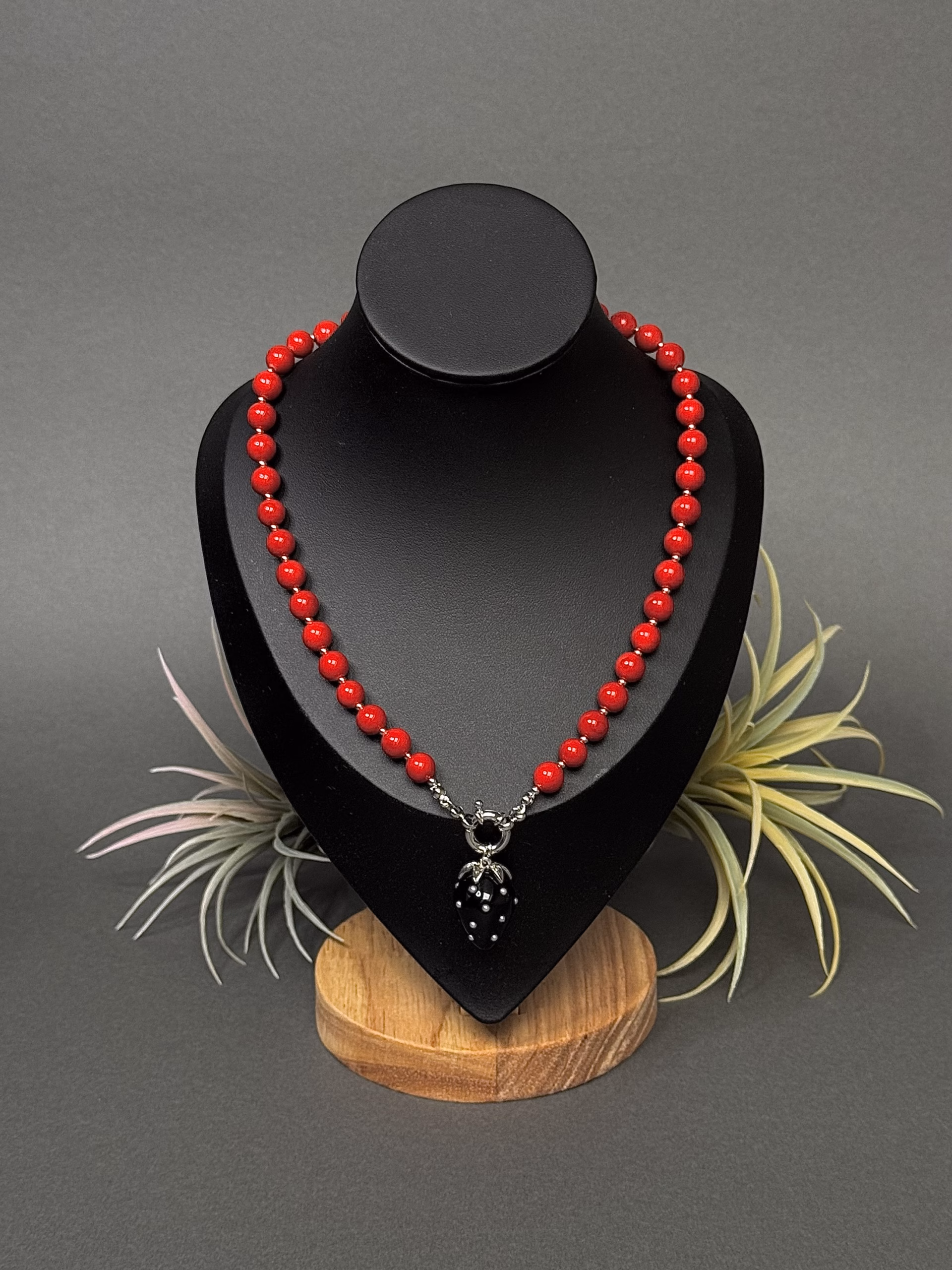 See kaunis maasika kaelakee ühendab mängulisuse ja elegantsi. Ehe on valmistatud erksatest punastest helmestest, mida täiendab musta-valge täpiline maasika kujuline ripats – pilkupüüdev detail, mis lisab isikupära igale riietusele.