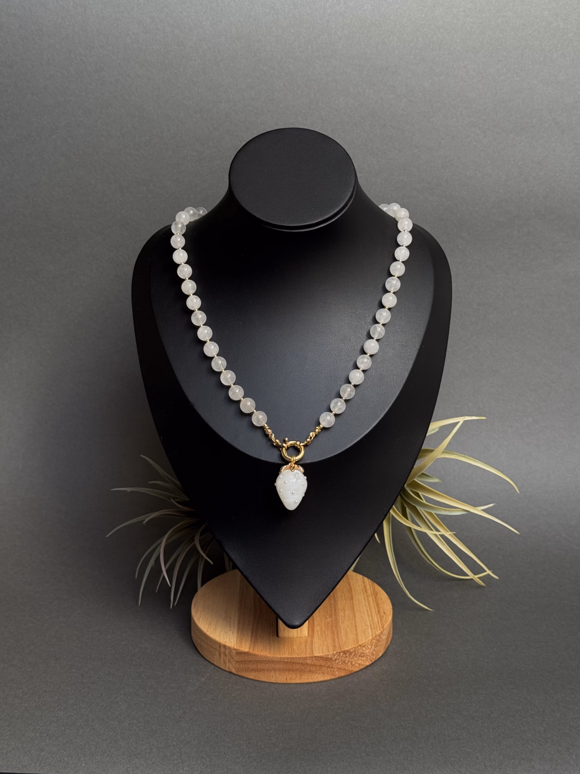 Õrn ja helge maasikakee, mis toob sinu look’i puhta ja naiseliku sära. Läbikumavad valged helmed ja valge maasikakujuline ripats loovad pehme, romantilise koosluse, mida täiendab hõbetoonis kinnitus. See on ehe, mis sobib kaunilt nii igapäevase kudumi kui pidulikuma kleidi juurde.