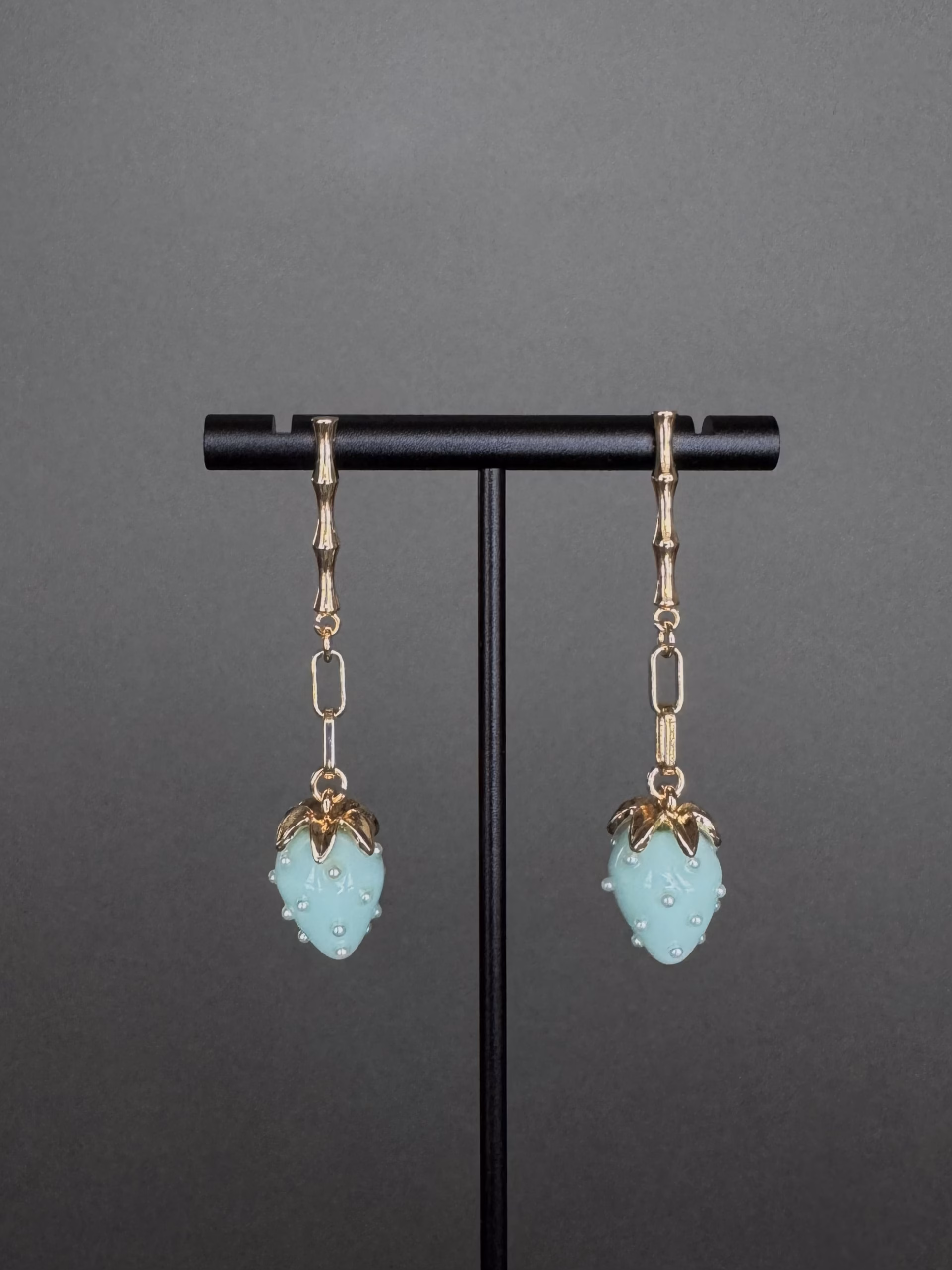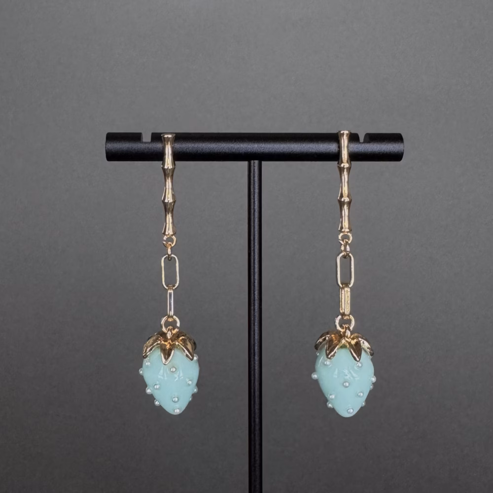 Mänguliselt naiselikud kõrvarõngad, kus kuldsest bambus-efektiga rõngast langeb õrn pastellne türkiissinine maasikakujuline ripats. Väike statement-detail, mis lisab igale outfit’ile veidi magusat boho-võlu … olgu selleks teksad ja T-särk või pidulik kleit.