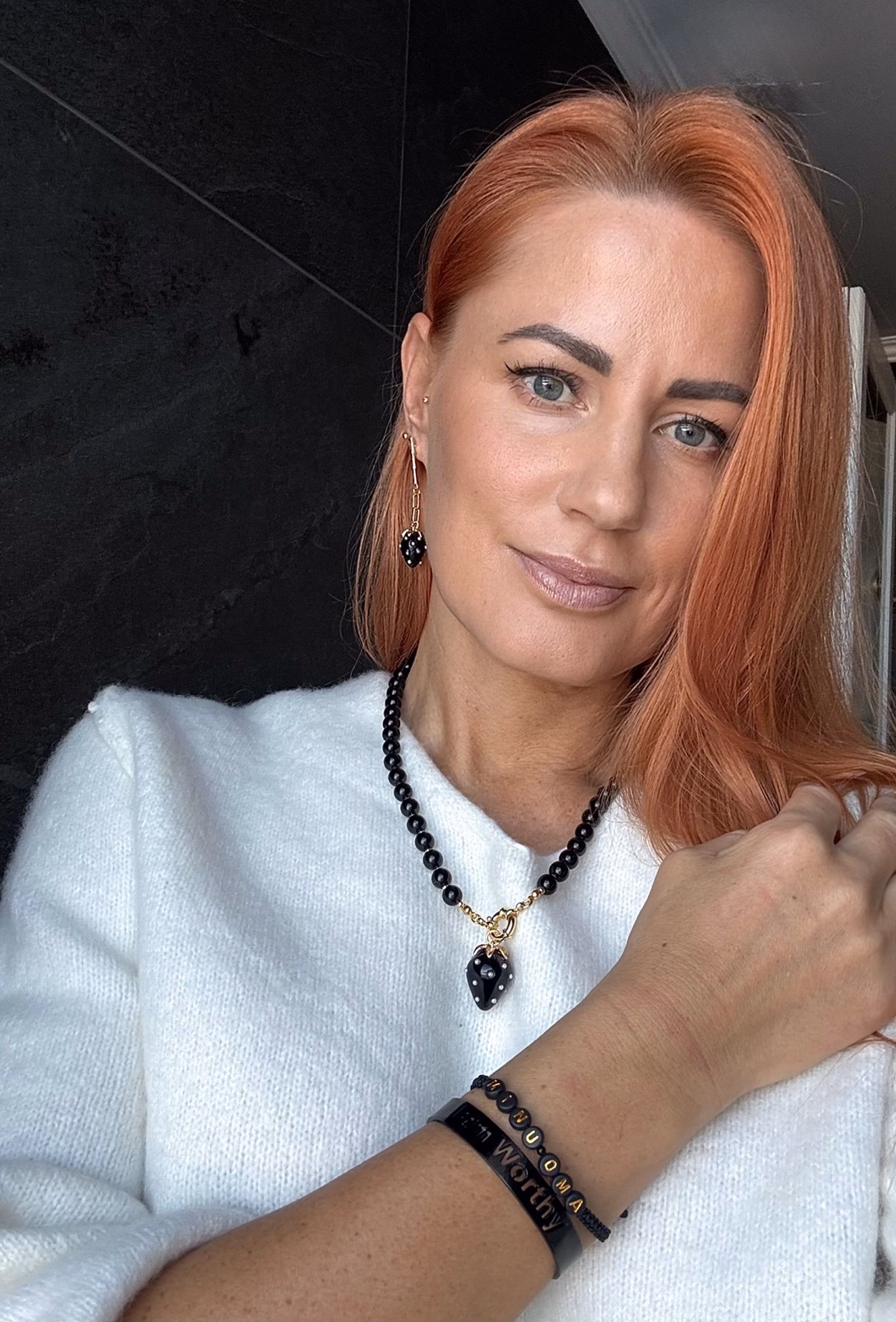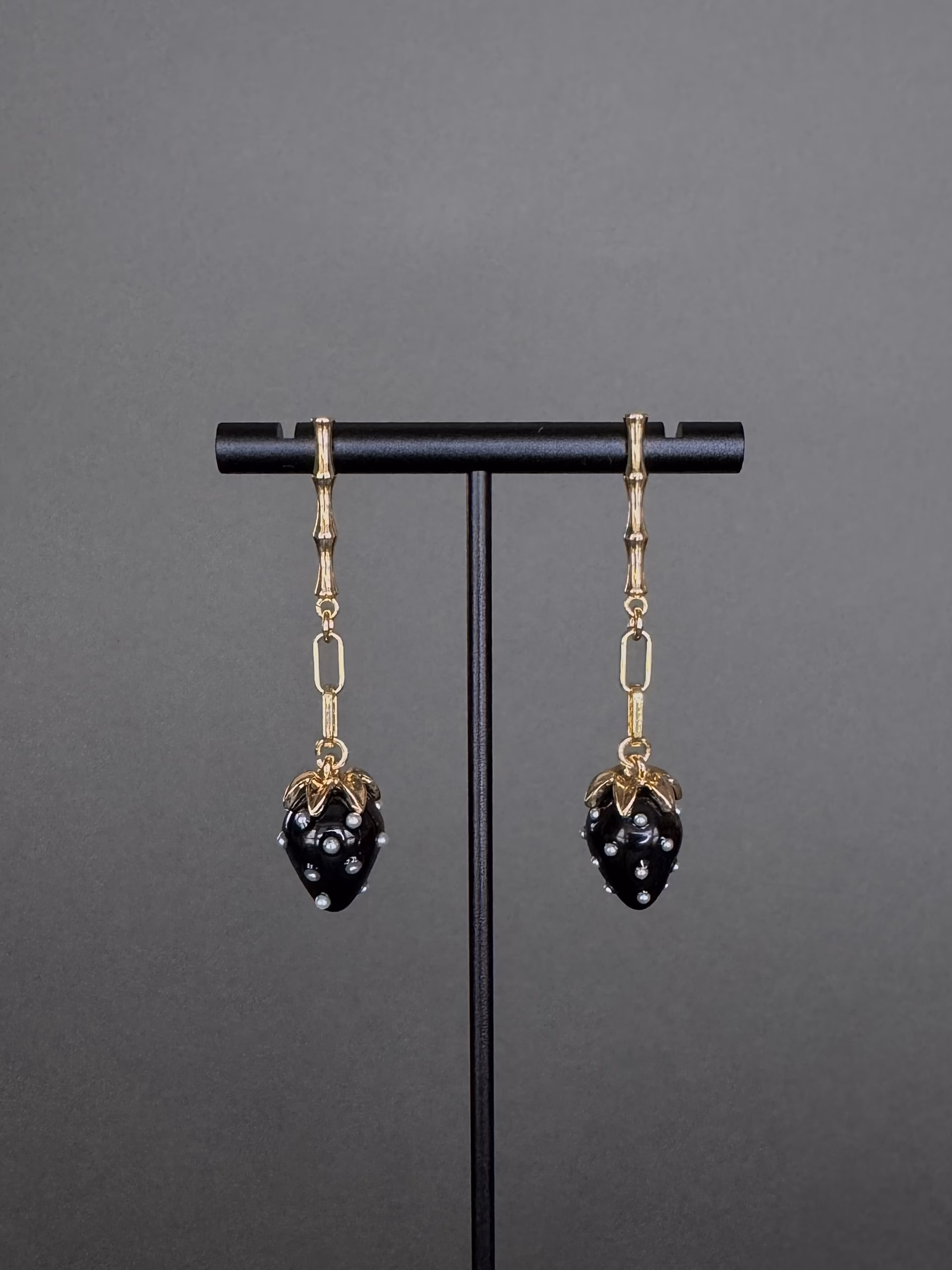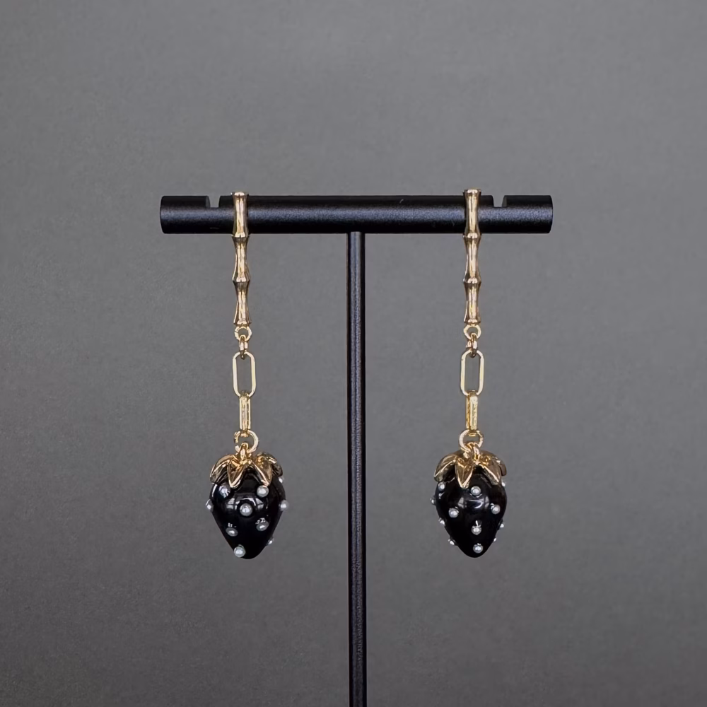 Mänguliselt naiselikud kõrvarõngad, kus kuldsest bambus-efektiga rõngast langeb stiilne must maasikakujuline ripats. Väike statement-detail, mis lisab igale outfit’ile veidi magusat boho-võlu … olgu selleks teksad ja T-särk või pidulik kleit.
