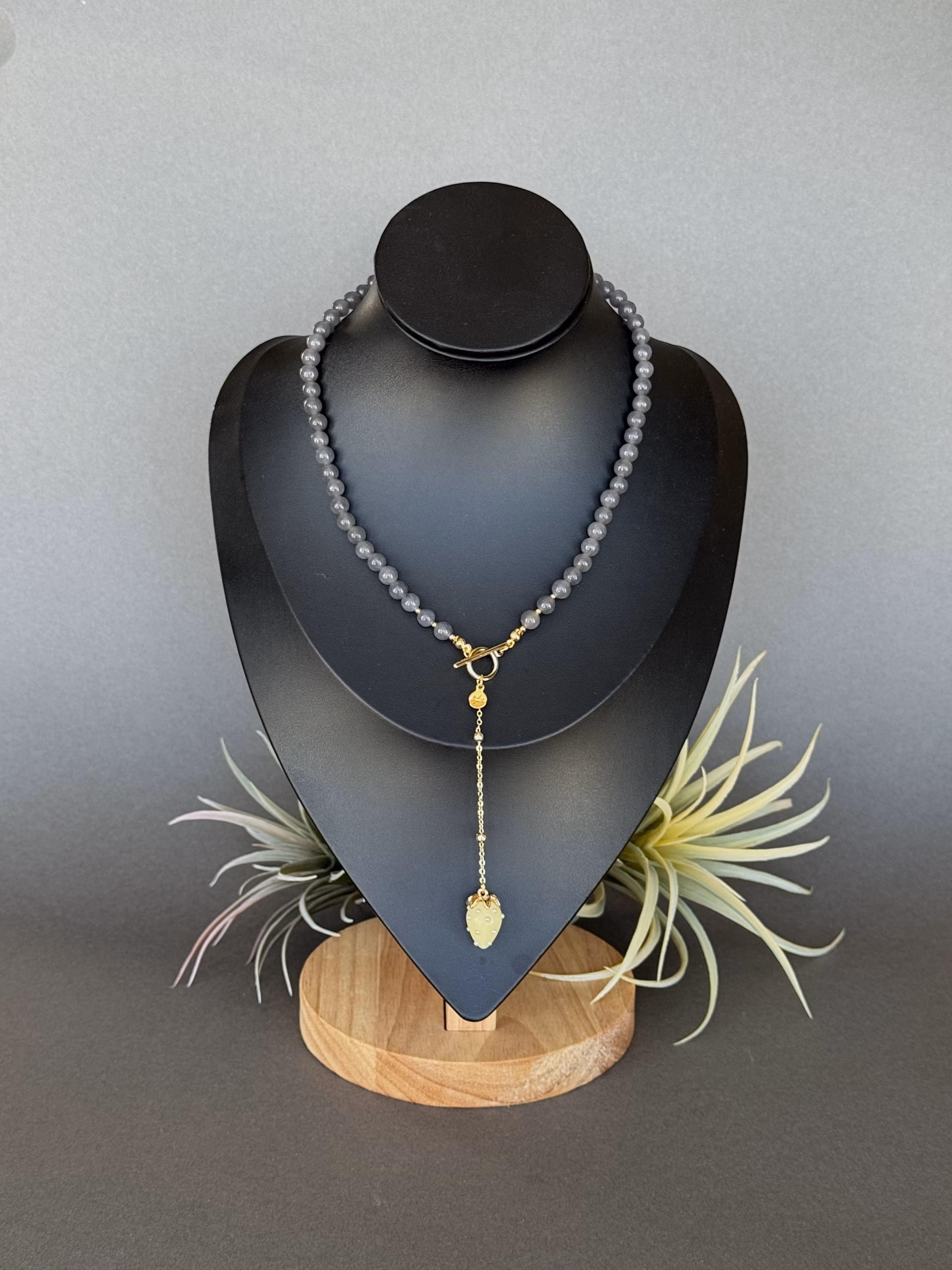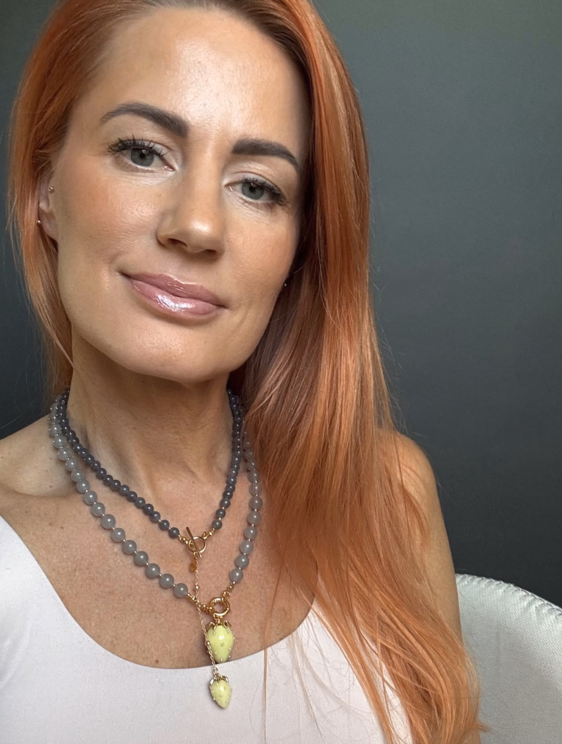 Õrn ja naiselik kee, kus heledad hallis helmed kohtuvad väikese pastellkollase maasikaga. Ees asetsev T-kinnitus ja pikk rippuv kett joonistavad kaela kaunilt välja ning lisavad boho-šiki liikumist igale sammule. Dama mini maasikakee on täiuslik kaaslane nii pehmele kudumile kui suvisele kleidile.