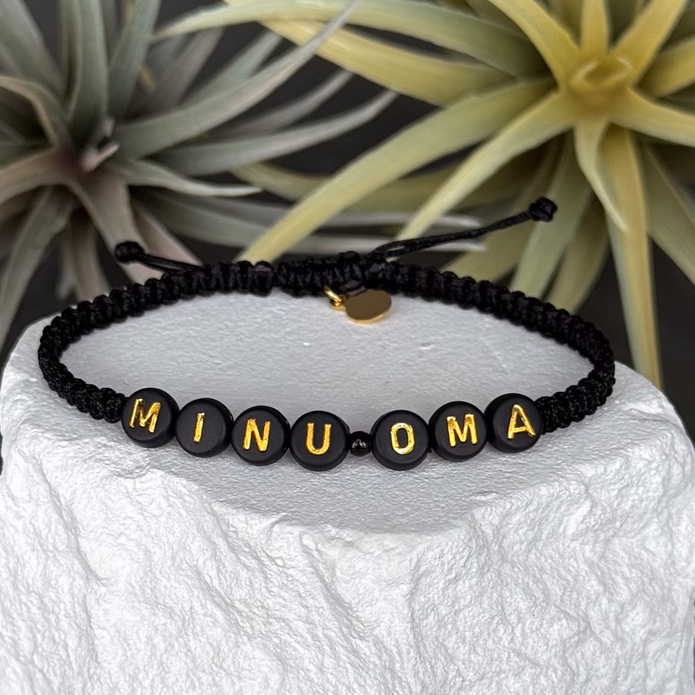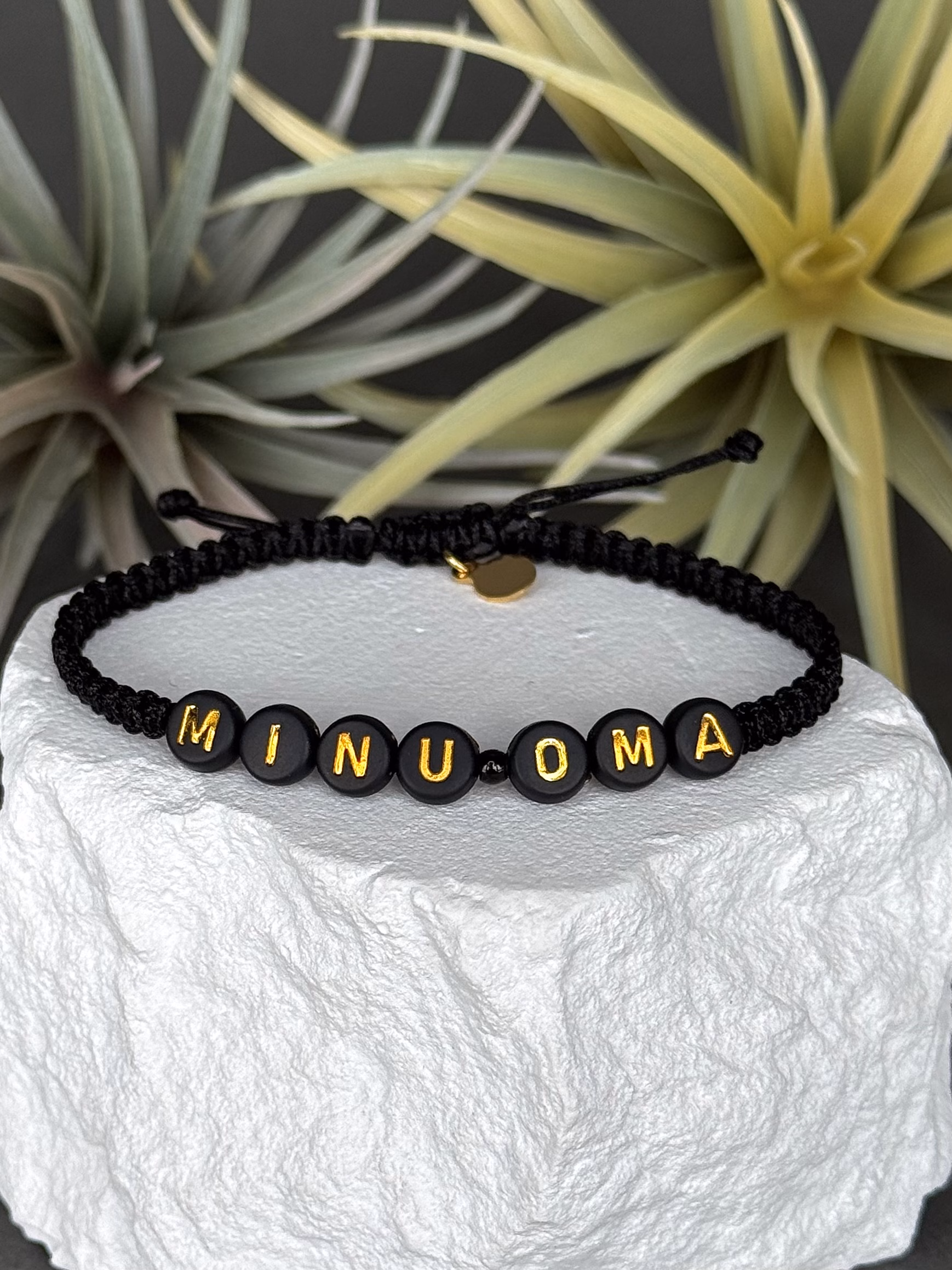 Väike, aga väga selge sõnum – must nimepael kirjaga MINU OMA. Täiuslik viis märkida “see on minu inimene” ilma liigse roosamannata. Must pael ja mustad tähthelmed kuldse kirjaga sobivad hästi nii naisele, mehele kui teismelisele.