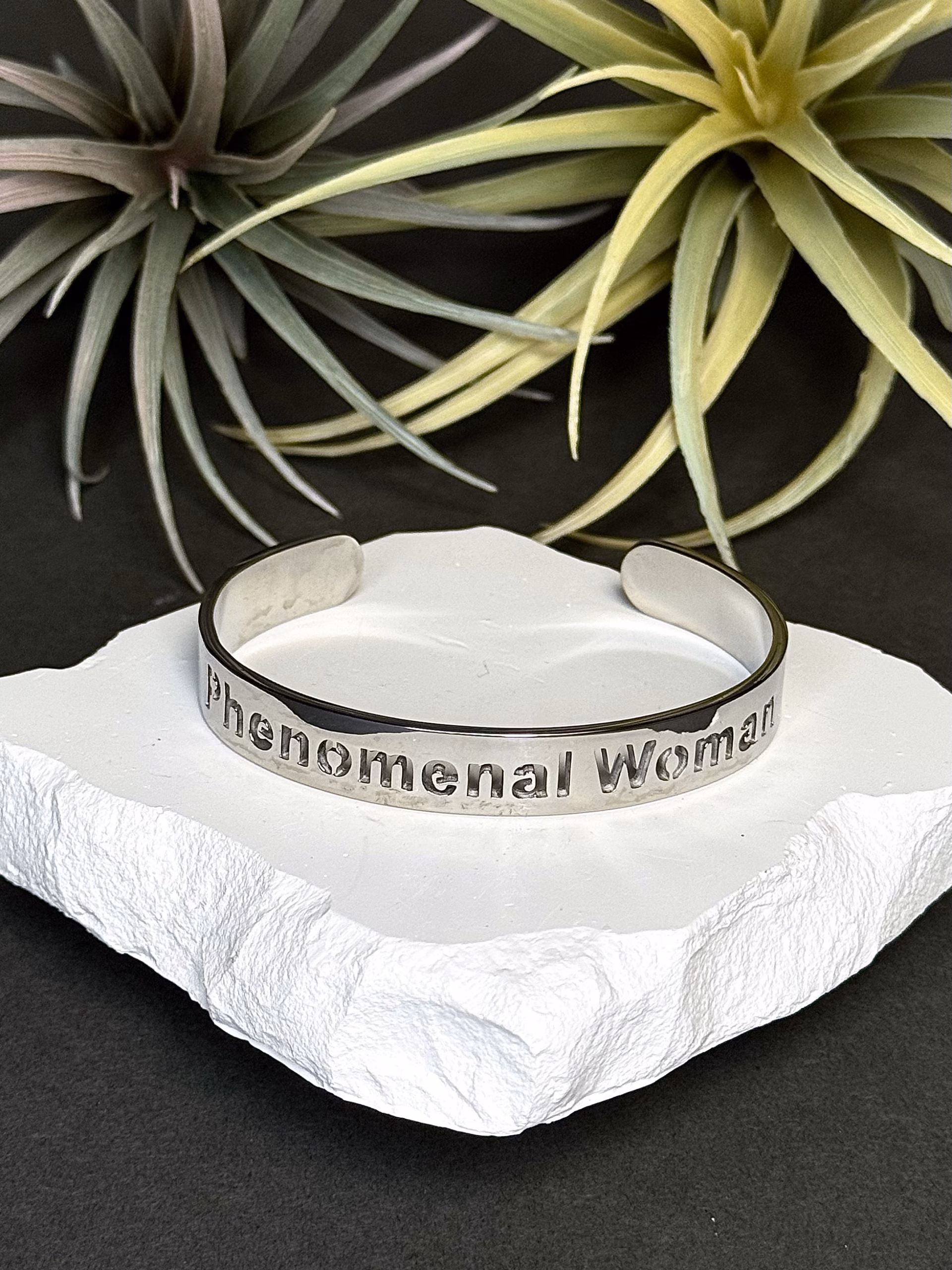Hõbedasest roostevabast terasest käevõru naisele, kes teab oma väärtust. Minimalistlik, samas tugev ja enesekindel detail, millel kiri “Phenomenal Woman” – väike meeldetuletus igasse päeva, et sa oled rohkem kui lihtsalt “naine”, “ema” või “vanaema”