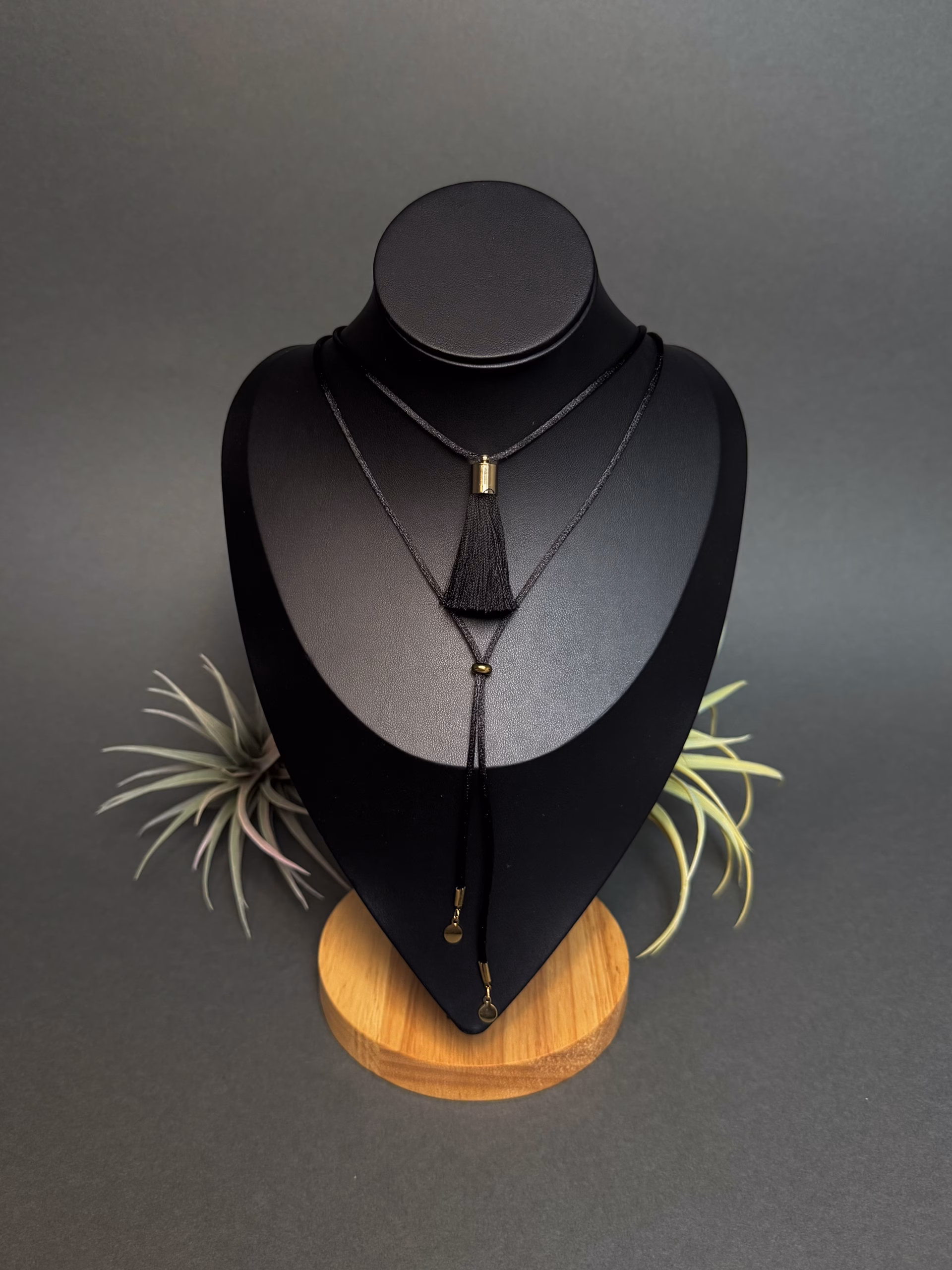 Satiinpaelast choker – ülekullatud roostevabast terasesest efektse musta tassel ripatsiga