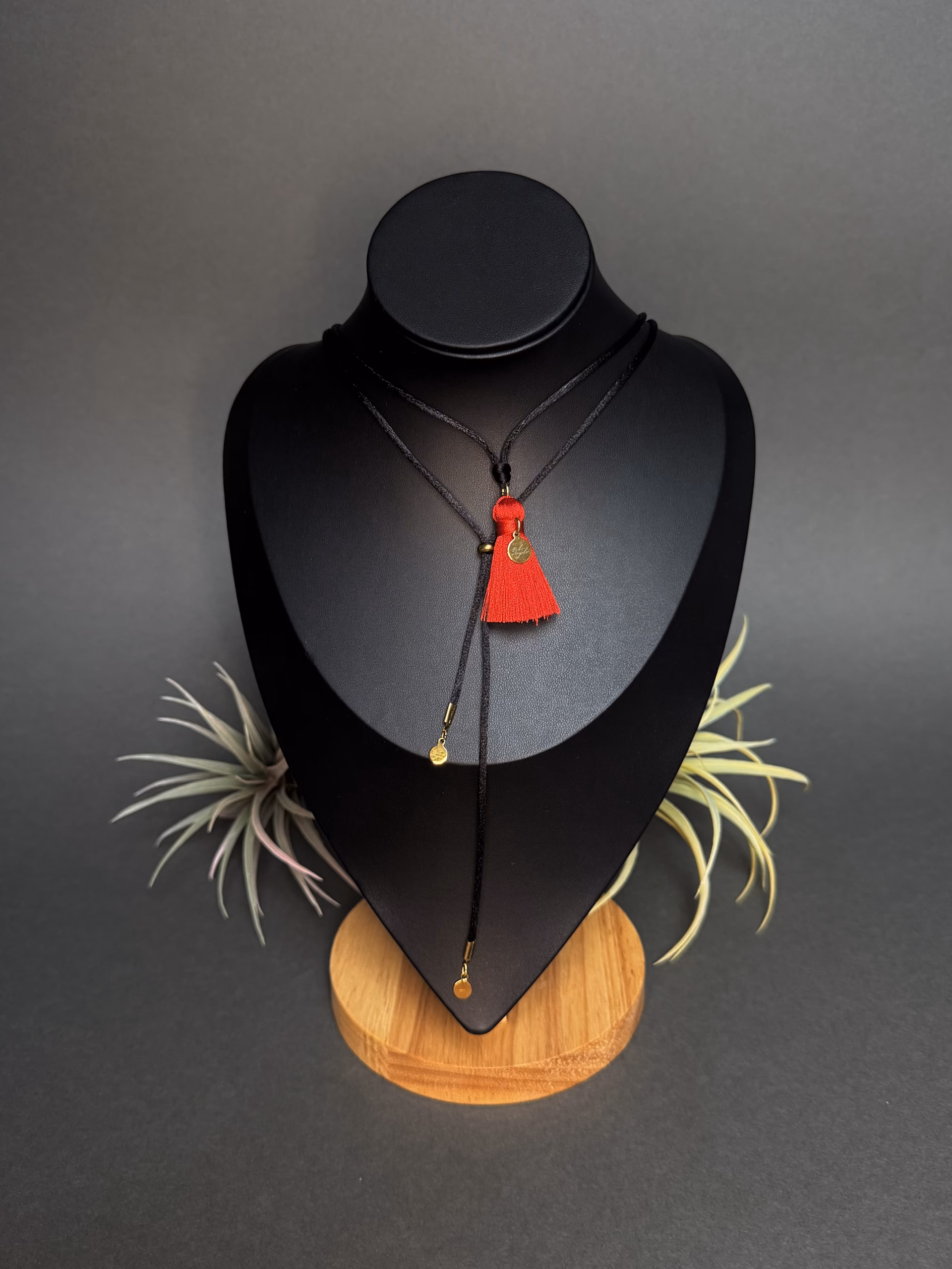 Satiinpaelast choker – ülekullatud roostevabast terasesest efektse punase tassel ripatsiga