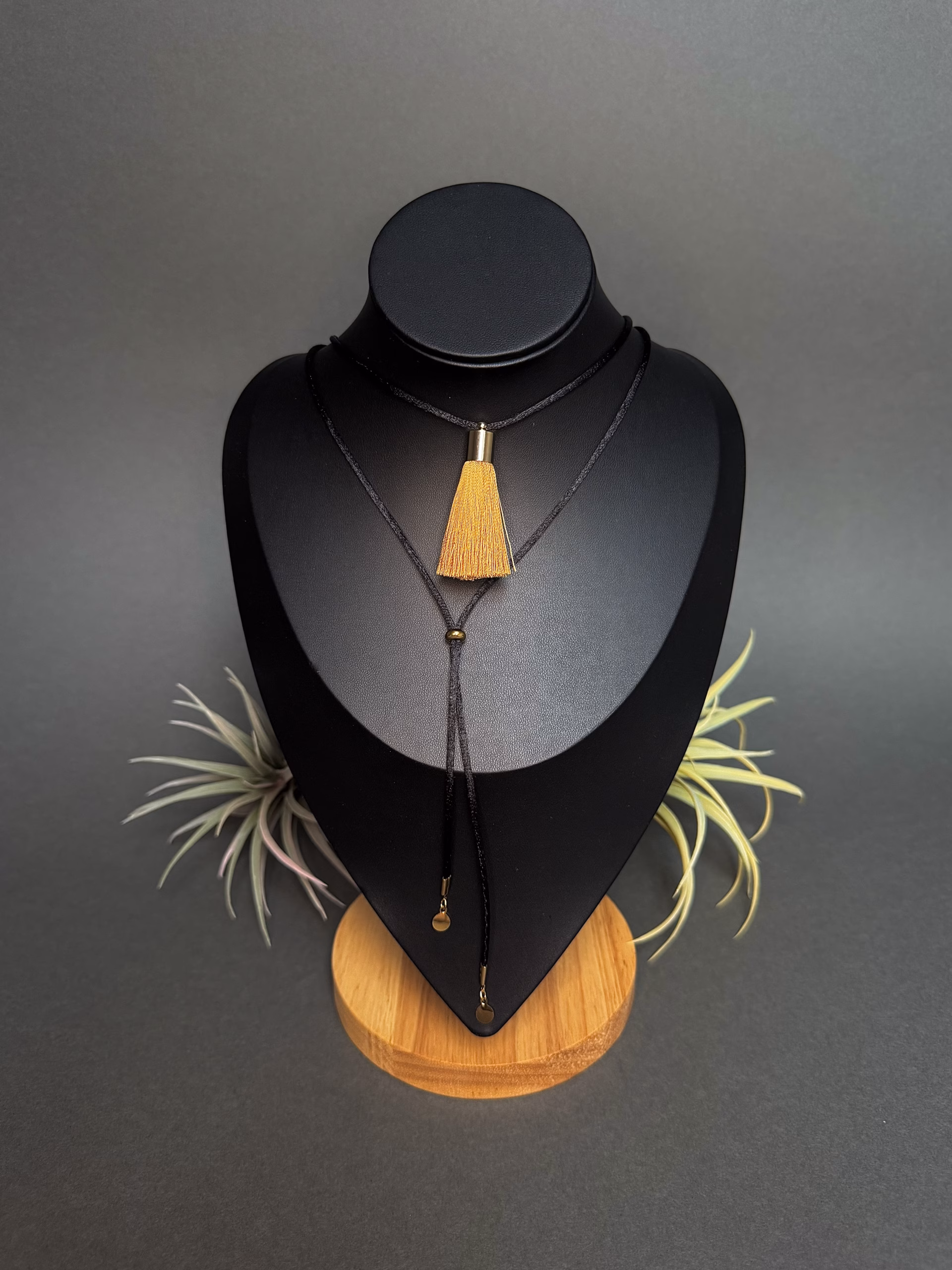 Satiinpaelast choker – ülekullatud roostevabast terasesest efektse sinepikollase tassel ripatsiga