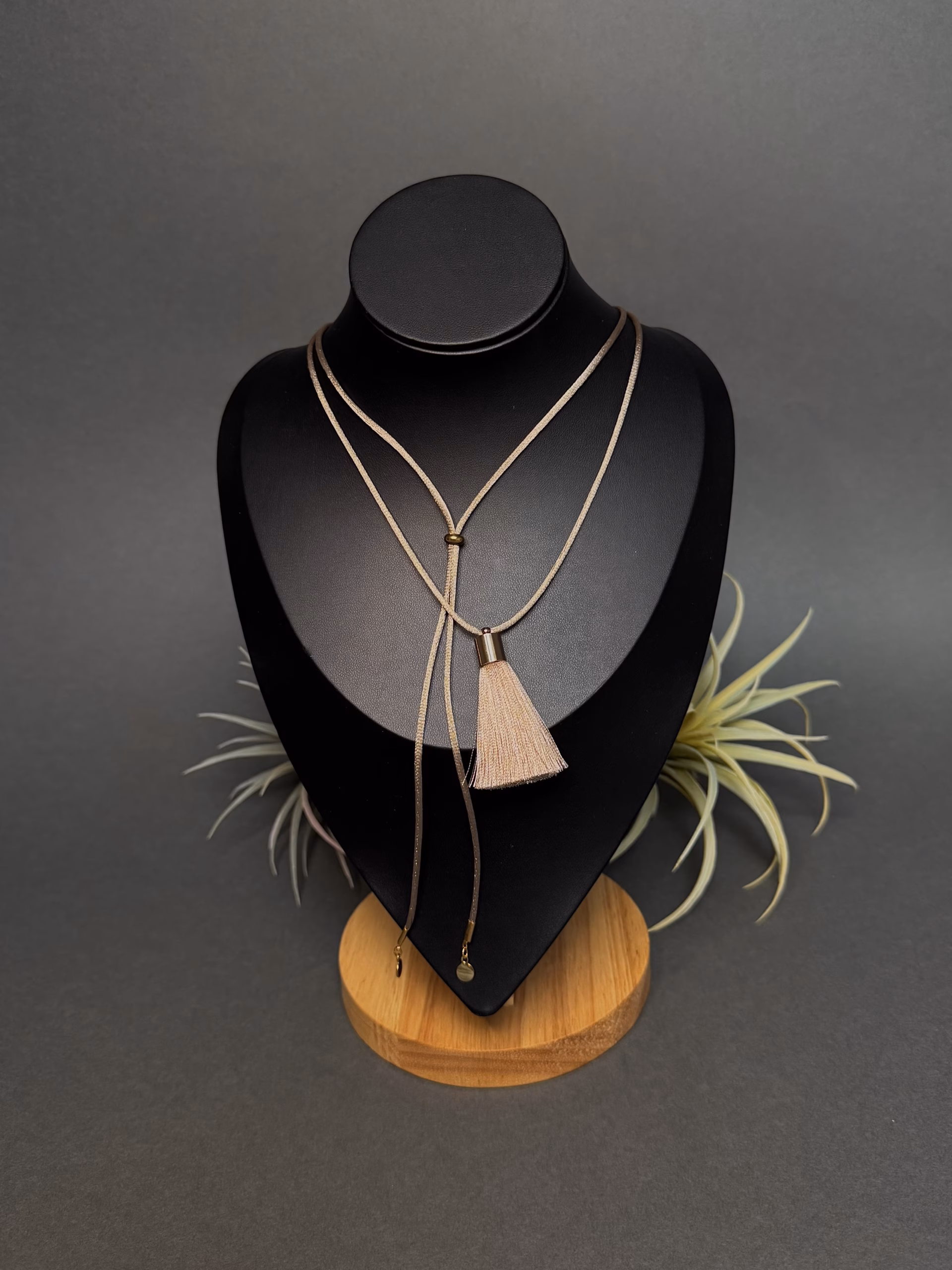Stiilne ja pehme satiinpaelast choker, mis lisab igale välimusele naiselikku elegantsi. Paela keskpunkti kaunistab ülekullatud roostevabast terasest detail, mis toob aksessuaarile luksusliku sära ja modernse aktsendi. Paela juveeliks on efektne kreemjas tassel ripats.