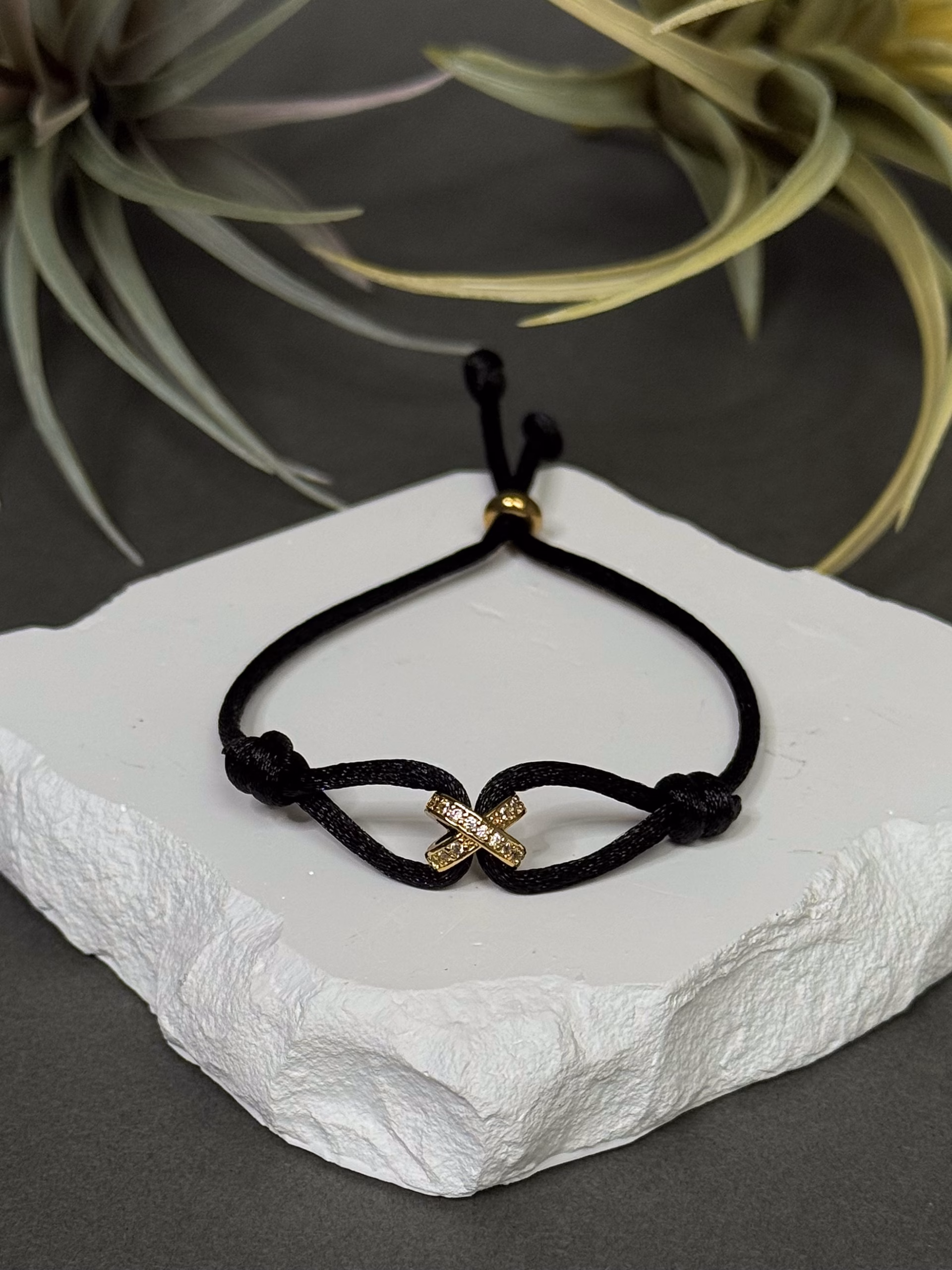 Material: Satin cord, Metal: stainless steel, Brass: 18K Gold, Stone: Zircon