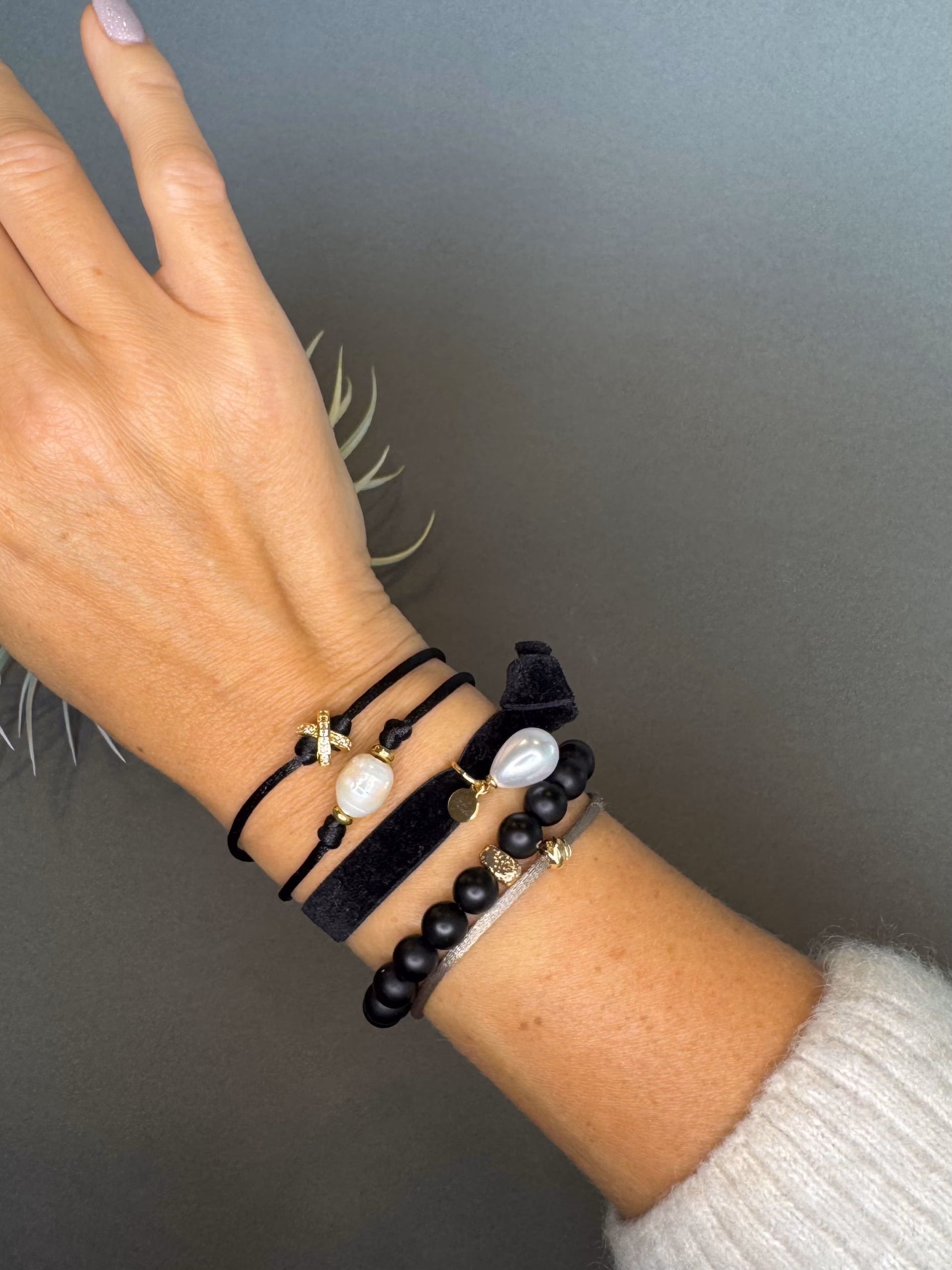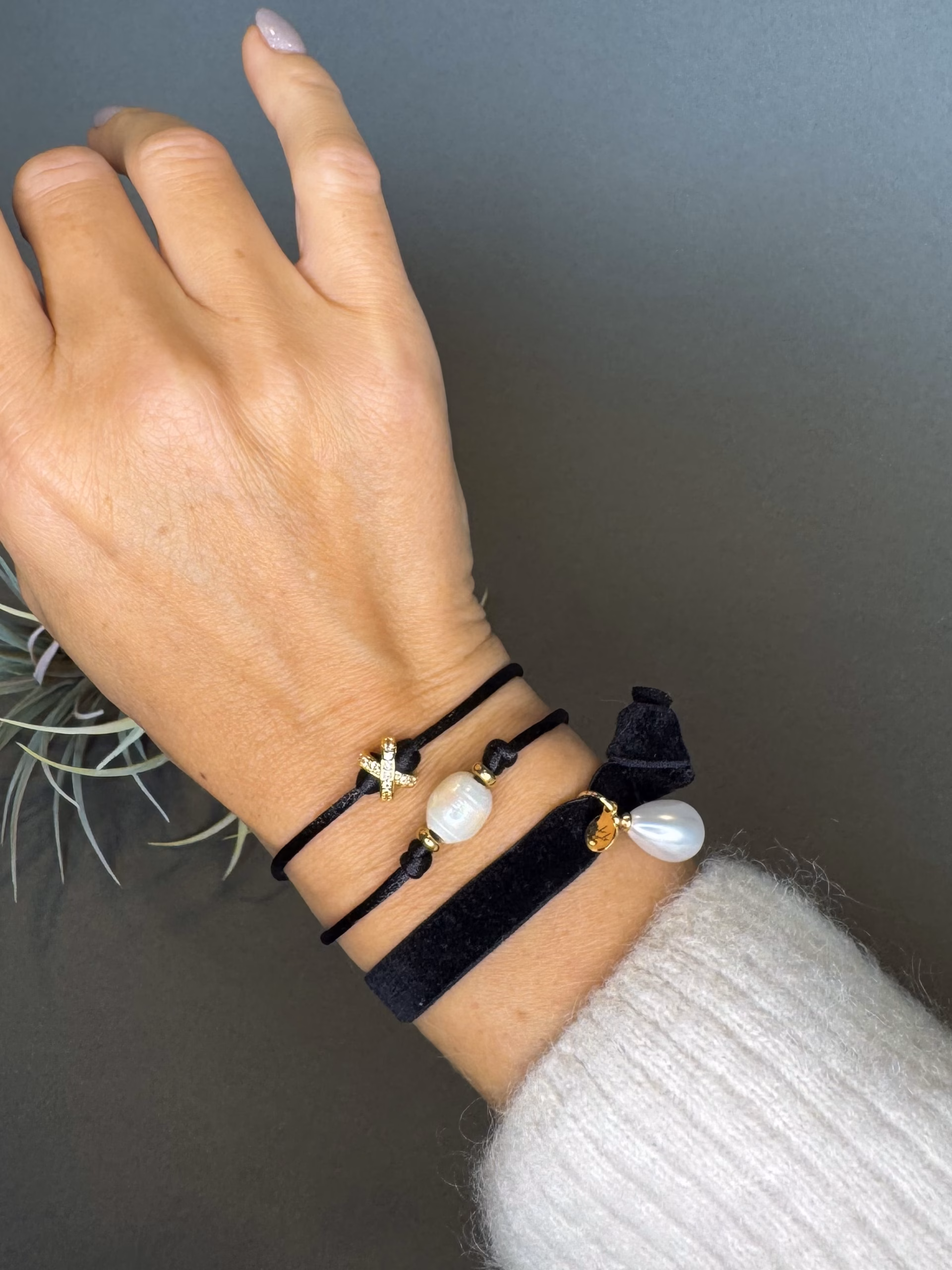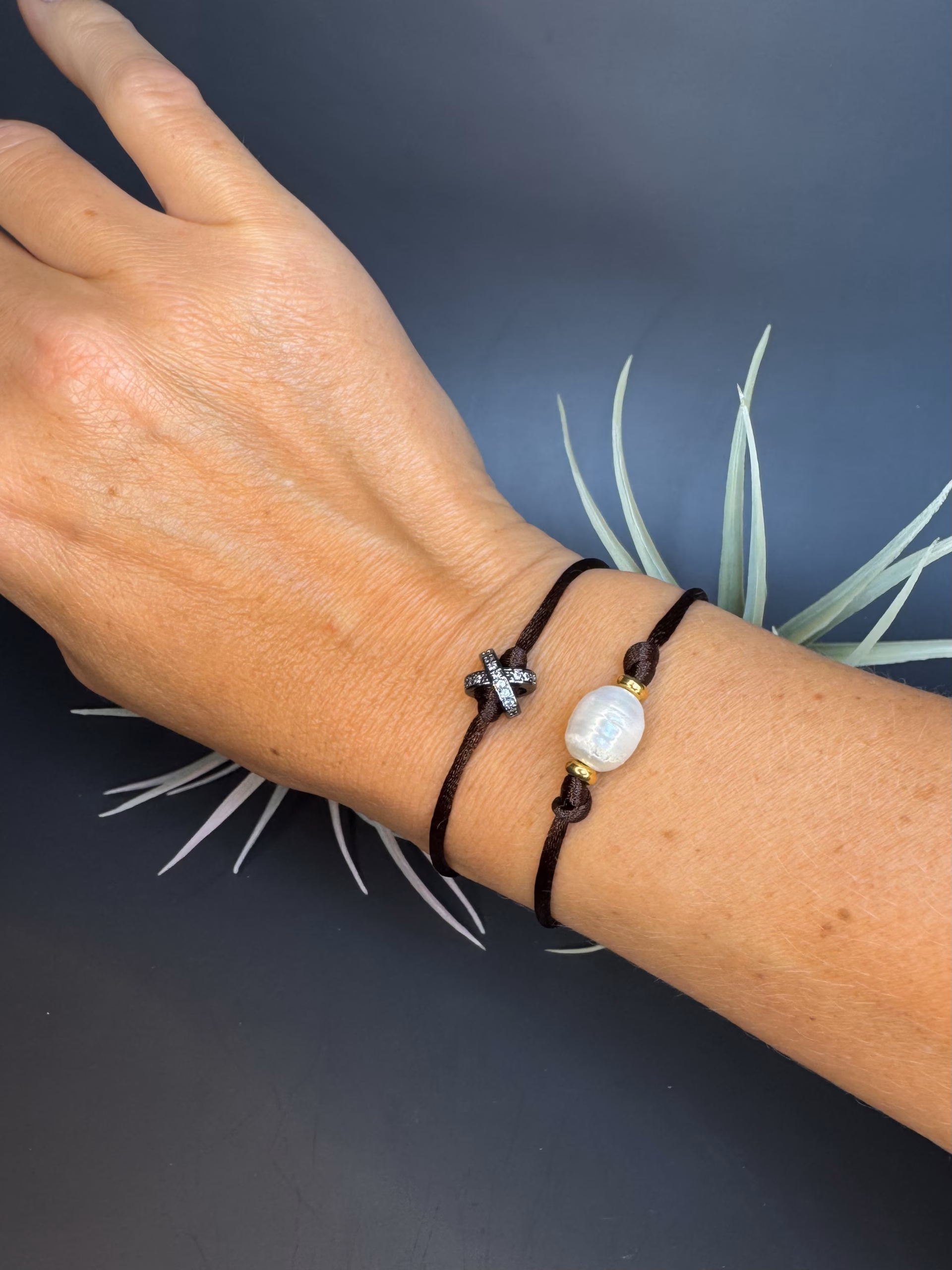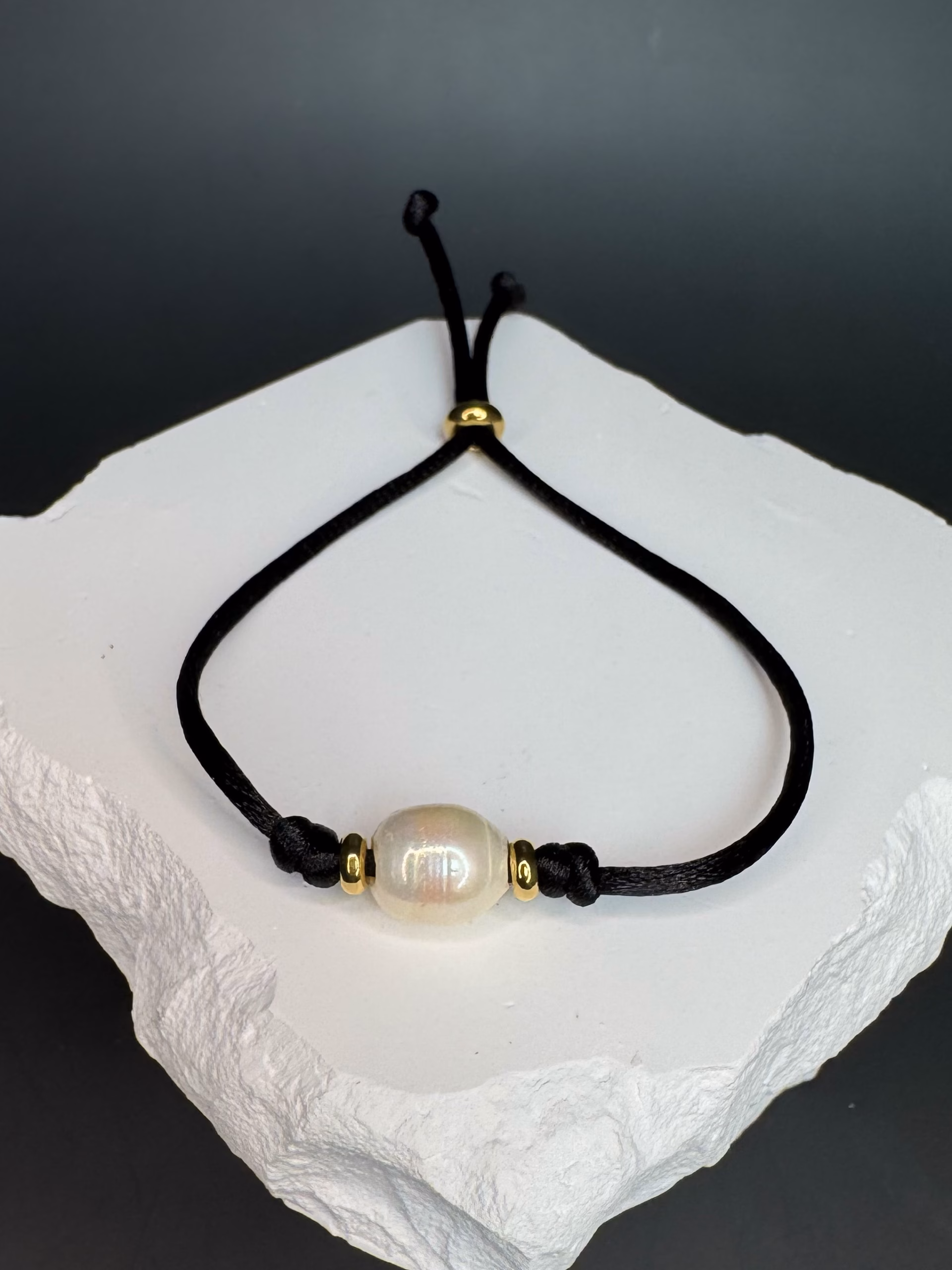 Material: Satin cord, Metal: stainless steel, Brass: 18K Gold, Natural Freshwater Pearl