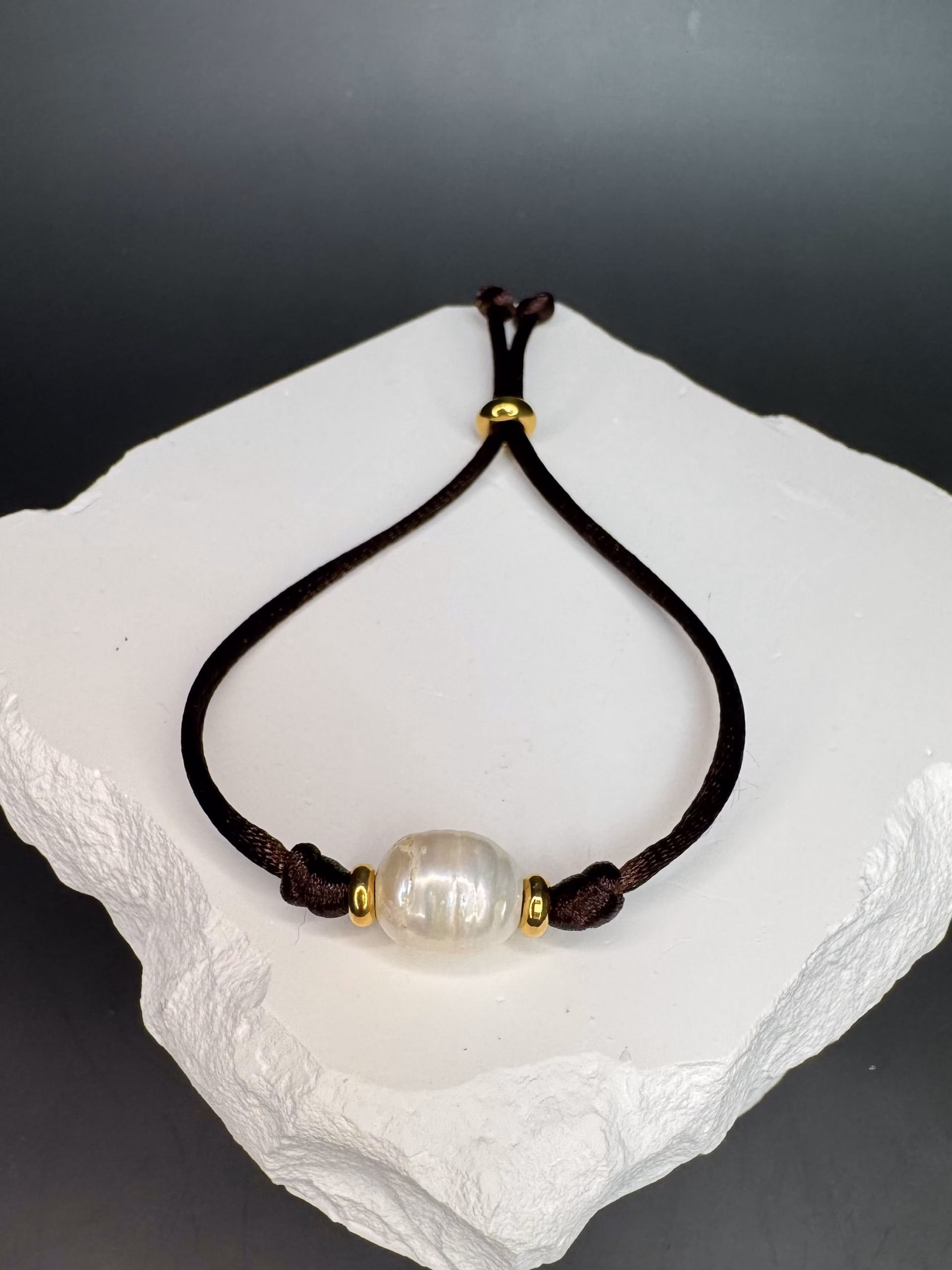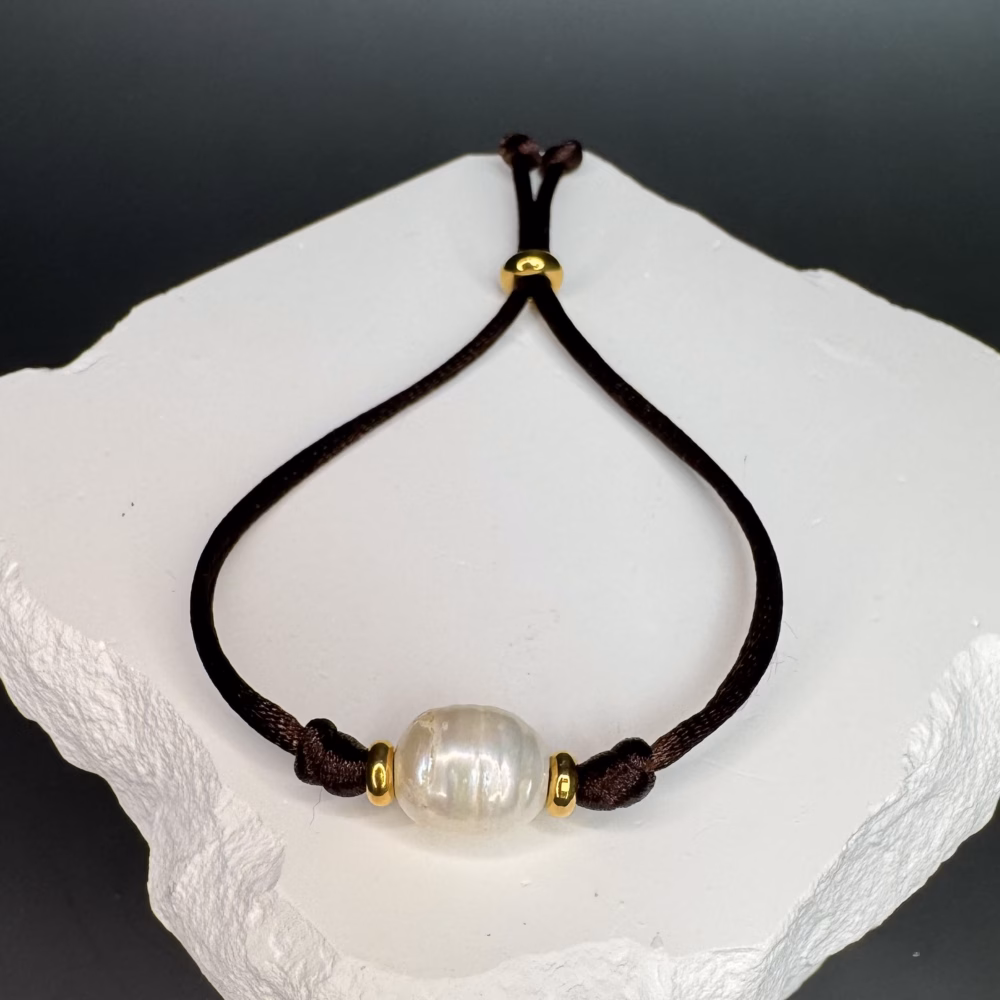 Material: Satin cord, Metal: stainless steel, Brass: 18K Gold, Pearl: Freshwater pearl
