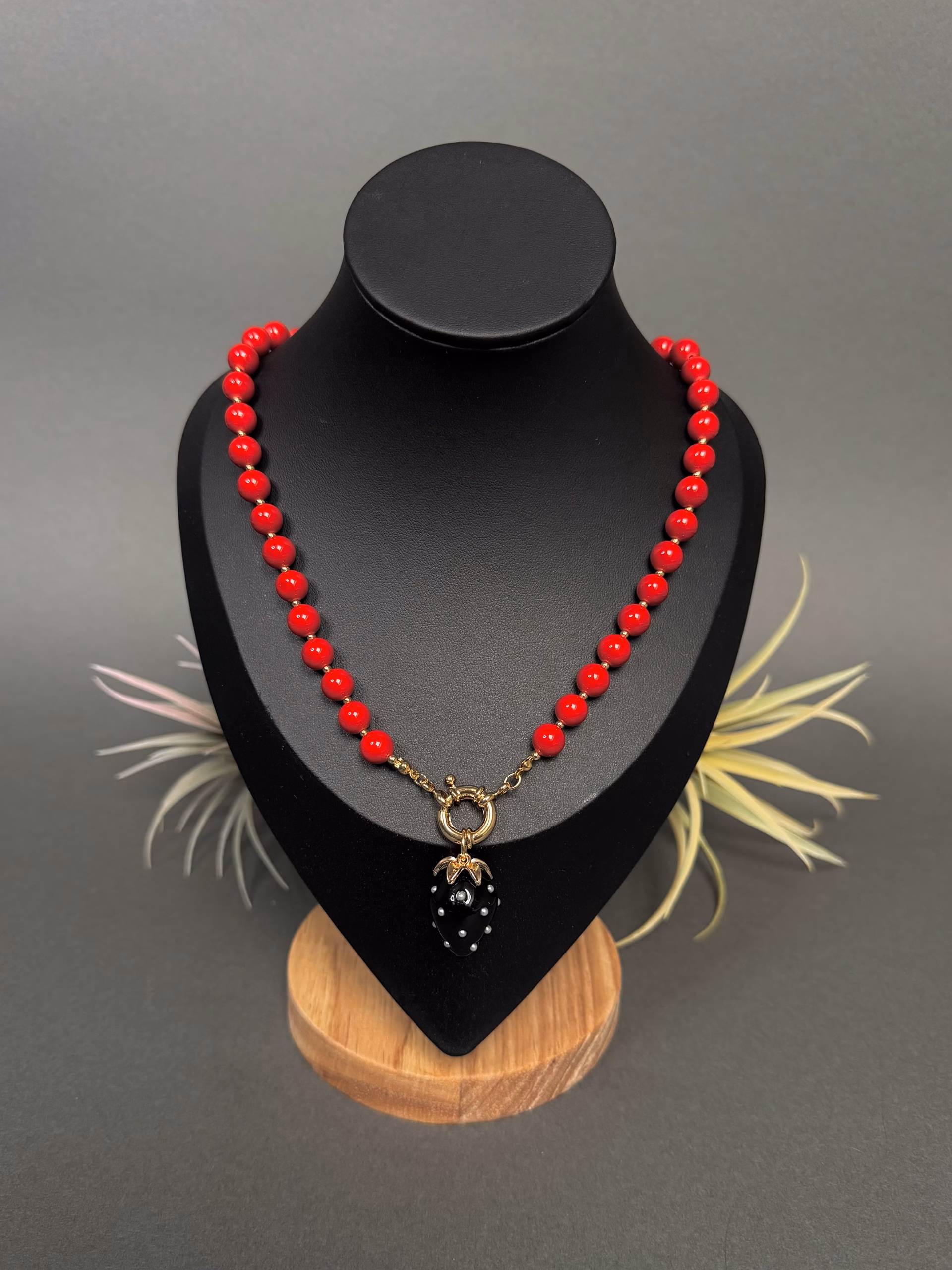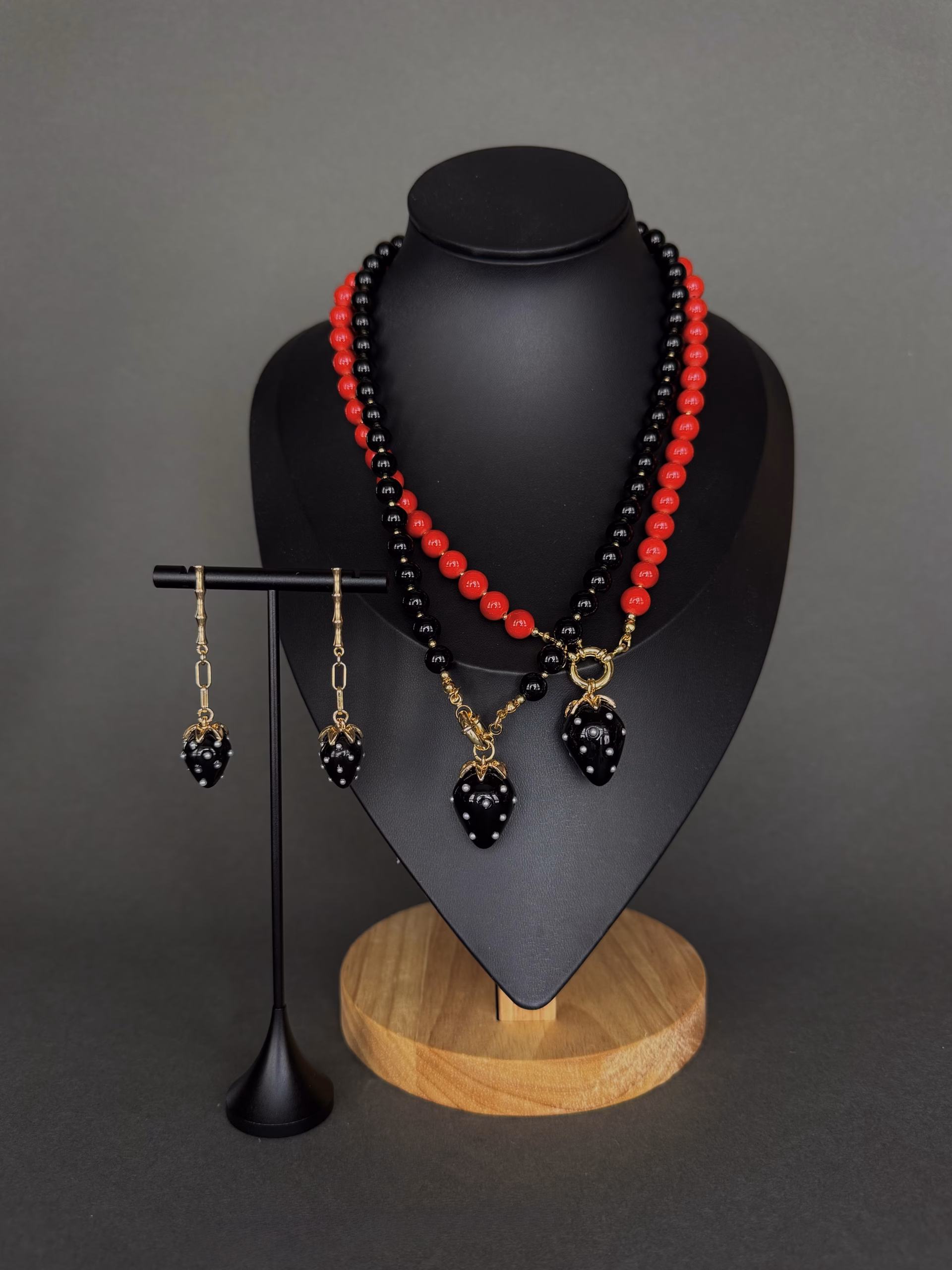 punaste helmestega kaelakee musta maasikakujulise ripatsiga