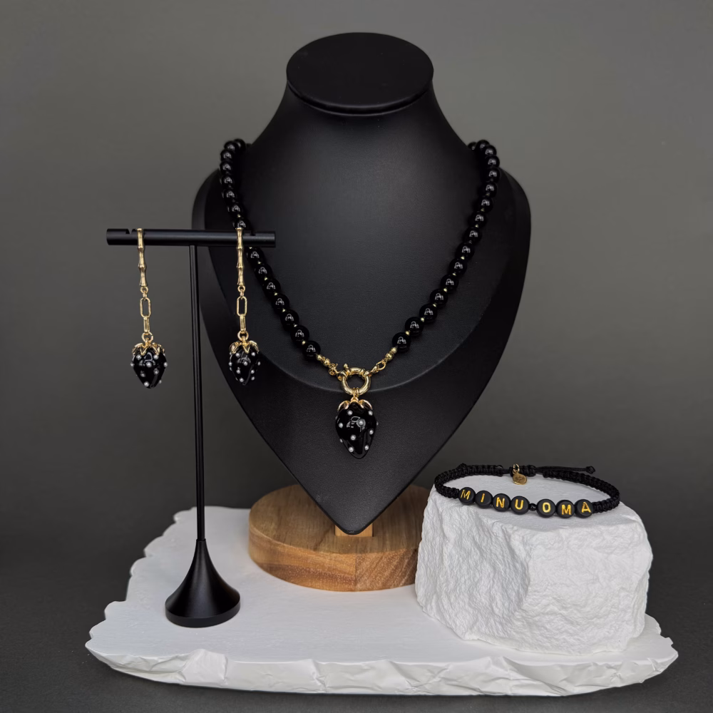 Tume, šikk ja kergelt mänguline ehetesett, millega ütled väga selgelt: see on minu inimene. Mustade helmestega kaelakee ja maasikakujulised kõrvarõngad loovad sensuaalse look’i, mida täiendab sõnumiga paelkäevõru “MINU OMA”. Täiuslik kingitus, kui tahad midagi enamat kui lihtsalt lilli ja šokolaadi.