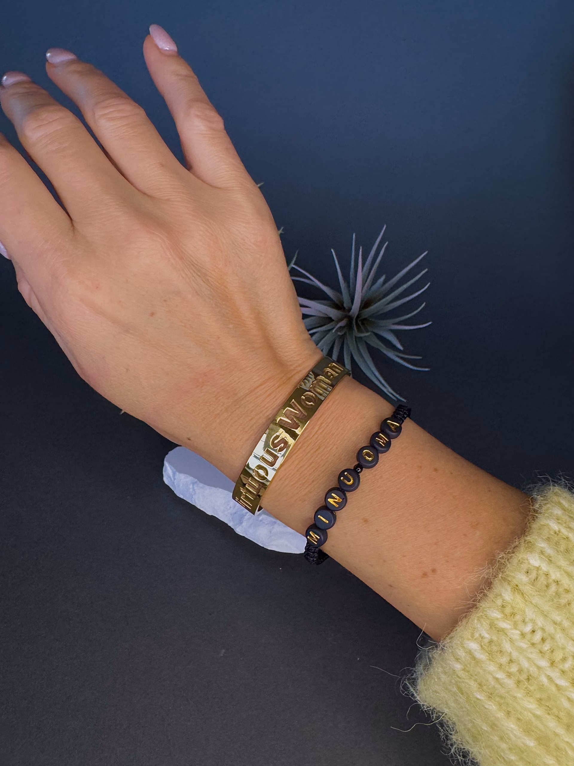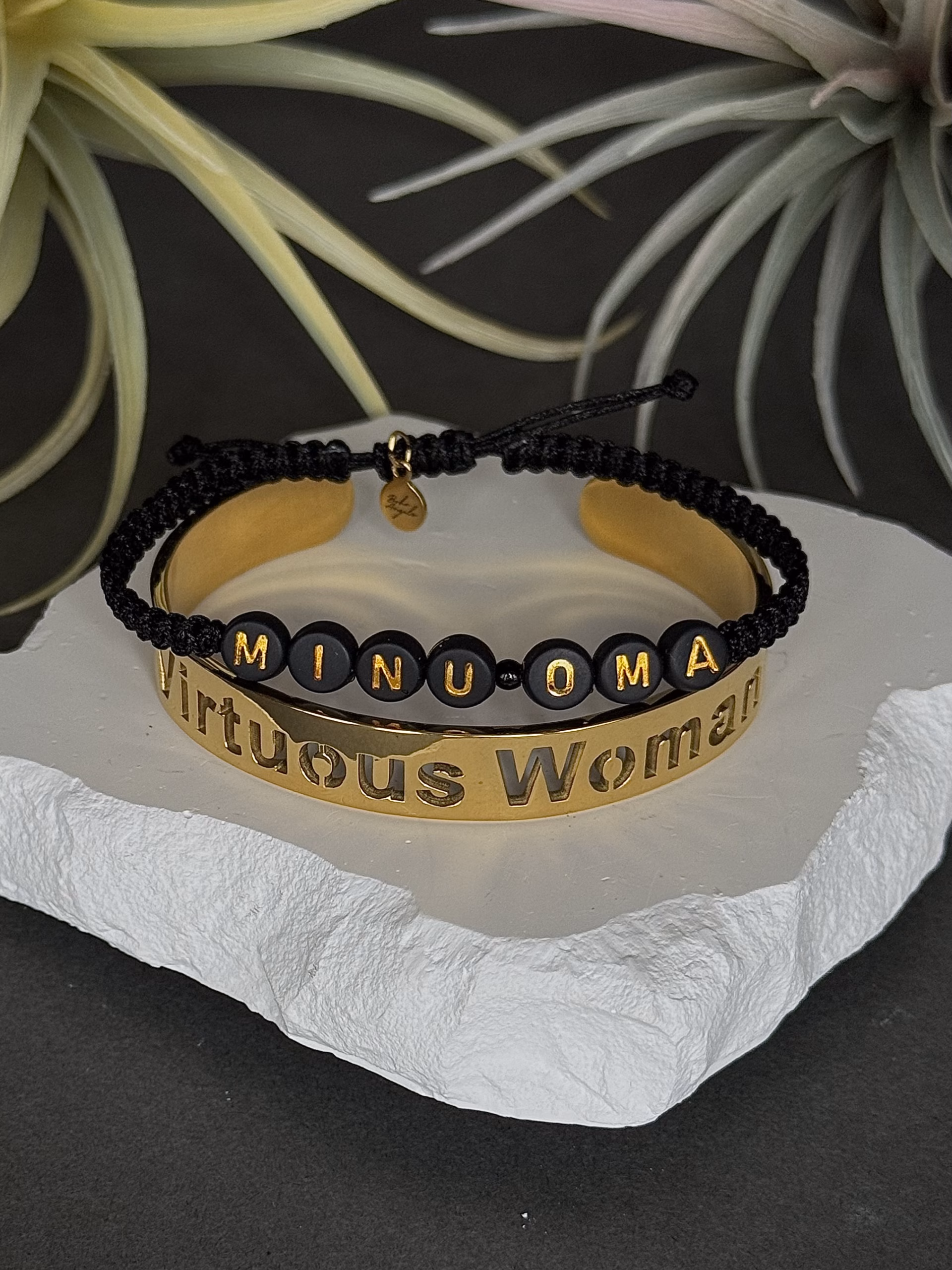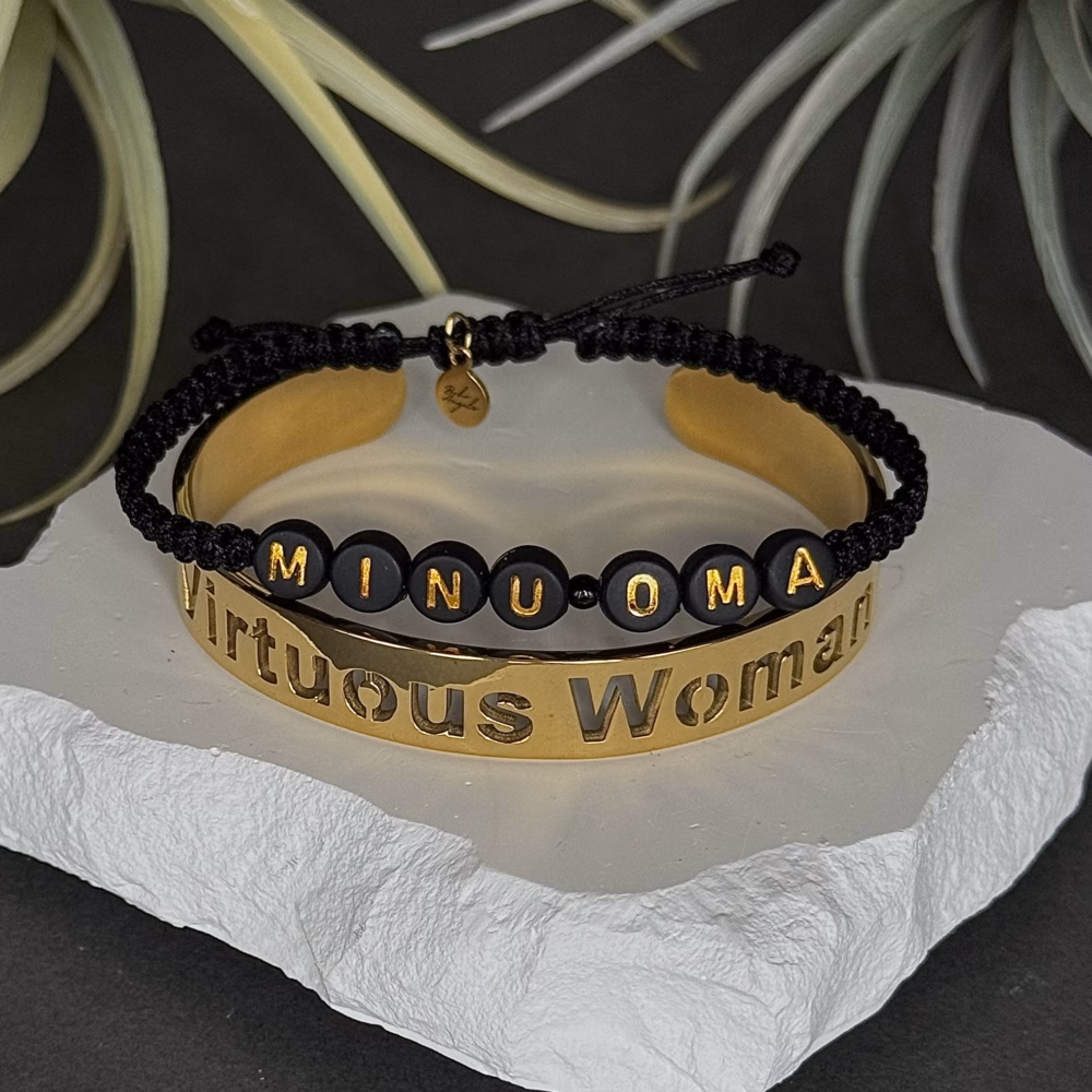 Kahe käeehte kooslus, mis räägib nii südamest kui eneseväärtusest. Musta paelaga “MINU OMA” käevõru ütleb, kellele süda kuulub, kuldne “Virtuous Woman” roostevabast terasest käevõru aga meenutab, milline naine ta ise on … väärtuslik, tark ja õrnalt enesekindel.