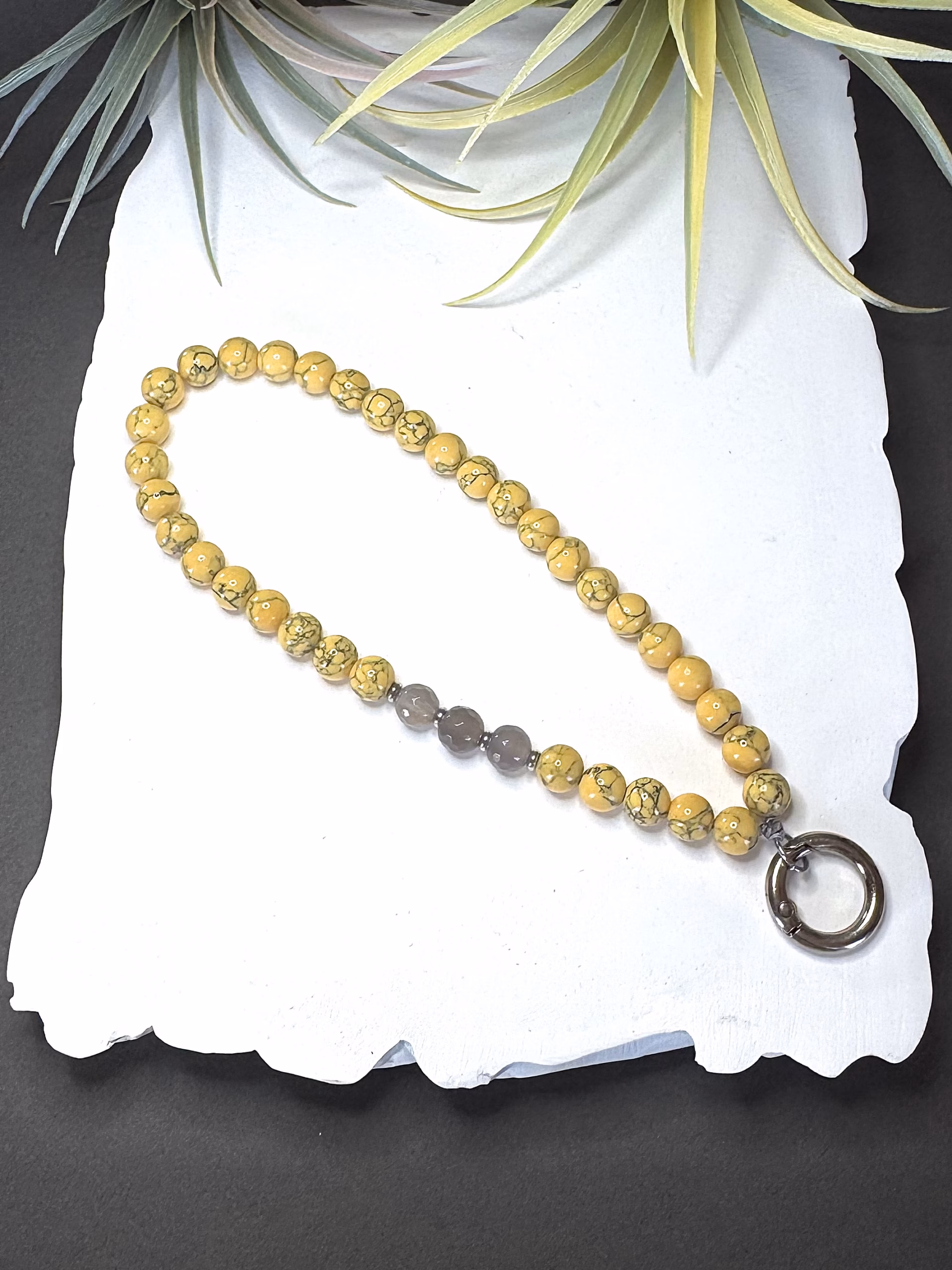 Soe kollakas toon ja looduslähedane mustrimäng teevad sellest telefonikeest pilkupüüdva, kuid samas mõnusalt rahuliku aksessuaari. Marmoreeritud kollased helmed koos hallikate detailidega loovad omanäolise koosluse, mis toob telefoni juurde veidi boho-võlu ja muudab selle kandmise palju mugavamaks.