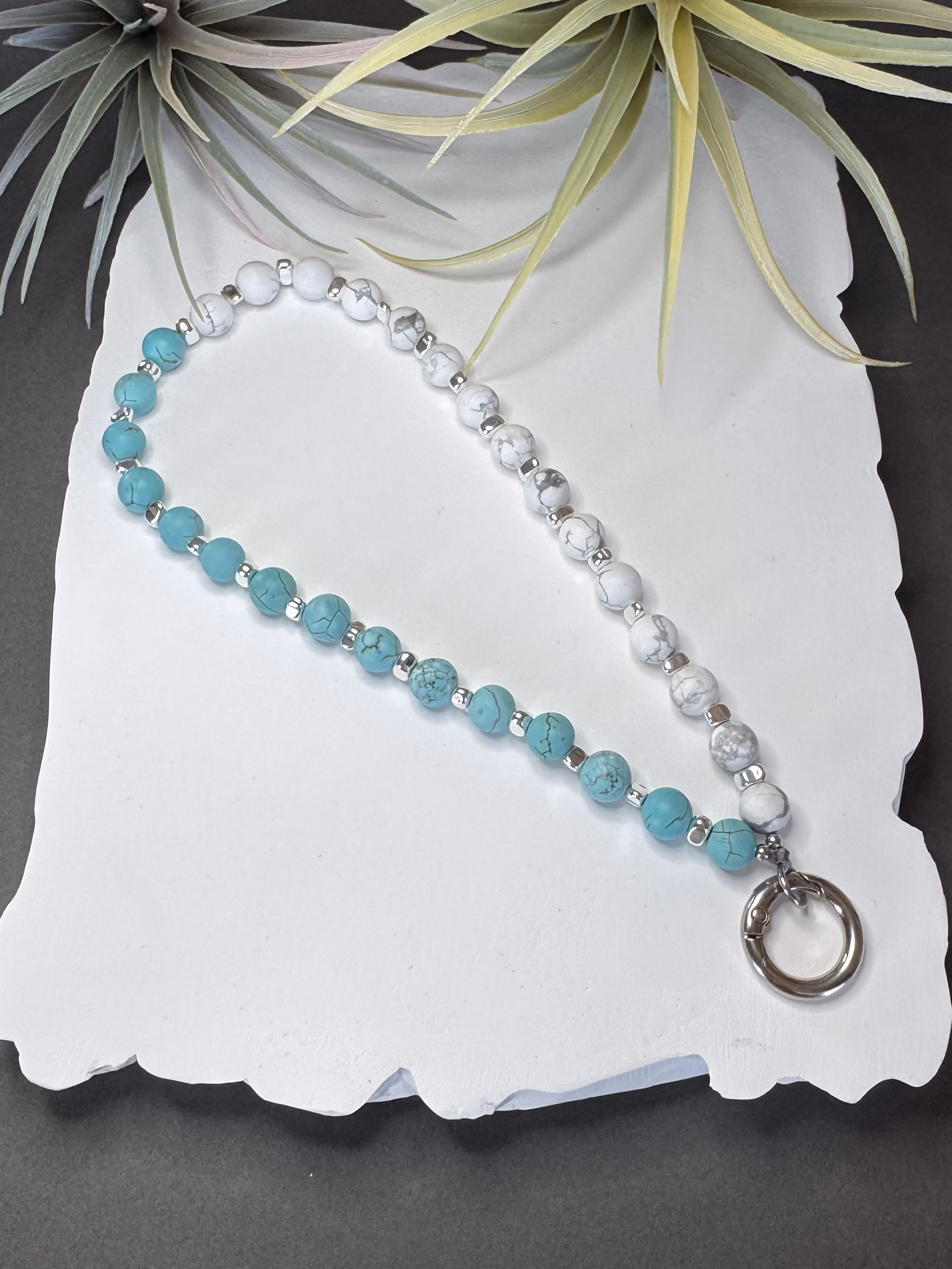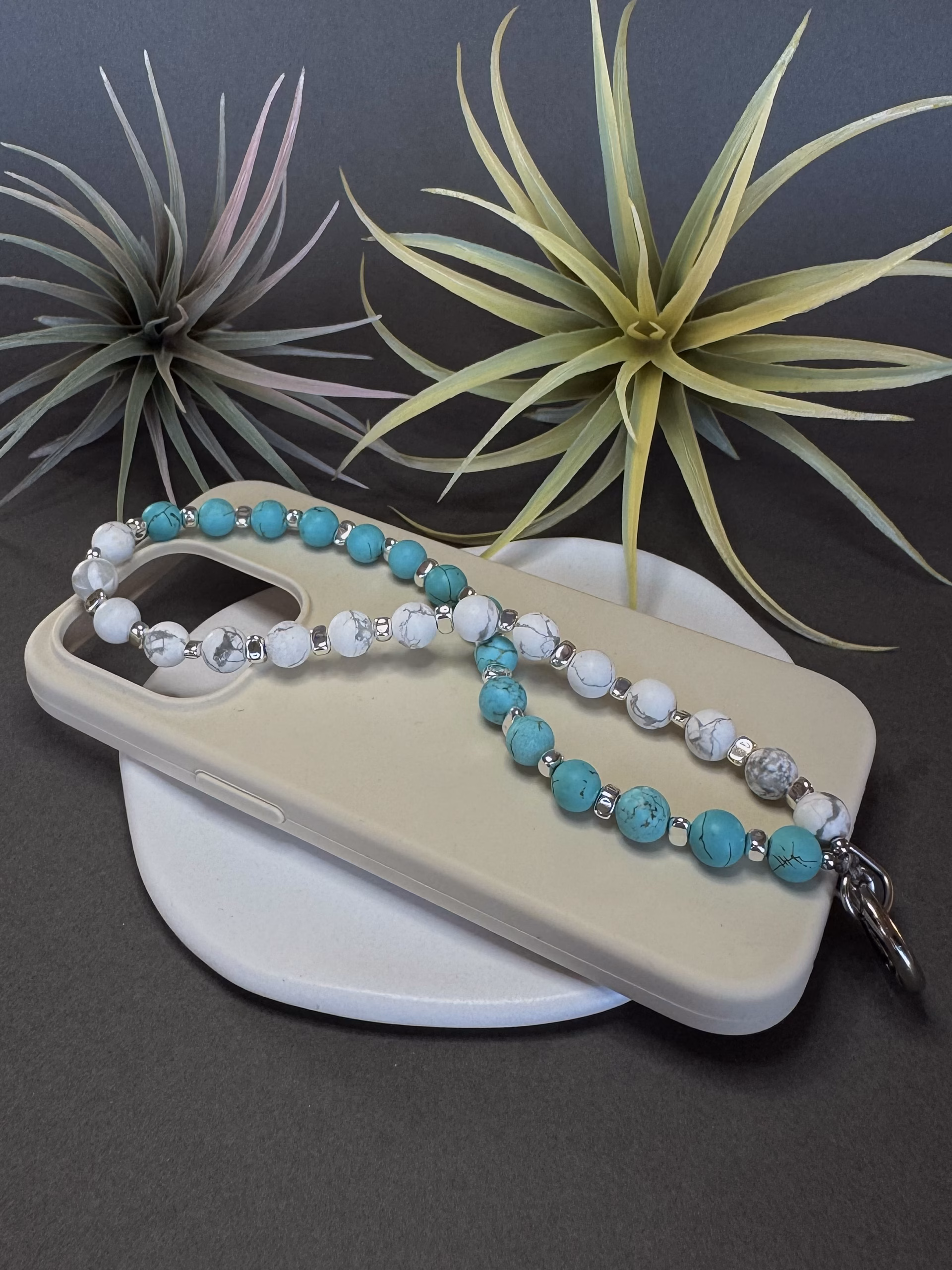 Värske ja pilkupüüdev telefonikee, kus türkiissinised ja valged marmormustriga helmed loovad merelise ning boho-hõngulise koosluse. Hõbedast tooni detailid lisavad puhta ja modernse viimistluse, muutes selle ühtaegu praktiliseks ja stiilseks aksessuaariks igasse päeva.