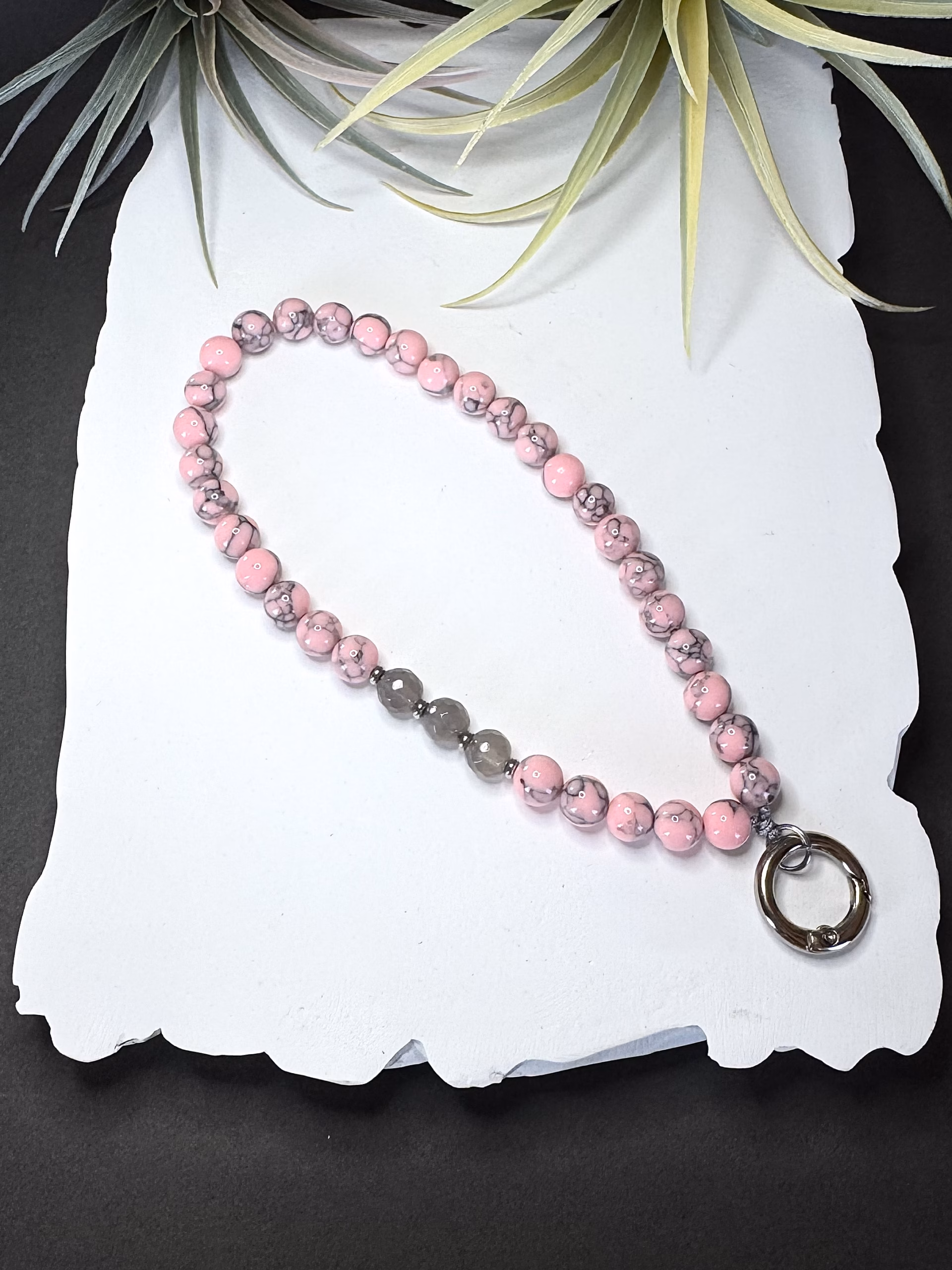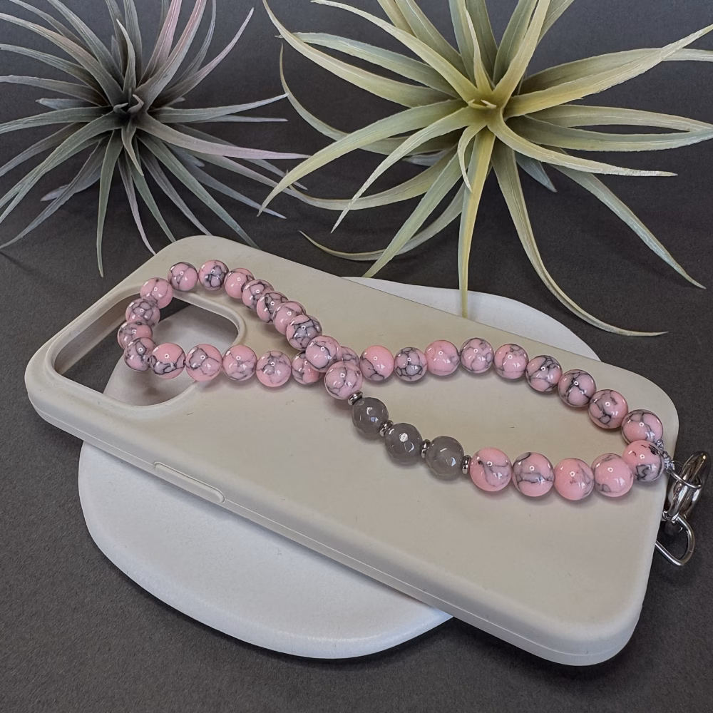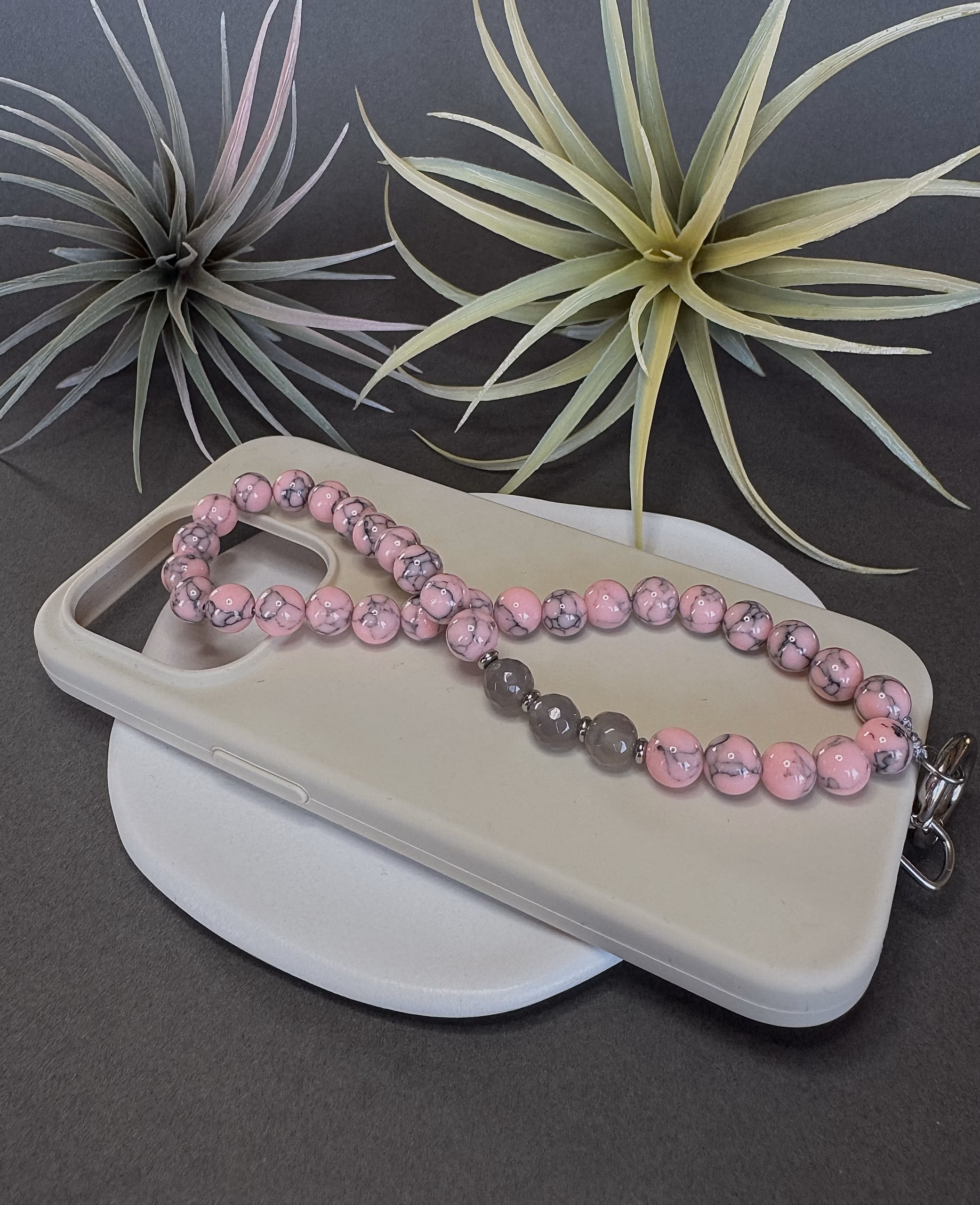 Õrnroosa ja marmormustriga telefonikee, mis lisab sinu telefonile pehme, naiseliku ja mängulise aktsendi. Roosade helmeste kooslus hallikate detailidega loob kauni tasakaalu – piisavalt efektne, et silma paista, kuid samas lihtne sobitada igapäevase stiiliga.