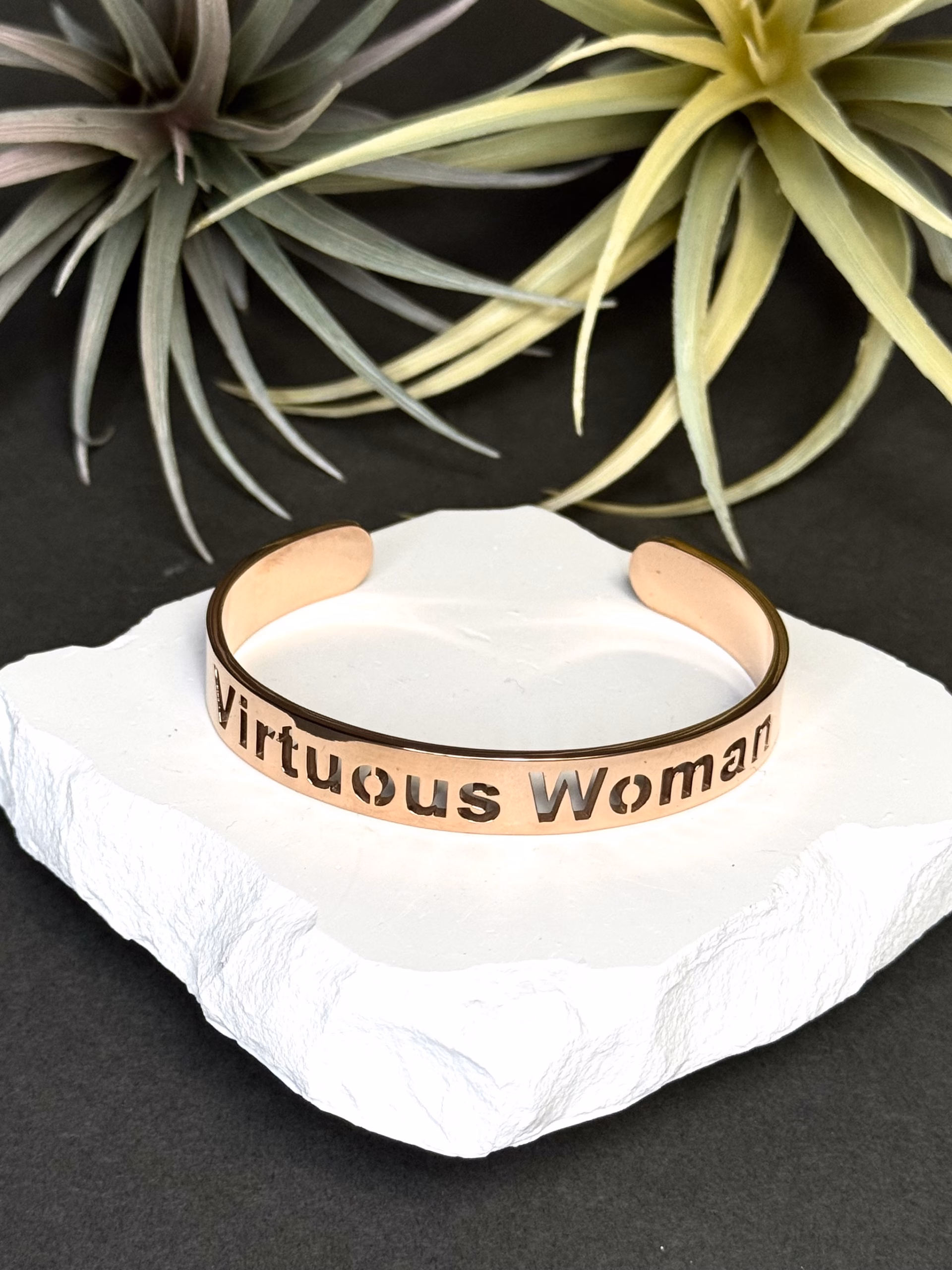 Õrn roosa kullatooniga roostevabast terasest käevõru naisele, kes elab kooskõlas oma väärtustega. Õhuke, kuid isikupärane ehe, millel kiri “Virtuous Woman” – vaikne, kuid väga selge sõnum, mida kannad endaga igal sammul.