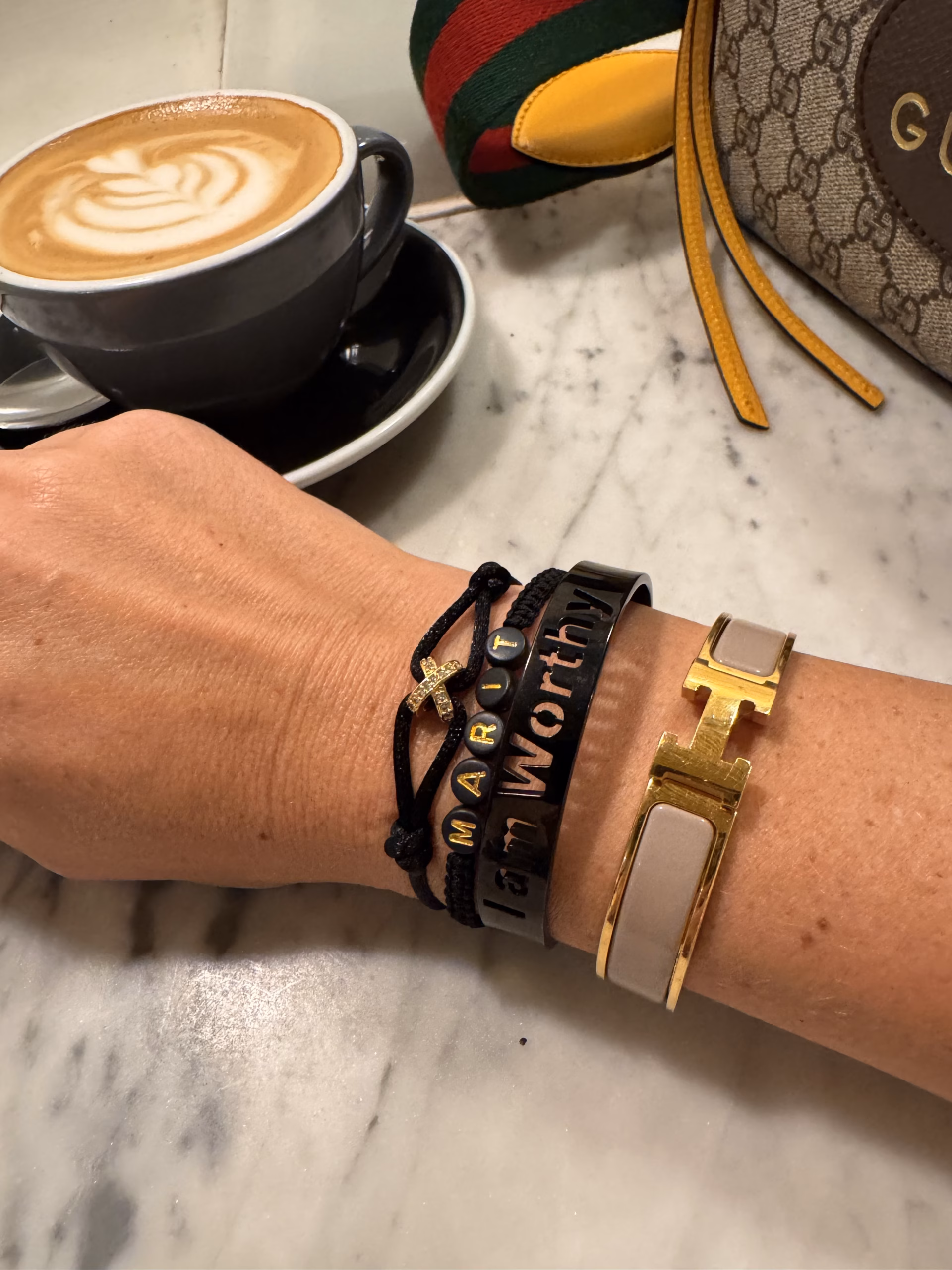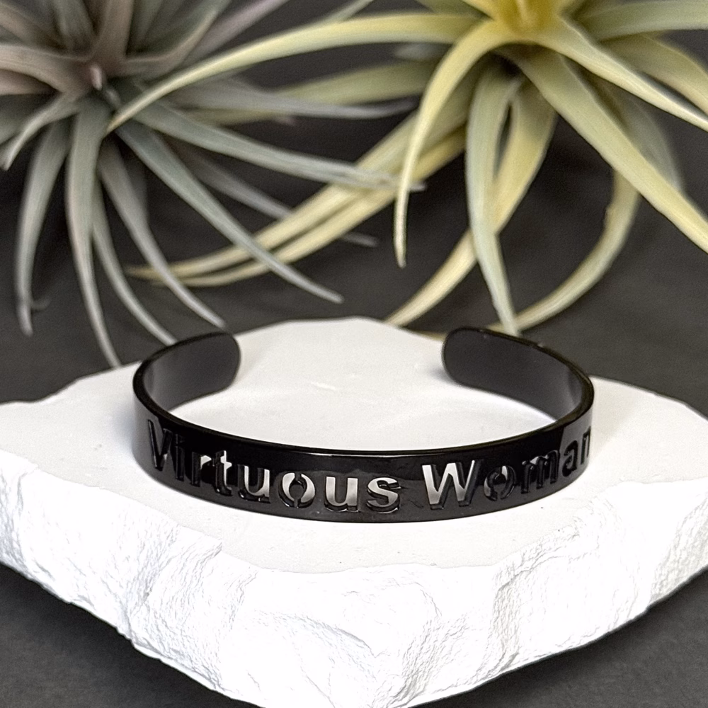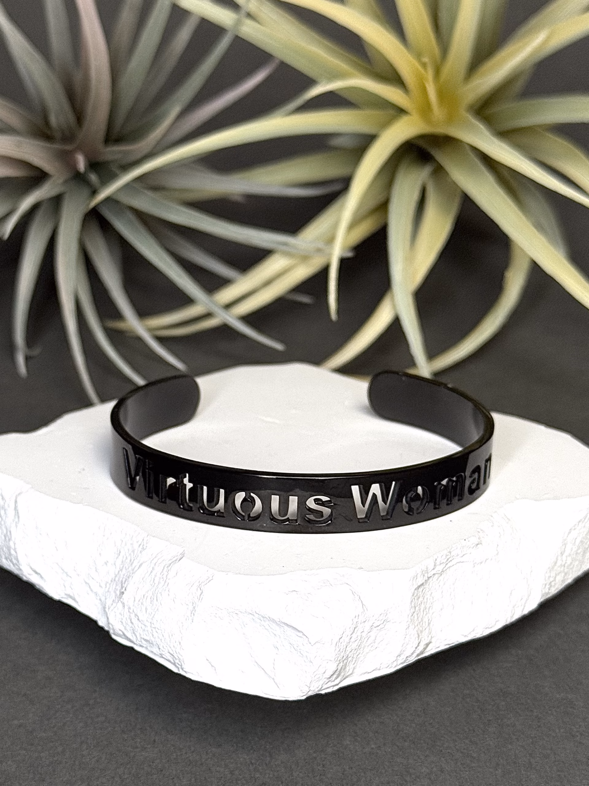 Mustast roostevabast terasest käevõru naisele, kes elab kooskõlas oma väärtustega. Õhuke, kuid isikupärane ehe, millel kiri “Virtuous Woman” … vaikne, kuid väga selge sõnum, mida kannad endaga igal sammul.